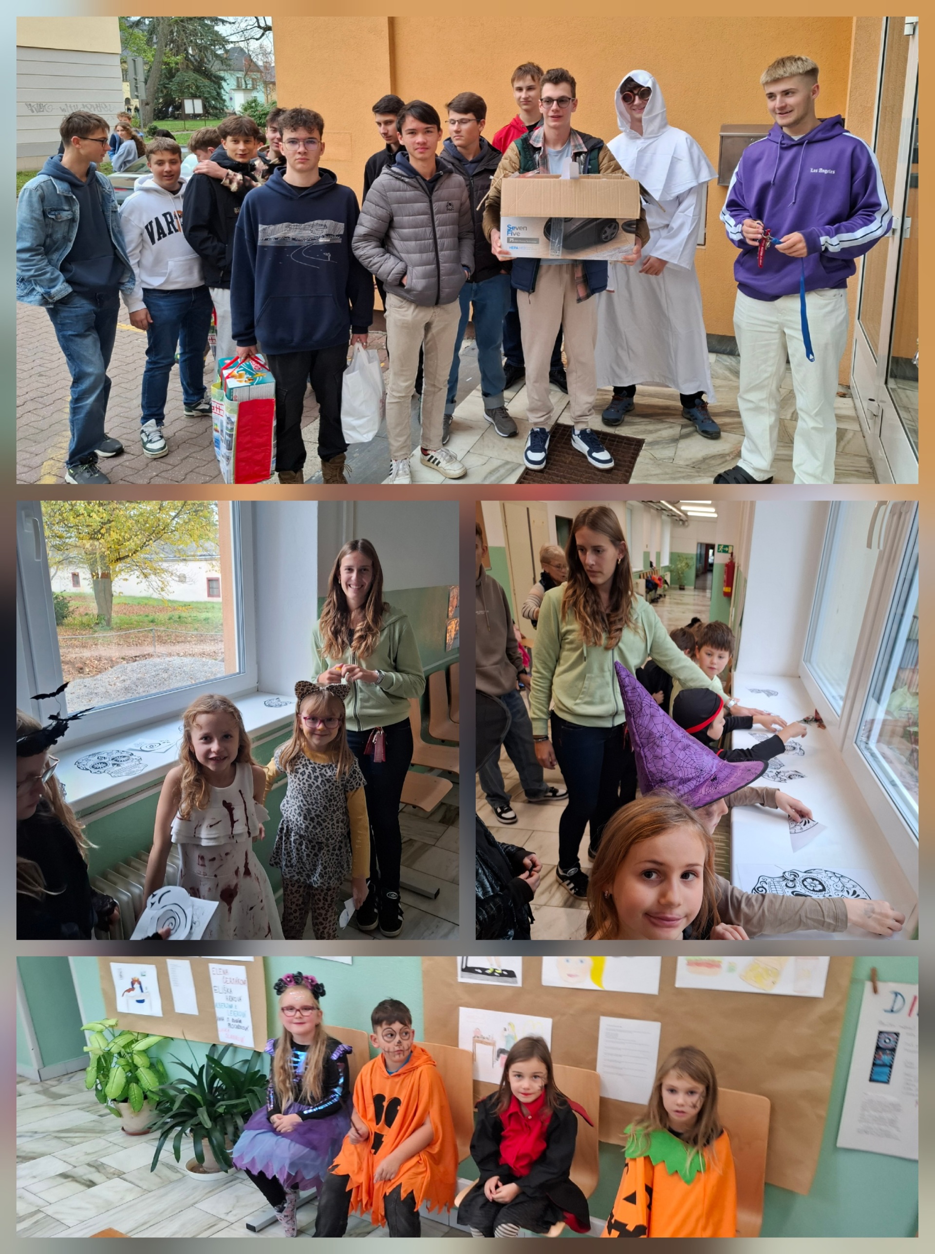 Pro děti z ŠD ZŠ Palackého jsme měli připraveno 12 stanovišť s různými aktivitami. S vychovatelkami z ŠD dorazilo 80 dětí a velká většina na sobě měla kostýmy k tématu. Do akce se zapojilo 43 žáků z GaLOŠ, kteří buď byli pro děti "průvodci" po jednotlivých stanovištích a nebo přímo na stanovišti dětem vysvětlovali danou aktivitu a motivovali je k plnění úkolů. Celkově panovala dobrá a uvolněná atmosféra. Děti projevovaly své nadšení a elán do plnění úkolů. Na závěr při odchodu dostaly odměnu a odcházely spokojené a s úsměvem. A my jsme měli radost z jejich radosti :-).