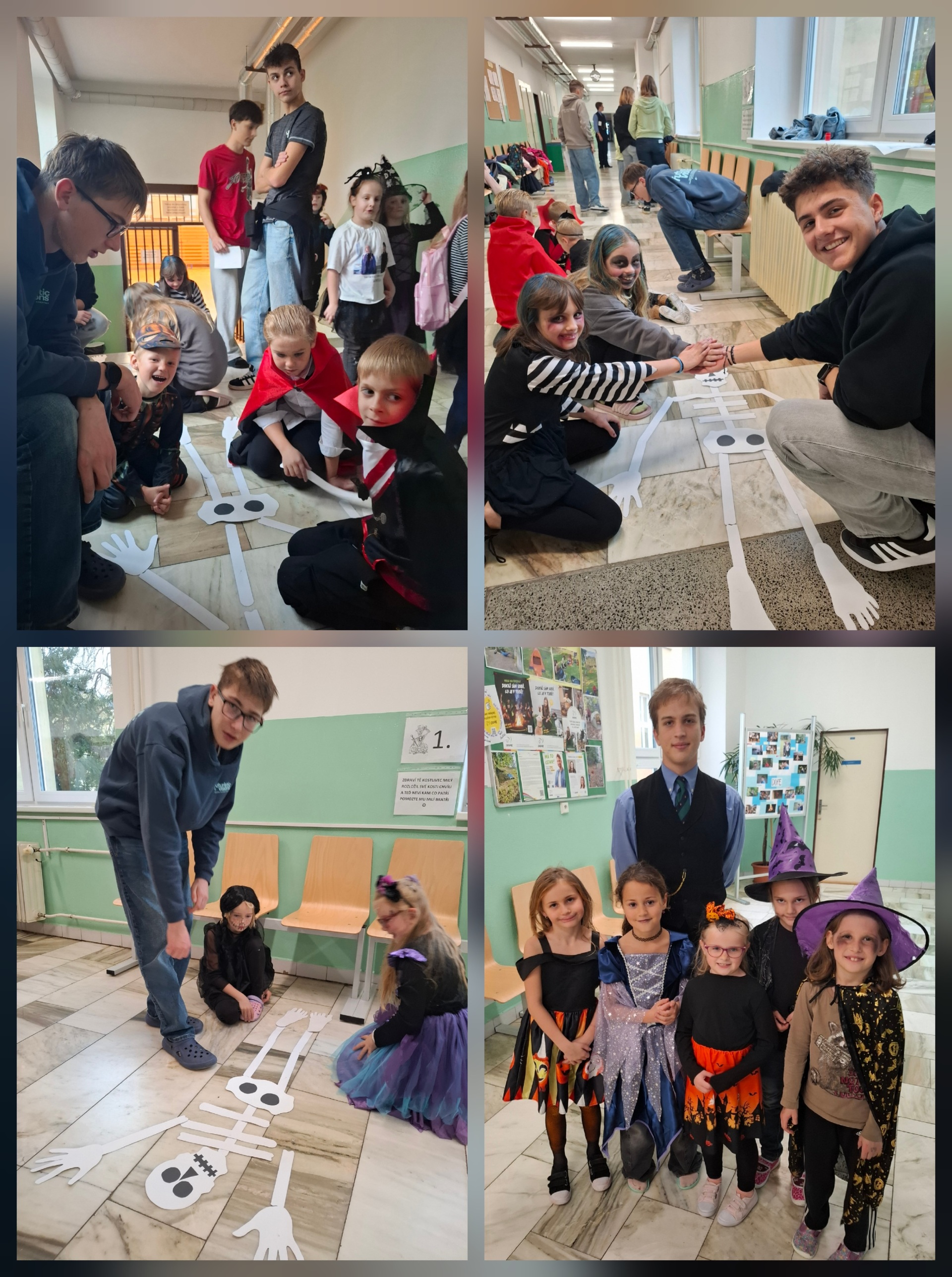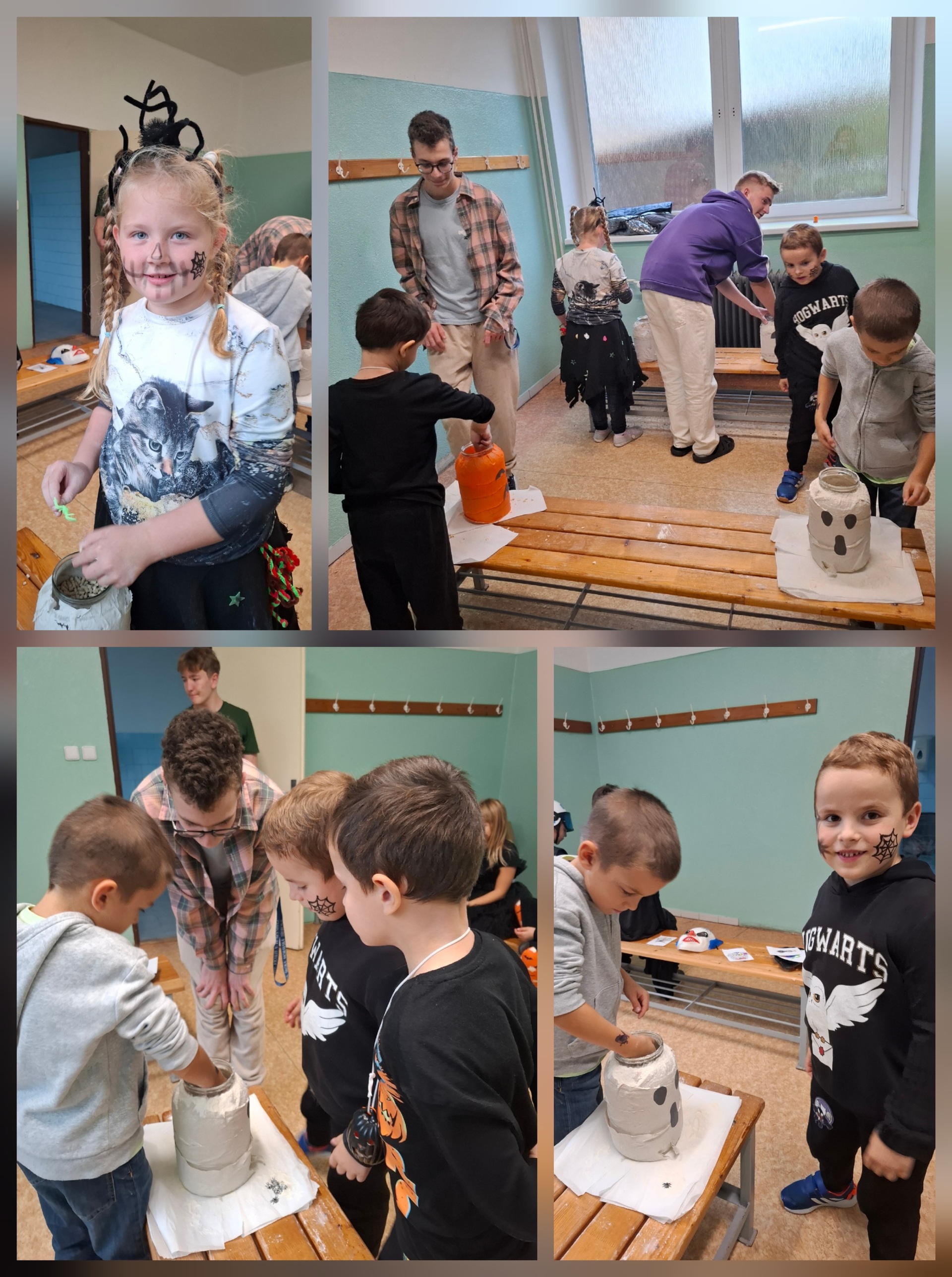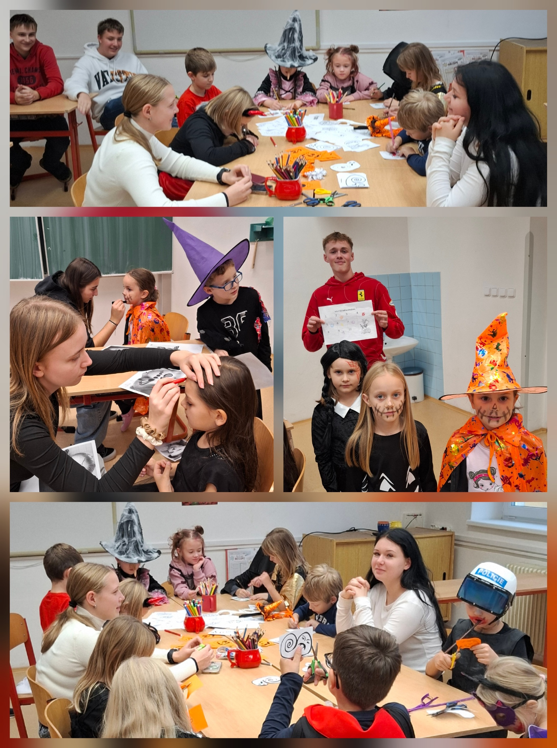 Ještě s halloweenskou tématikou jsme si pro děti ze školní družiny připravili na odpolední aktivitu deset zábavných stanovišť. Děti například skládaly kostlivce a lebky, ze sklenis lovily hada, pavouky, myši a jinou "havěť, "létaly" na koštěti, trefovaly se do branky s pavouky, zkusily si pavoučí závody popoháněné vlastním dechem, vyráběly zápichy do květináčů a ty co chtěly, odcházely ozdobené strašidelnými malůvkami na obličej.