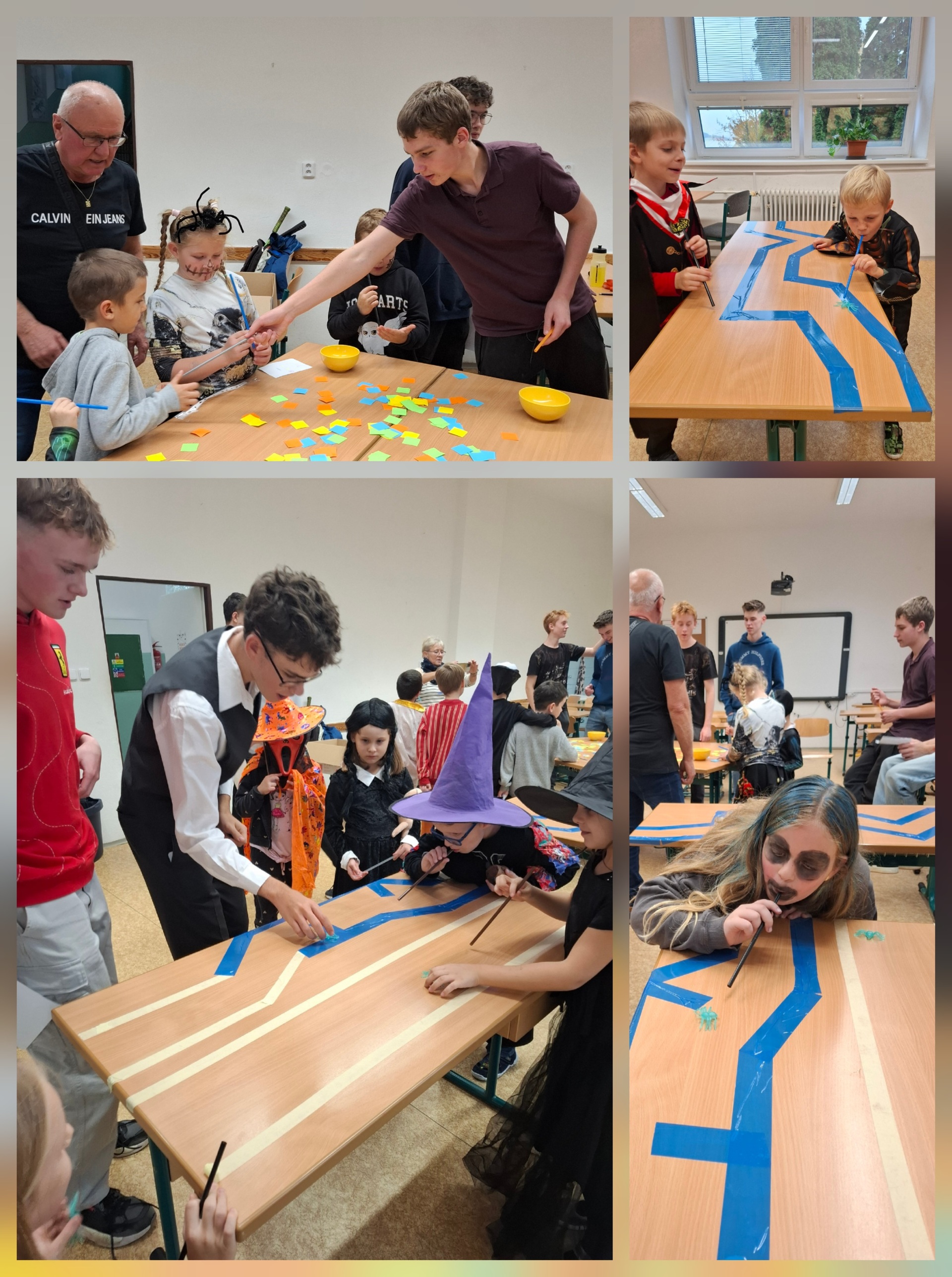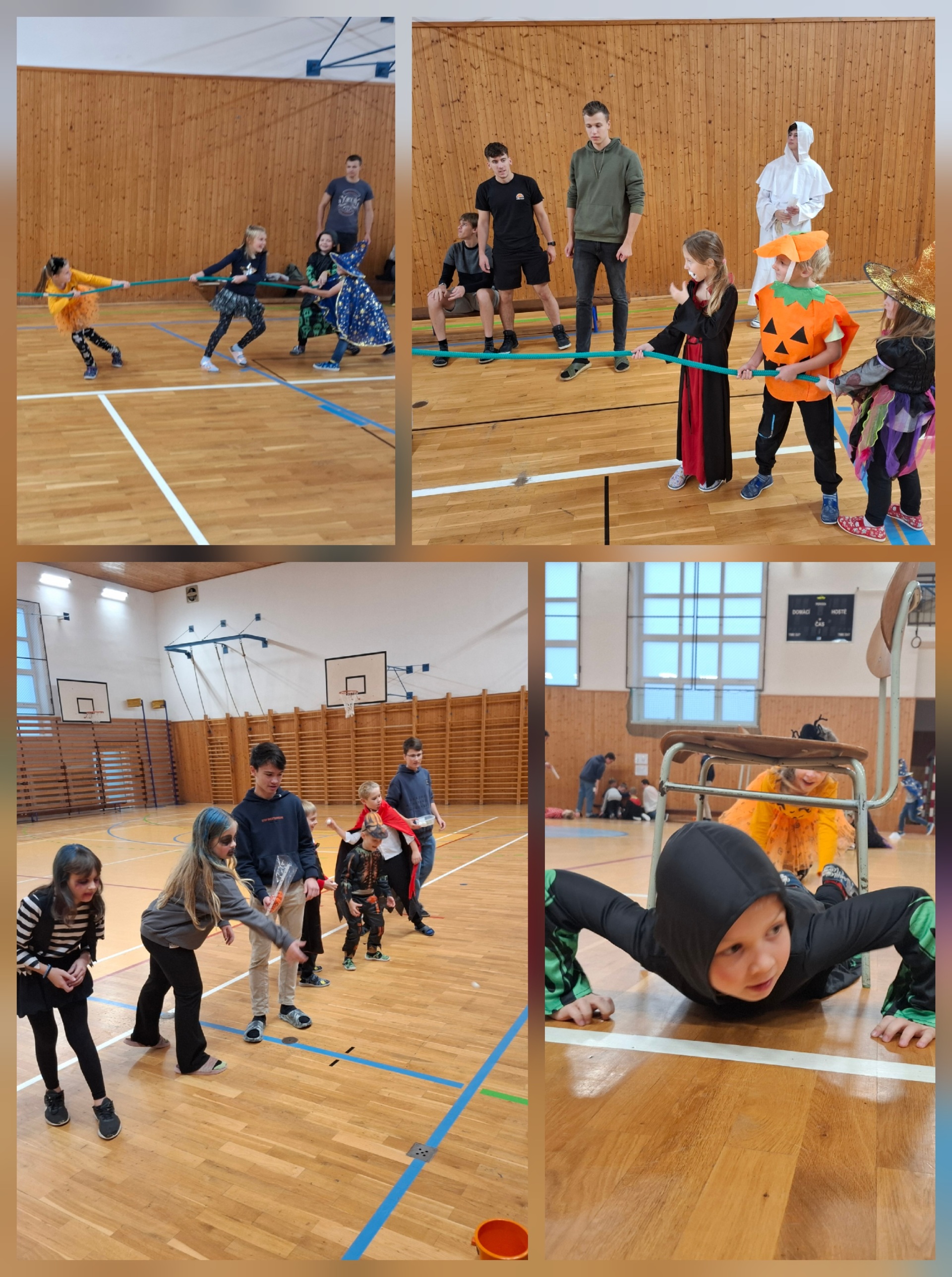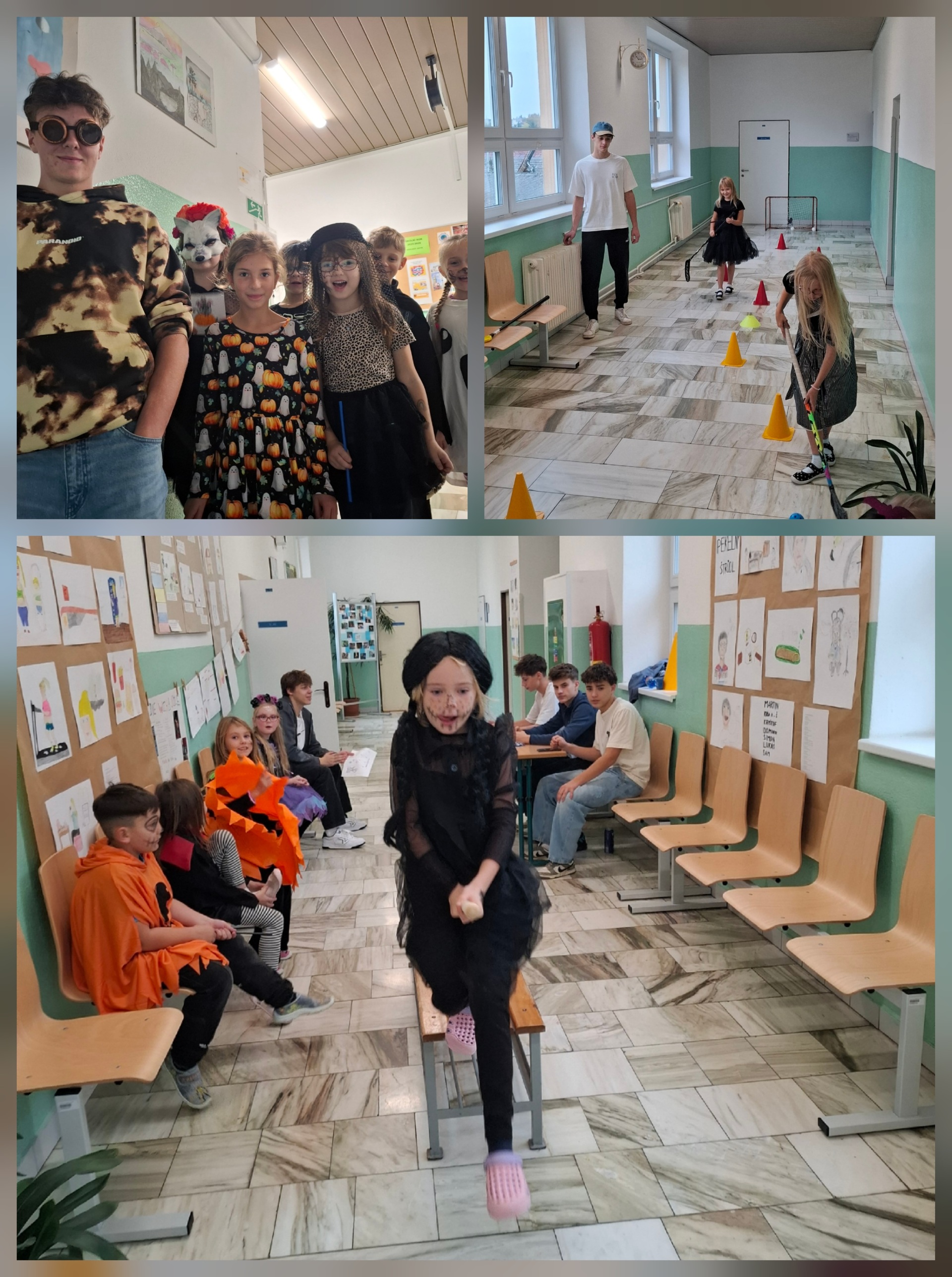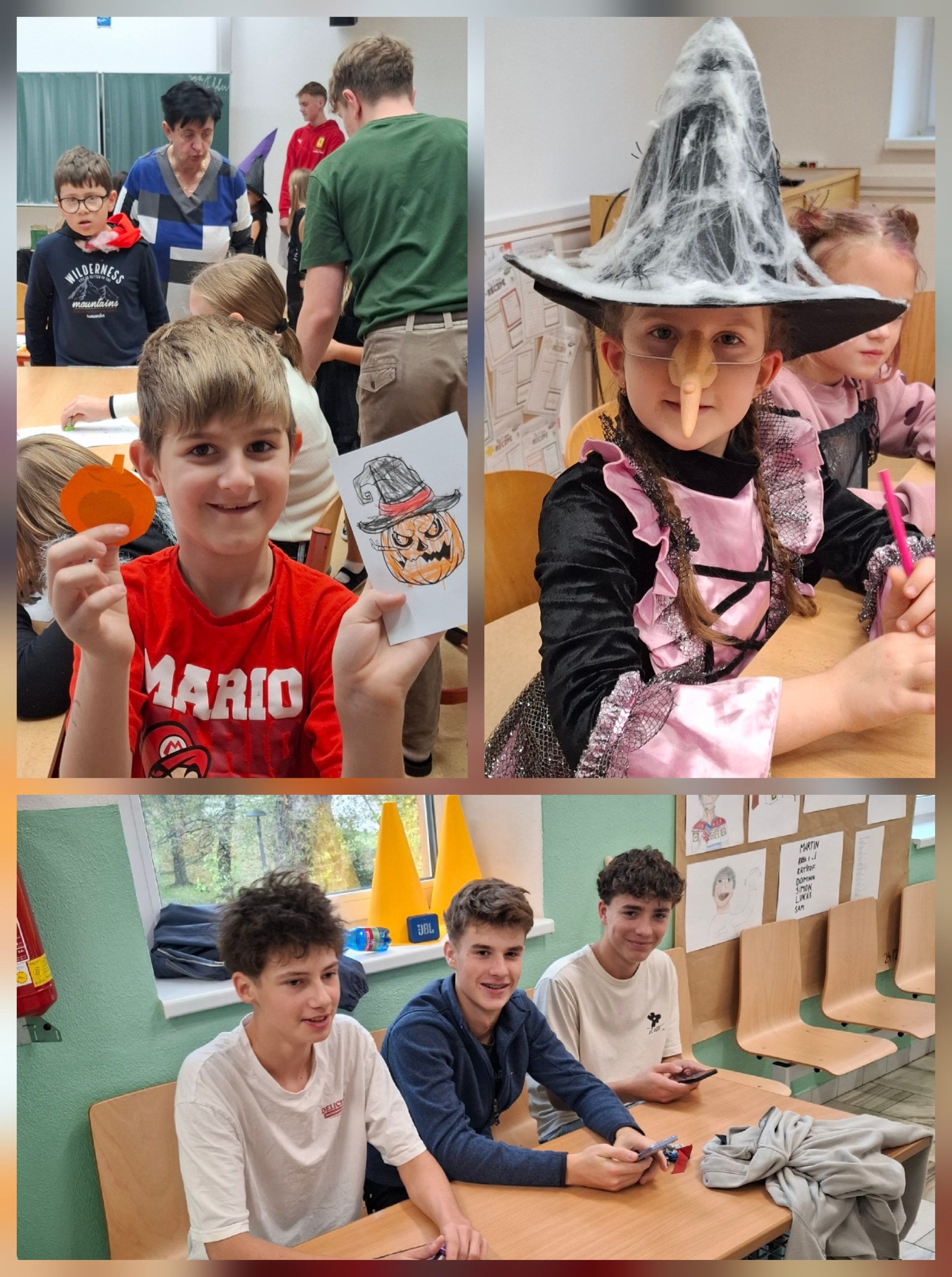 Ještě s halloweenskou tématikou jsme si pro děti ze školní družiny připravili na odpolední aktivitu deset zábavných stanovišť. Děti například skládaly kostlivce a lebky, ze sklenis lovily hada, pavouky, myši a jinou "havěť, "létaly" na koštěti, trefovaly se do branky s pavouky, zkusily si pavoučí závody popoháněné vlastním dechem, vyráběly zápichy do květináčů a ty co chtěly, odcházely ozdobené strašidelnými malůvkami na obličej.