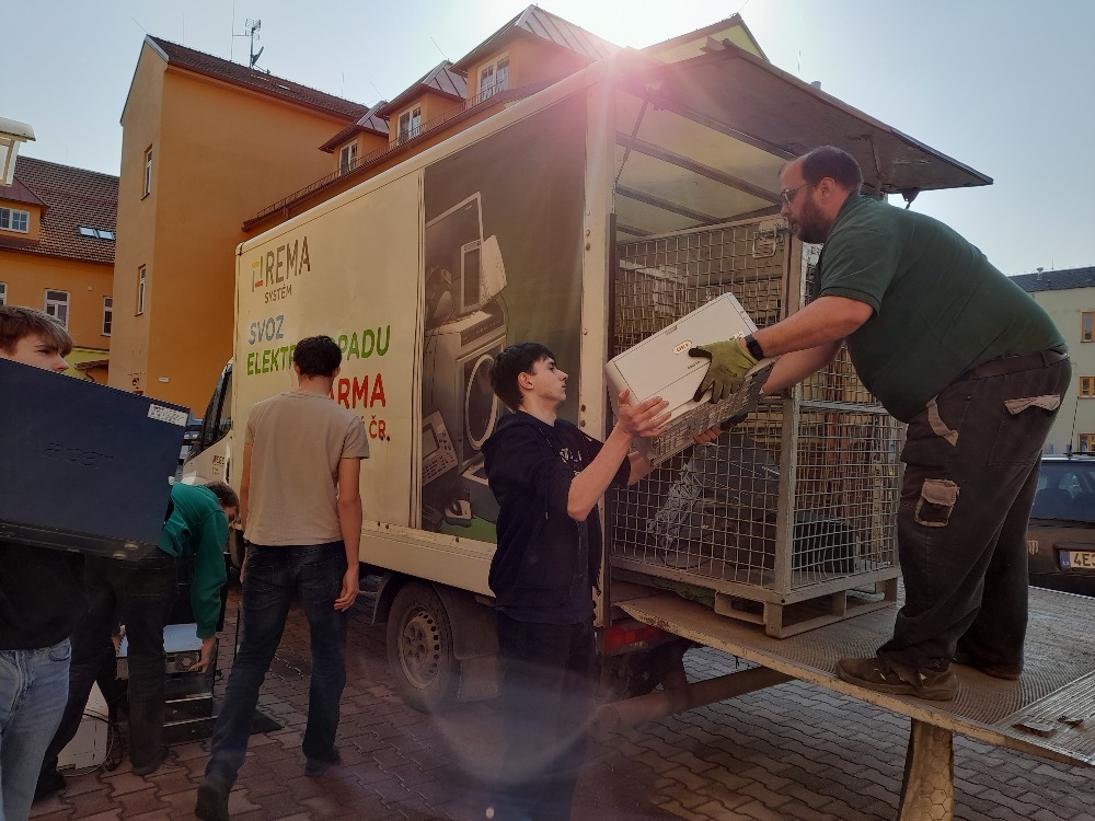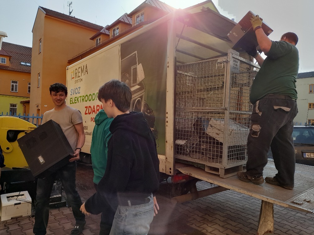 Chlapci z 1. L během 8 minut připravili k odvozu 300 kg elektroodpadu. Děkujeme.