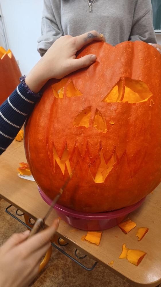 Děkujeme panu učiteli za cenné rady a za to, že umožnil výrobu halloweenských dýní během hodin výtvarné výchovy. Fotografie pořídila Elena, žákyně 3. AV.