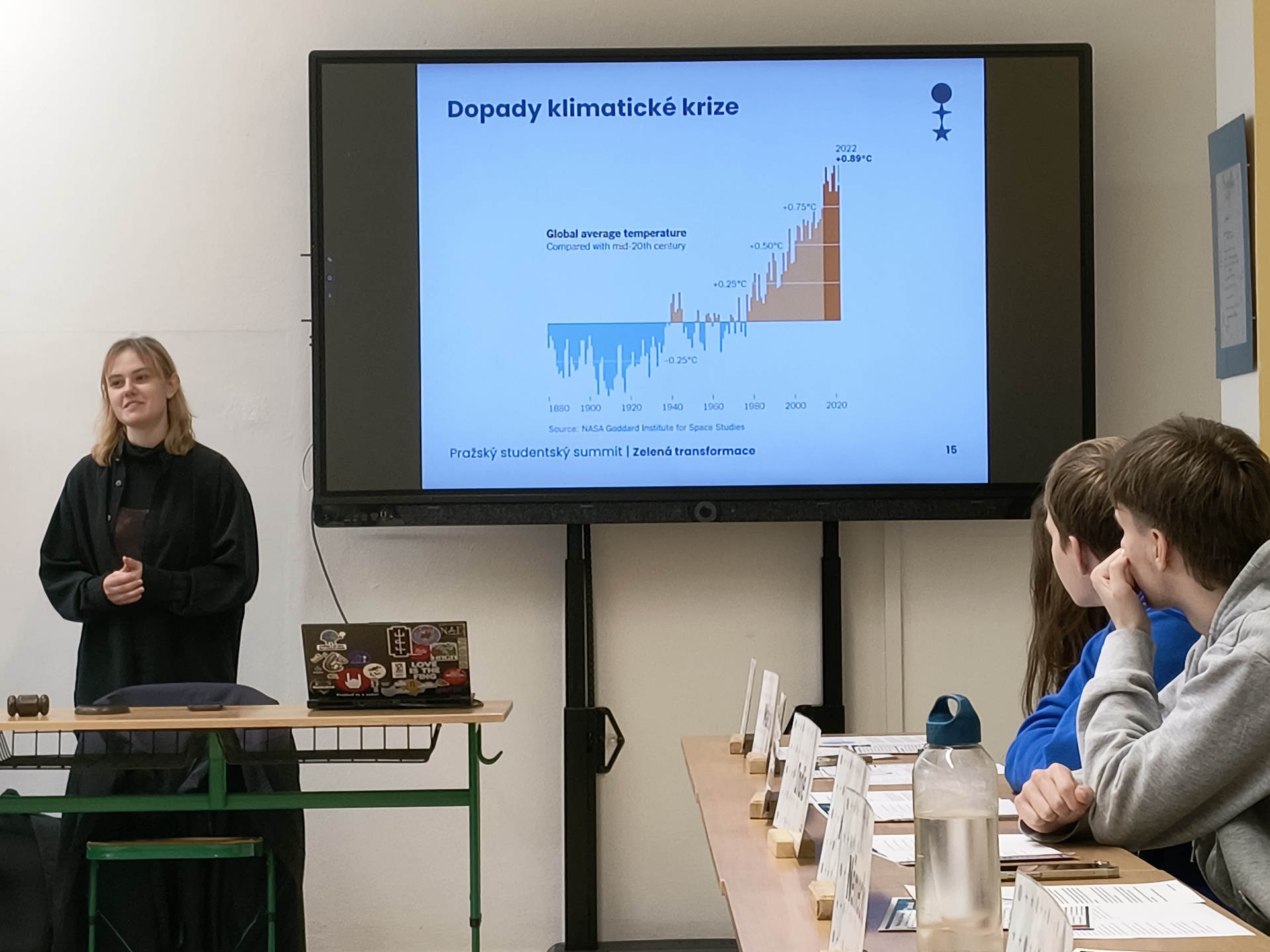 Co si žáci odnesli? Zkušenost s argumentací a hledáním konsenzu v reálném tlaku, hlubší vhled do problematiky zelené transformace a klimatické politiky a přehled o tom, jak složité je koordinovat globální reakci na globální hrozbu. A pro zájemce se nabízí cesta přímo na akce Pražského studentského summitu v Praze.
