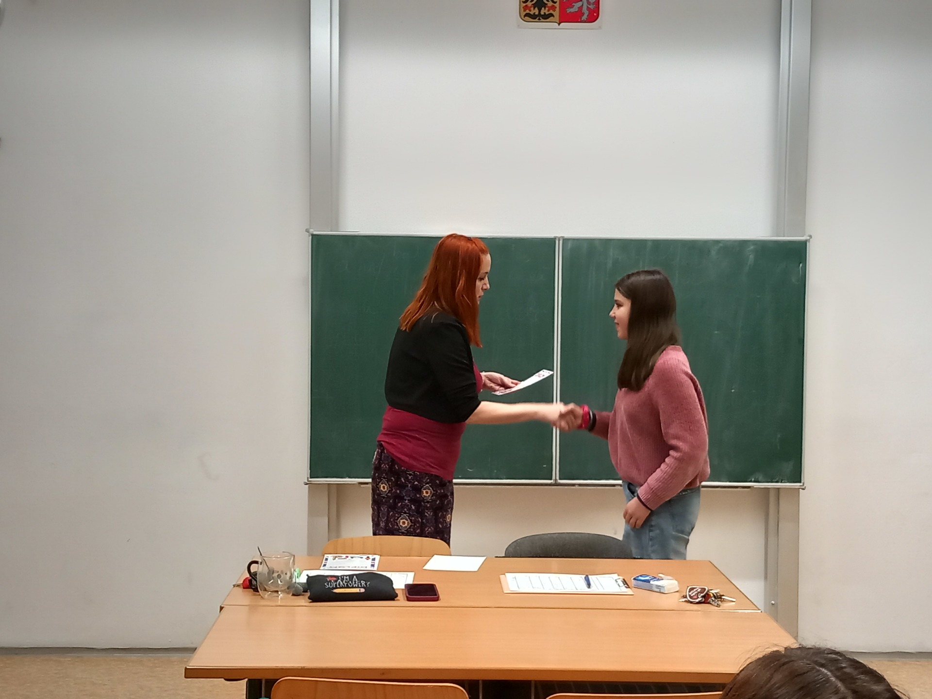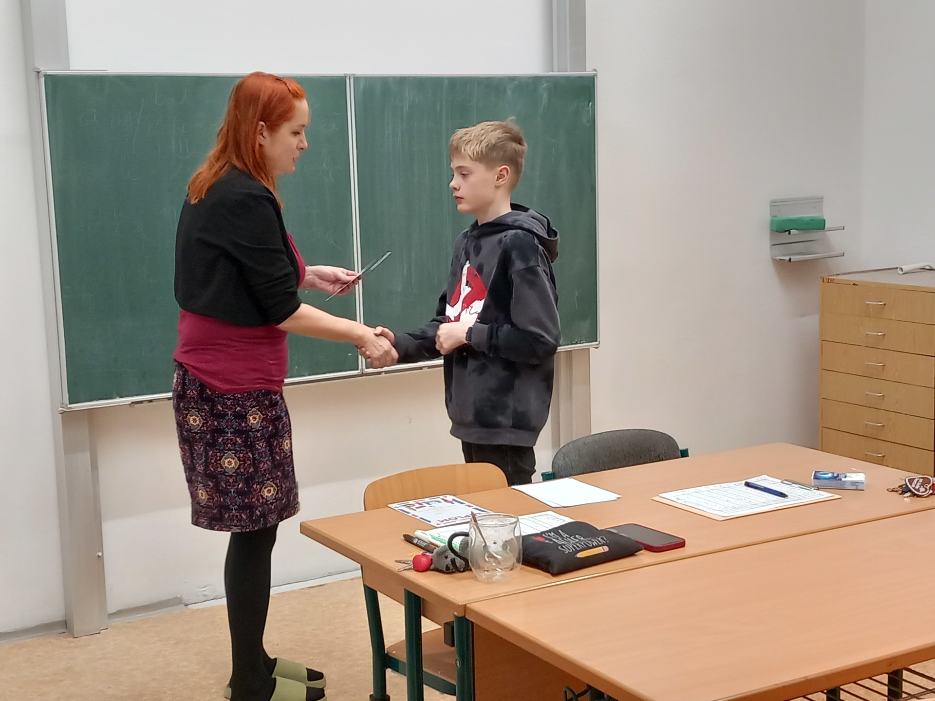 Školní kolo se konalo ve čtvrtek 5. 2. 2026 a zapojilo se do něj 9 žáků a žákyň primy a sekundy. Soutěžící předvedli velmi vyrovnané a často skvělé výkony – zvládli poslech, gramatiku, samostatný mluvený projev na zadané téma, popis obrázků i pohotovou komunikaci se zkoušejícími. Rozhodování o vítězích proto nebylo vůbec jednoduché, rozdíly mezi jednotlivými místy byly minimální.