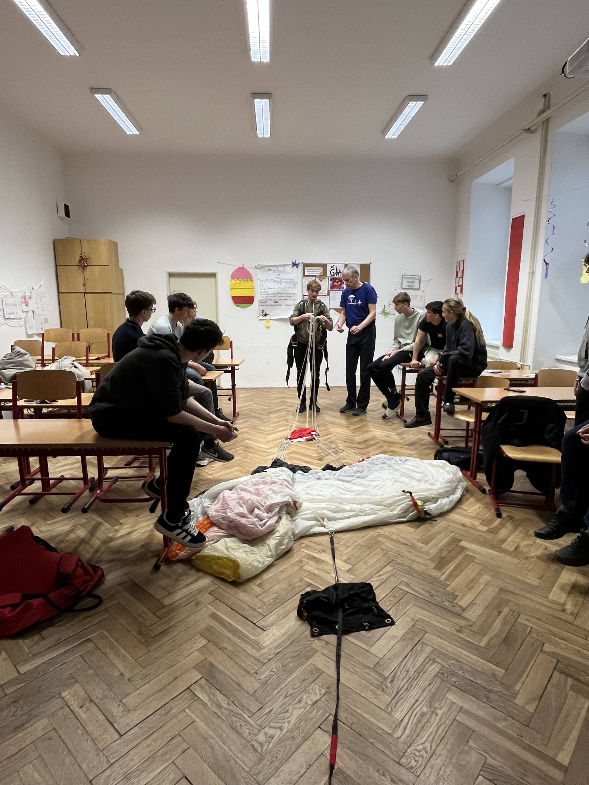 Již po šesté se naši studenti začali připravovat na výskok z letadle. Oproti loňským rokům jsme letos, kromě začátečníků, otevřeli i skupinu pro pokročilé. Základní kurz pro začátečníky tradičně pod vedením zkušeného instruktora Jirky Blašky a pokročilých se nově ujal Tonda Karásek. Začátečníky ještě čeká kus práce, než z letadla budou moci vyskočit, ale pokročilí by se měli do vzduchu dostat co nejdříve.