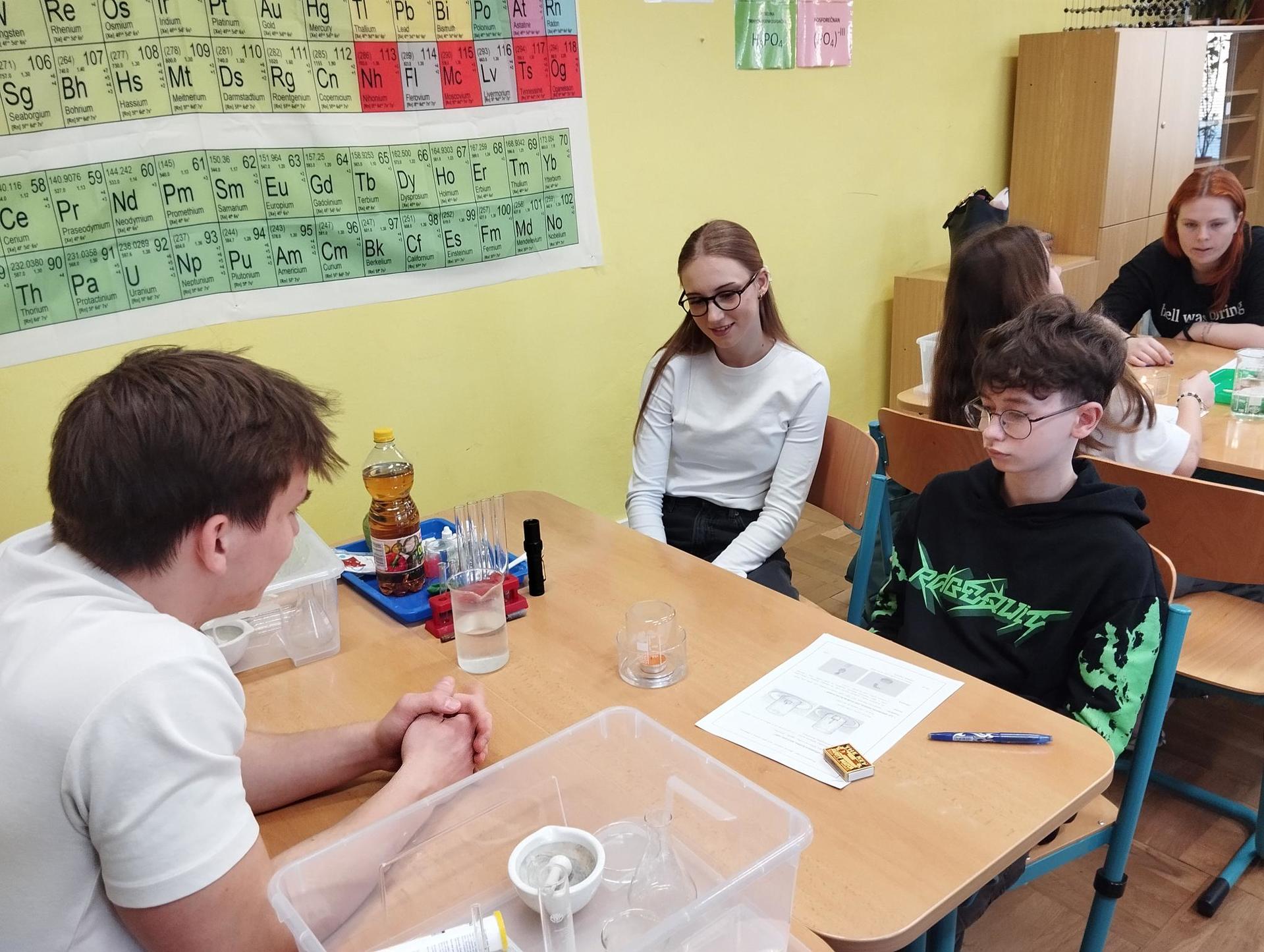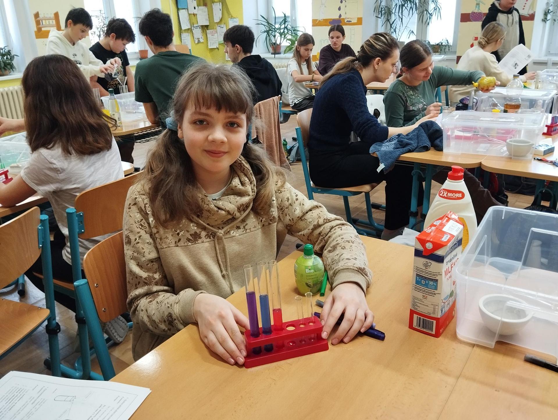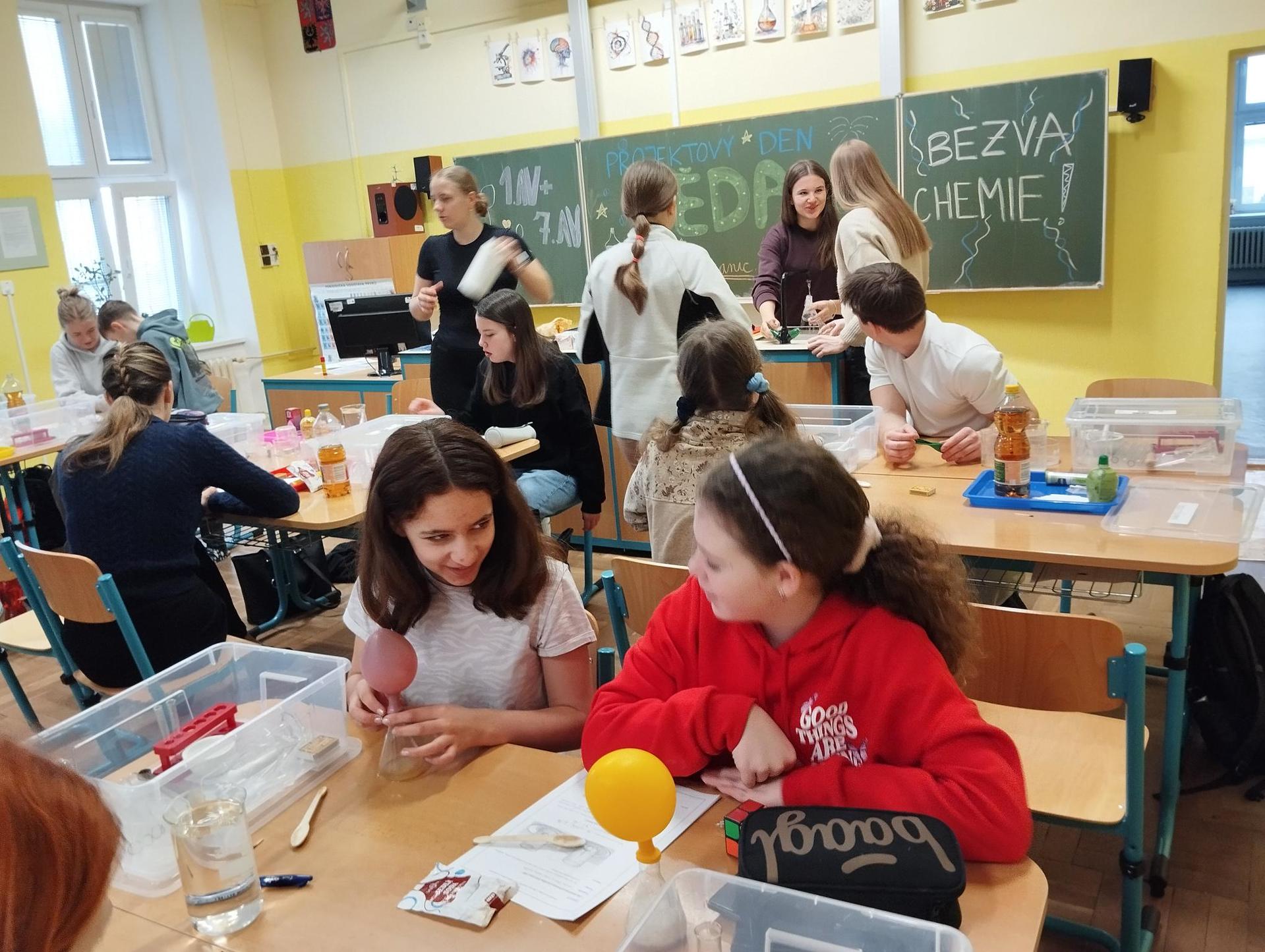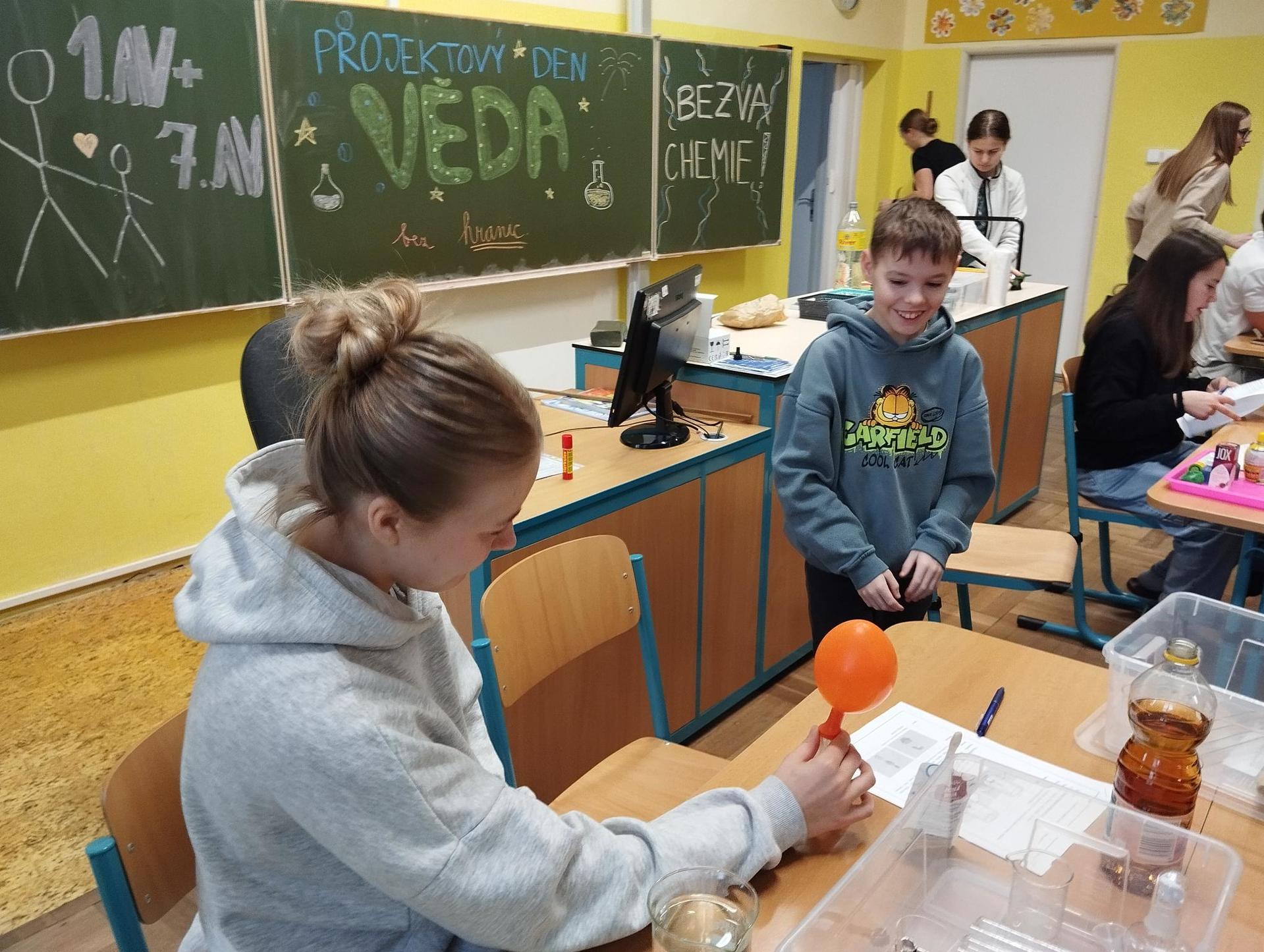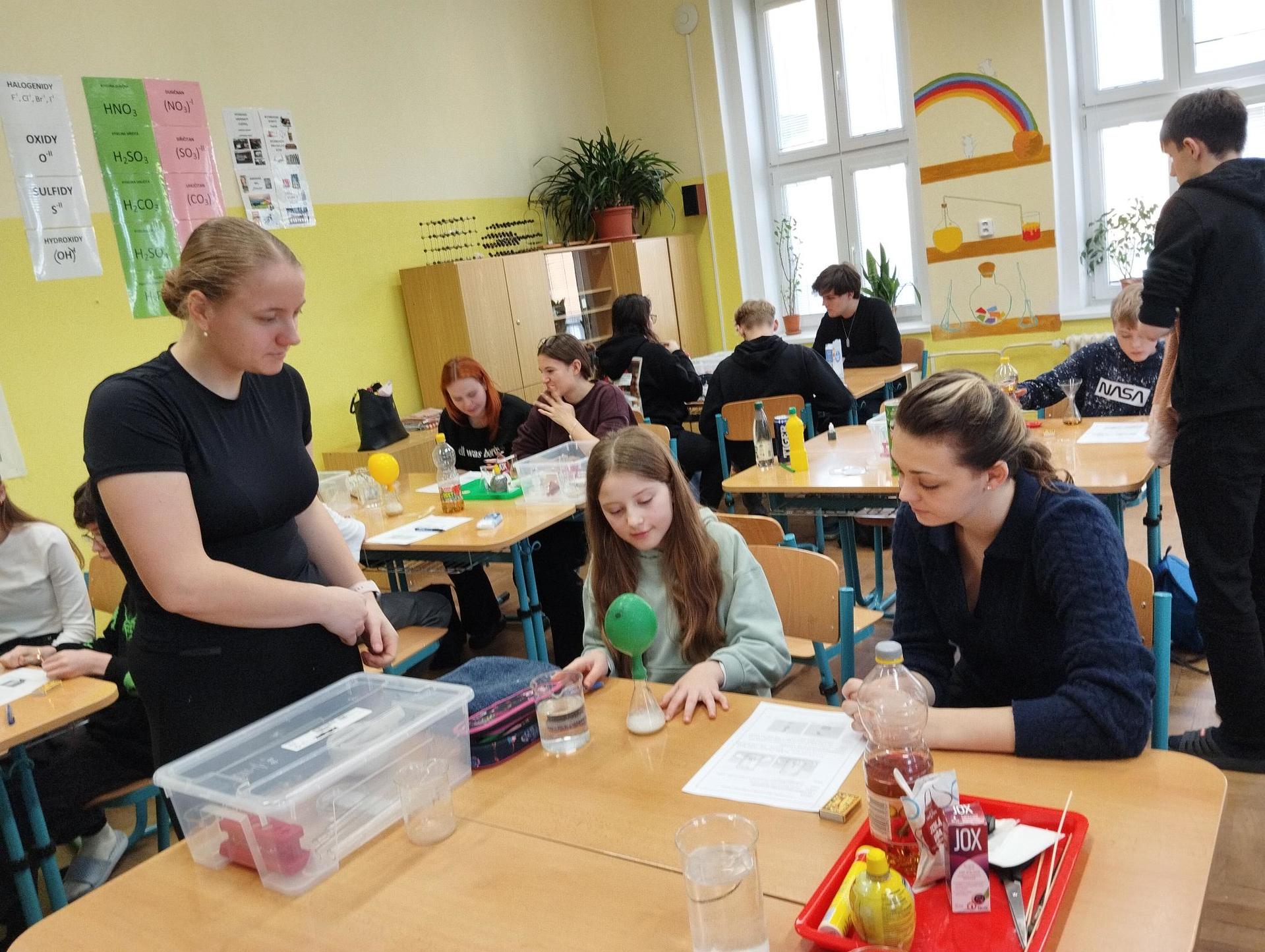 Žáci primy prováděli jednoduché experimenty pod vedením žáků septimy. Společná činnost mladších a starších žáků přinesla nová přátelství, pocit podpory, jistoty a sounáležitosti. Vytvoření příjemné atmosféry a kamarádského přístupu mezi žáky pozvedly projektový den na nezapomenutelný zážitek všech zúčastněných. Děti pracovaly s nově pořízenými laboratorními soupravami, které byly sestaveny pro účely práce s větším počtem žáků v učebně chemie či jakékoliv jiné třídě. A co všechno během projektového dne žáci zvládli? Dokázali přítomnost kyslíku, i když není vidět, nafoukli balonek bez použití vlastního dechu, přesvědčili se, že oxid uhličitý hasí plamen, zjišťovali složení barviv fixů pomocí chromatografie na papíře a křídě, seznámili se s procesem difúze, vyrobili mléčnou duhu, použili výluh z červeného zelí jako přírodní indikátor, pozorovali fluorescenci rostlin, dokazovali přítomnost škrobu v bramborách a rýži, pozorovali škrobová zrna pod mikroskopem a rozluštili tajné písmo. Dále pak pracovali s mikrokapkovacími destičkami, v nichž vytvořili z barevných roztoků obrázek, vyrobili těžišťáka, kterého postavili nejen na různá místa učebny, ale také na rozmanité části svého těla. V části věnované elektřině žáci zapojovali jednoduché elektrické obvody. Pomocí ampérmetru měřili elektrický proud a pomocí voltmetru napětí na jednotlivých částech obvodu. Se stavebnicemi elektroniky sestavovali různé varianty zapojení a ověřovali si, jak se obvod chová při změnách podmínek. Zajímavou částí bylo také zkoumání vlastností diody – žáci si prakticky ověřili, že dioda propouští proud pouze jedním směrem. Další část projektového dne byla zaměřena na optiku. Pomocí spojné čočky žáci hledali obraz předmětu a určovali ohniskovou vzdálenost spojky. Praktickým měřením si tak upevnili poznatky o vzniku skutečného obrazu a jeho vlastnostech. Cíl projektového dne byl naplněn ve všech ohledech, nešlo pouze o experimenty, ale především o spolupráci, vzájemnou podporu a sdílení zkušeností. Spolupráce žáků bude pokračovat nadále, výsledkem budou další projektové dny a Chemická show, kde žáci zúročí své vědomosti a dovednosti a přesvědčí tak rodiče a veřejnost, že věda je zábava!
