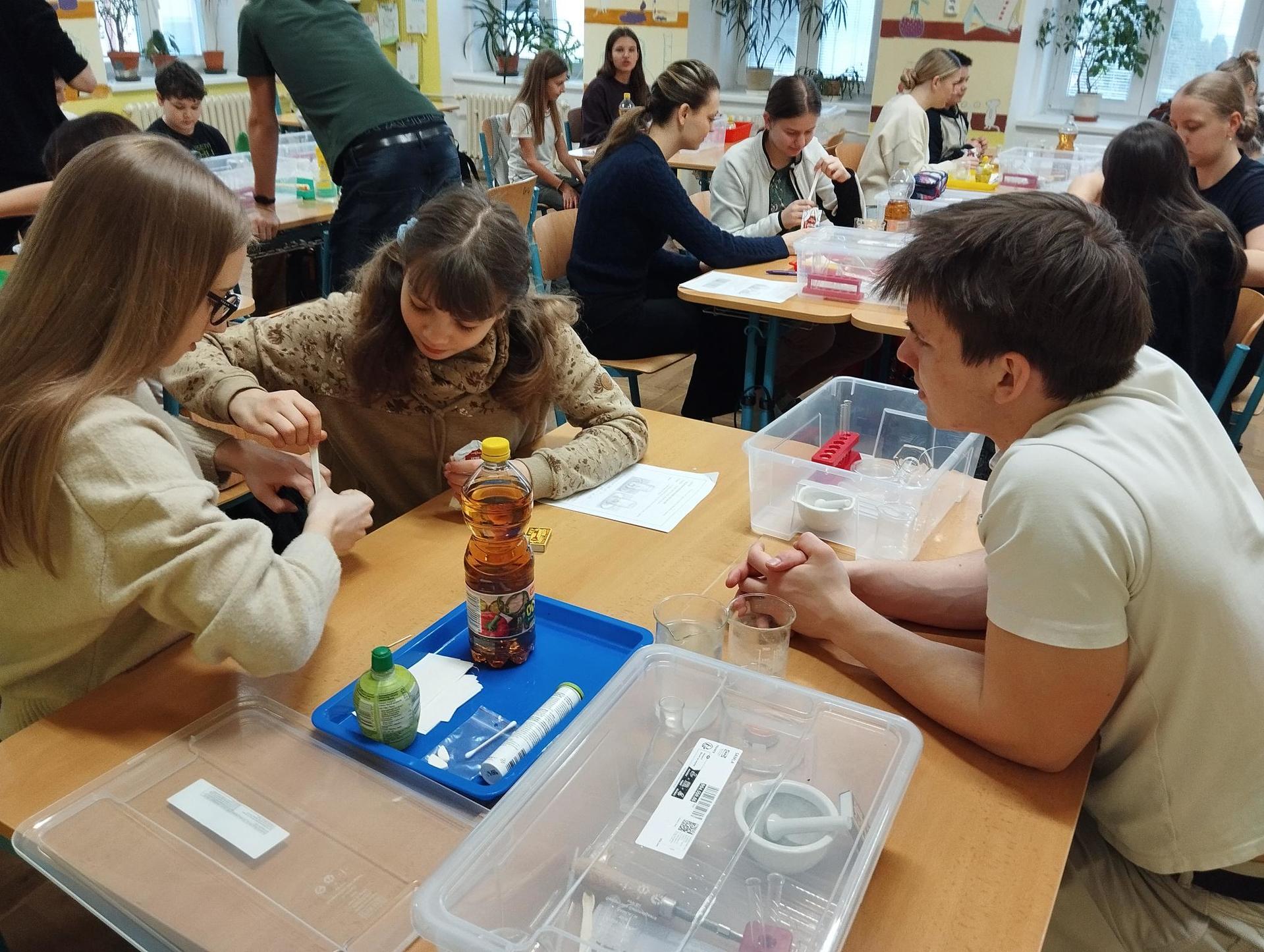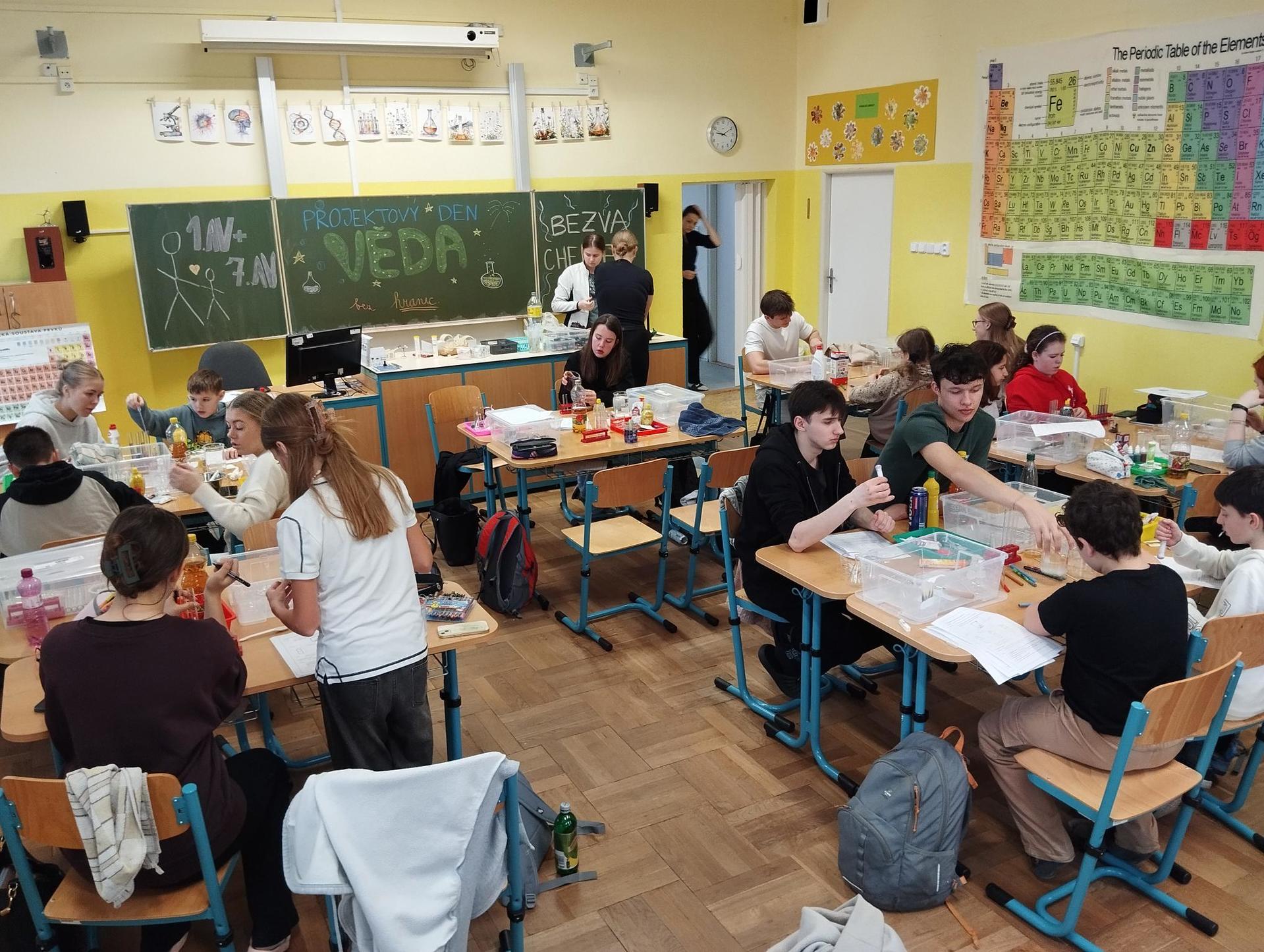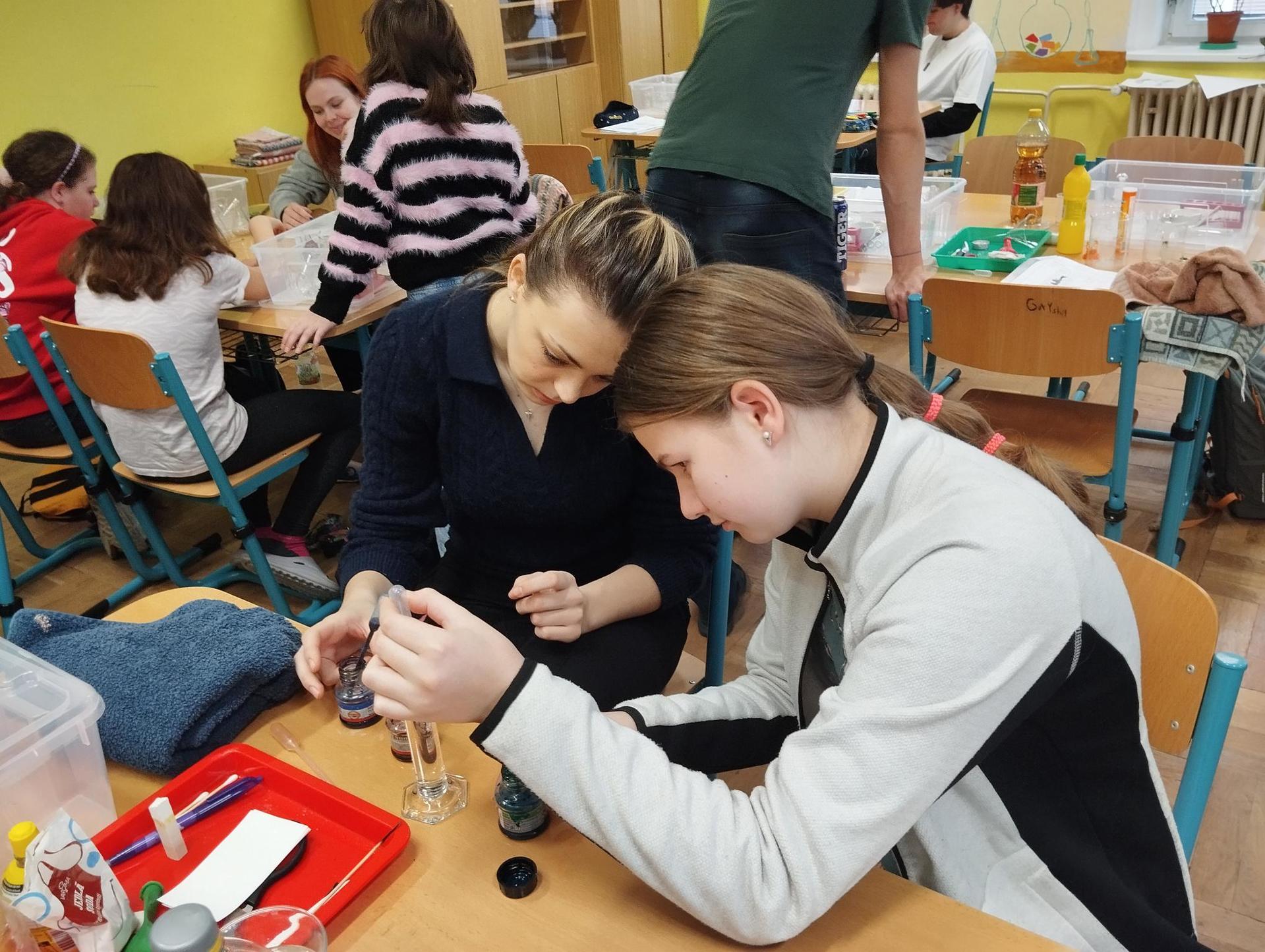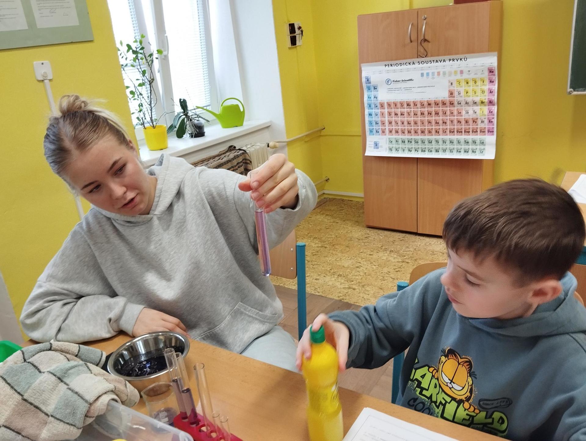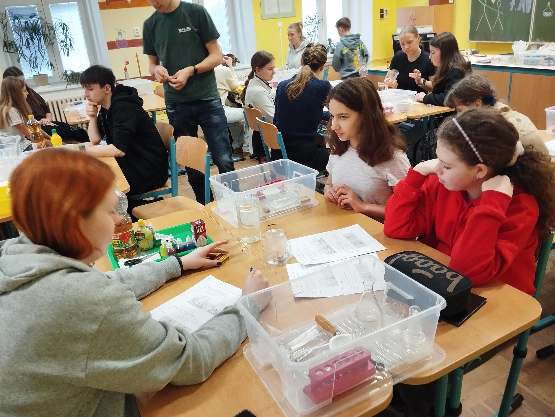 Žáci primy prováděli jednoduché experimenty pod vedením žáků septimy. Společná činnost mladších a starších žáků přinesla nová přátelství, pocit podpory, jistoty a sounáležitosti. Vytvoření příjemné atmosféry a kamarádského přístupu mezi žáky pozvedly projektový den na nezapomenutelný zážitek všech zúčastněných. Děti pracovaly s nově pořízenými laboratorními soupravami, které byly sestaveny pro účely práce s větším počtem žáků v učebně chemie či jakékoliv jiné třídě. A co všechno během projektového dne žáci zvládli? Dokázali přítomnost kyslíku, i když není vidět, nafoukli balonek bez použití vlastního dechu, přesvědčili se, že oxid uhličitý hasí plamen, zjišťovali složení barviv fixů pomocí chromatografie na papíře a křídě, seznámili se s procesem difúze, vyrobili mléčnou duhu, použili výluh z červeného zelí jako přírodní indikátor, pozorovali fluorescenci rostlin, dokazovali přítomnost škrobu v bramborách a rýži, pozorovali škrobová zrna pod mikroskopem a rozluštili tajné písmo. Dále pak pracovali s mikrokapkovacími destičkami, v nichž vytvořili z barevných roztoků obrázek, vyrobili těžišťáka, kterého postavili nejen na různá místa učebny, ale také na rozmanité části svého těla. V části věnované elektřině žáci zapojovali jednoduché elektrické obvody. Pomocí ampérmetru měřili elektrický proud a pomocí voltmetru napětí na jednotlivých částech obvodu. Se stavebnicemi elektroniky sestavovali různé varianty zapojení a ověřovali si, jak se obvod chová při změnách podmínek. Zajímavou částí bylo také zkoumání vlastností diody – žáci si prakticky ověřili, že dioda propouští proud pouze jedním směrem. Další část projektového dne byla zaměřena na optiku. Pomocí spojné čočky žáci hledali obraz předmětu a určovali ohniskovou vzdálenost spojky. Praktickým měřením si tak upevnili poznatky o vzniku skutečného obrazu a jeho vlastnostech. Cíl projektového dne byl naplněn ve všech ohledech, nešlo pouze o experimenty, ale především o spolupráci, vzájemnou podporu a sdílení zkušeností. Spolupráce žáků bude pokračovat nadále, výsledkem budou další projektové dny a Chemická show, kde žáci zúročí své vědomosti a dovednosti a přesvědčí tak rodiče a veřejnost, že věda je zábava!