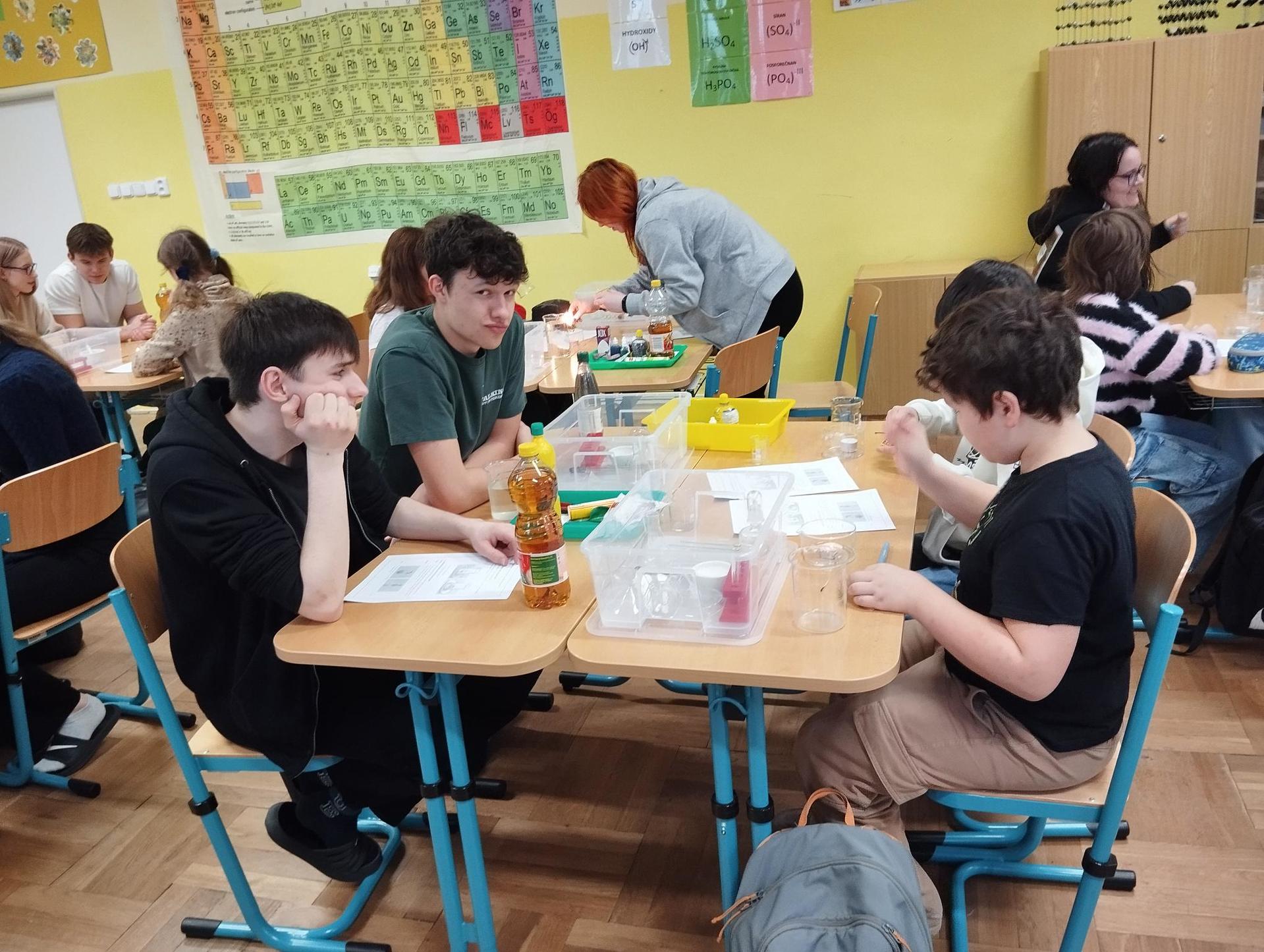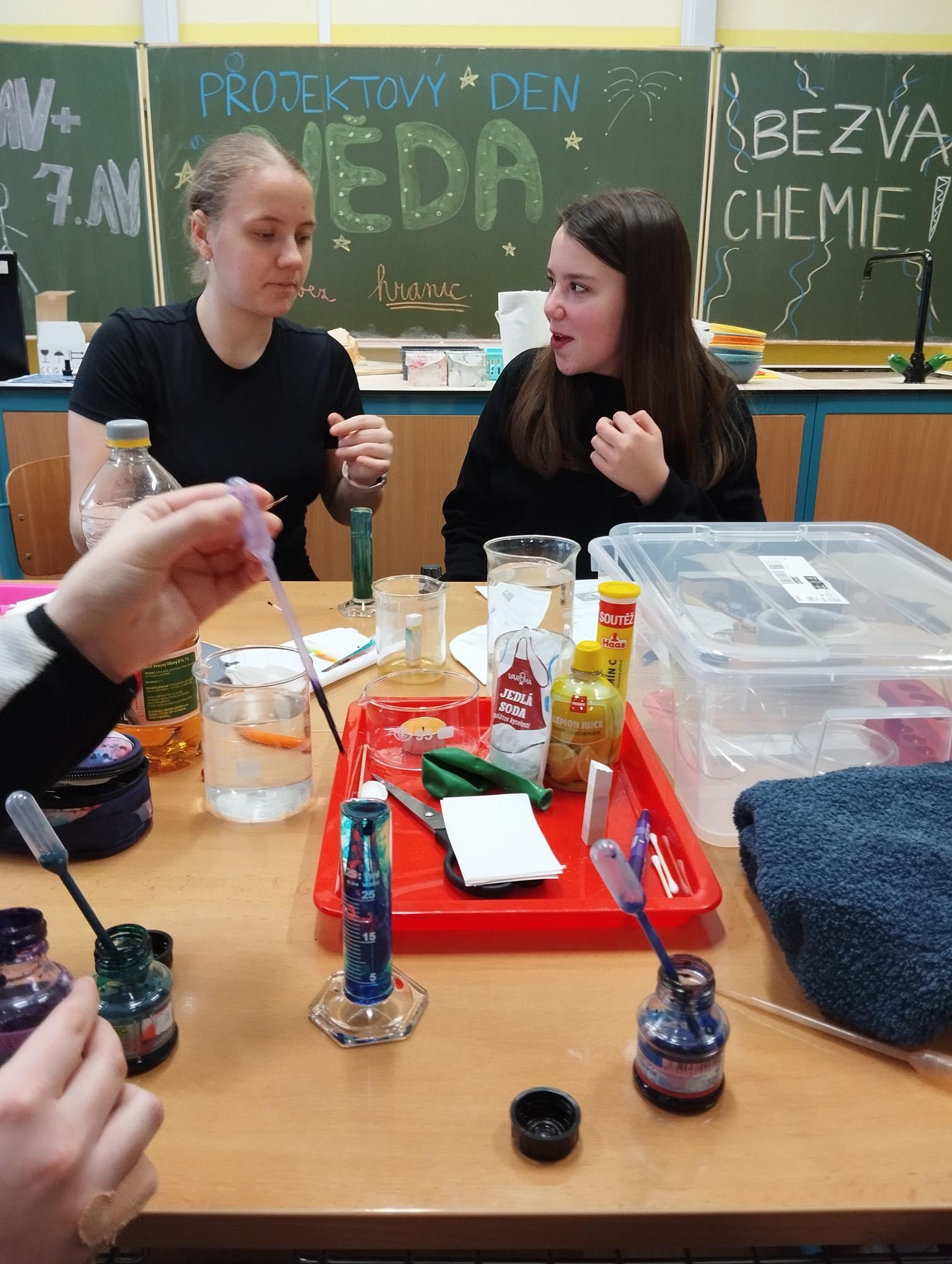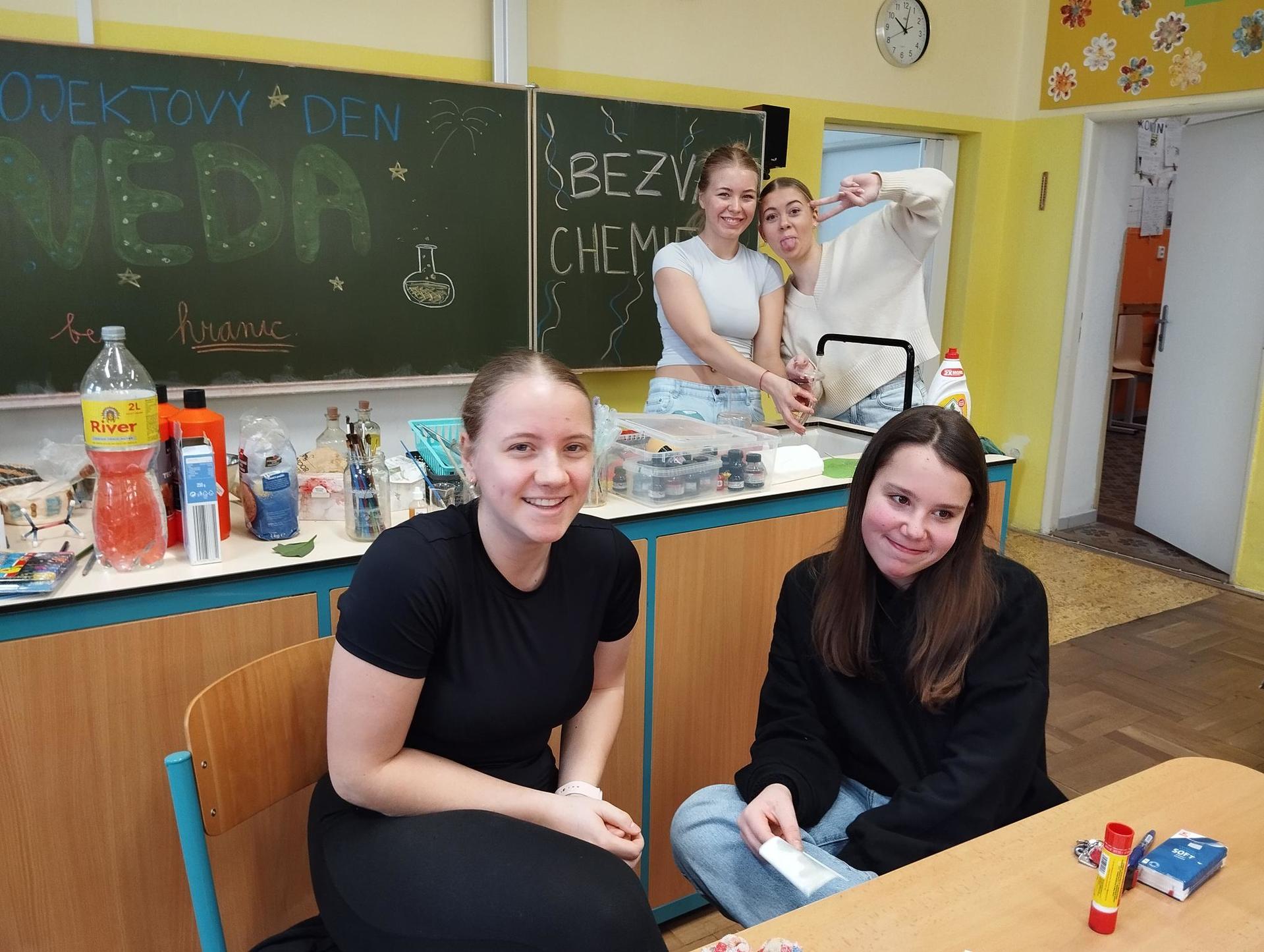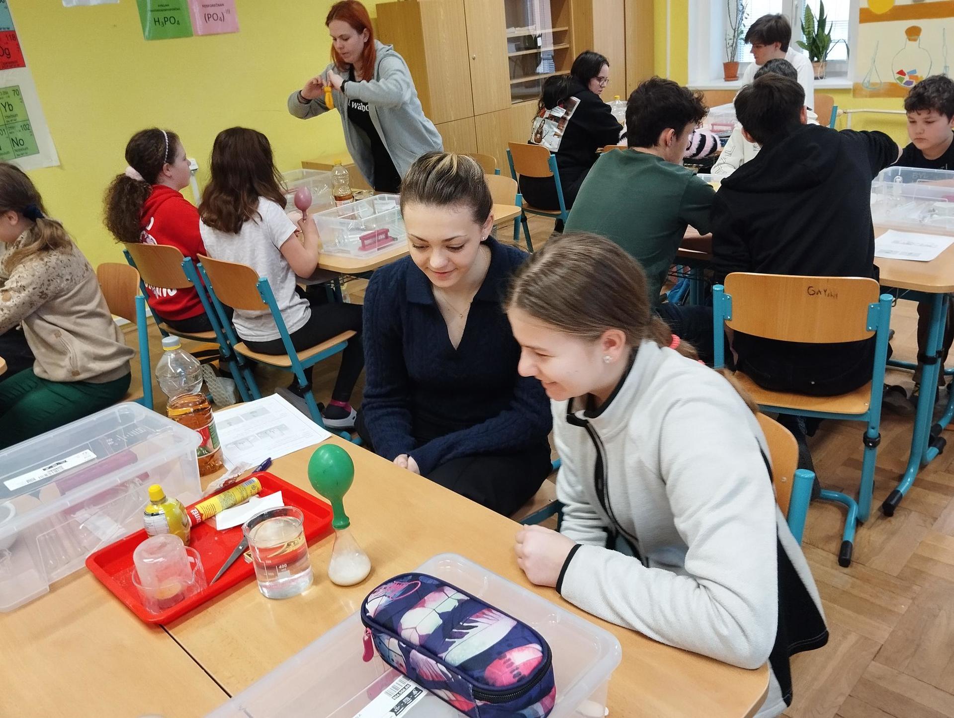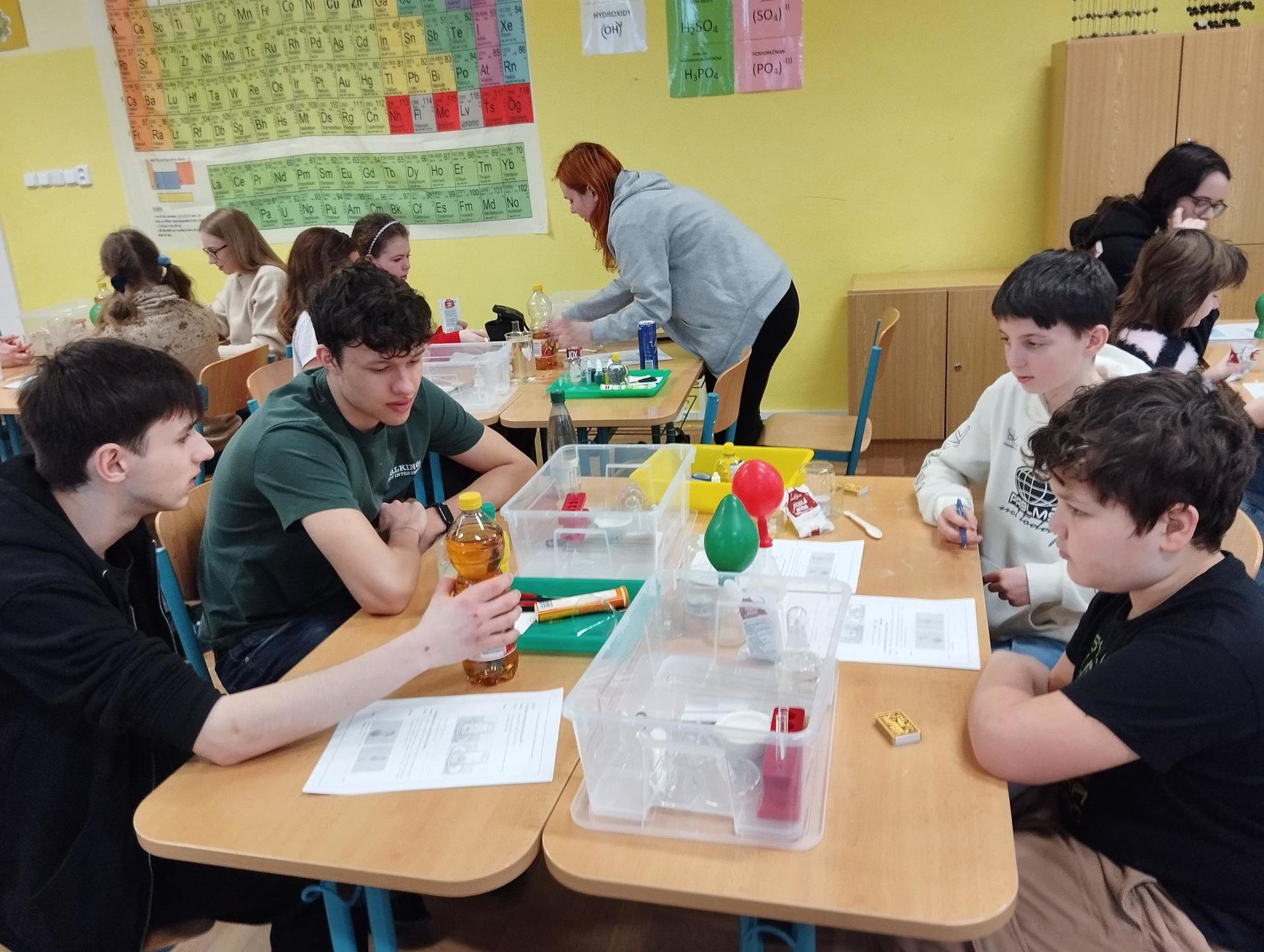 Žáci primy prováděli jednoduché experimenty pod vedením žáků septimy. Společná činnost mladších a starších žáků přinesla nová přátelství, pocit podpory, jistoty a sounáležitosti. Vytvoření příjemné atmosféry a kamarádského přístupu mezi žáky pozvedly projektový den na nezapomenutelný zážitek všech zúčastněných. Děti pracovaly s nově pořízenými laboratorními soupravami, které byly sestaveny pro účely práce s větším počtem žáků v učebně chemie či jakékoliv jiné třídě. A co všechno během projektového dne žáci zvládli? Dokázali přítomnost kyslíku, i když není vidět, nafoukli balonek bez použití vlastního dechu, přesvědčili se, že oxid uhličitý hasí plamen, zjišťovali složení barviv fixů pomocí chromatografie na papíře a křídě, seznámili se s procesem difúze, vyrobili mléčnou duhu, použili výluh z červeného zelí jako přírodní indikátor, pozorovali fluorescenci rostlin, dokazovali přítomnost škrobu v bramborách a rýži, pozorovali škrobová zrna pod mikroskopem a rozluštili tajné písmo. Dále pak pracovali s mikrokapkovacími destičkami, v nichž vytvořili z barevných roztoků obrázek, vyrobili těžišťáka, kterého postavili nejen na různá místa učebny, ale také na rozmanité části svého těla. V části věnované elektřině žáci zapojovali jednoduché elektrické obvody. Pomocí ampérmetru měřili elektrický proud a pomocí voltmetru napětí na jednotlivých částech obvodu. Se stavebnicemi elektroniky sestavovali různé varianty zapojení a ověřovali si, jak se obvod chová při změnách podmínek. Zajímavou částí bylo také zkoumání vlastností diody – žáci si prakticky ověřili, že dioda propouští proud pouze jedním směrem. Další část projektového dne byla zaměřena na optiku. Pomocí spojné čočky žáci hledali obraz předmětu a určovali ohniskovou vzdálenost spojky. Praktickým měřením si tak upevnili poznatky o vzniku skutečného obrazu a jeho vlastnostech. Cíl projektového dne byl naplněn ve všech ohledech, nešlo pouze o experimenty, ale především o spolupráci, vzájemnou podporu a sdílení zkušeností. Spolupráce žáků bude pokračovat nadále, výsledkem budou další projektové dny a Chemická show, kde žáci zúročí své vědomosti a dovednosti a přesvědčí tak rodiče a veřejnost, že věda je zábava!