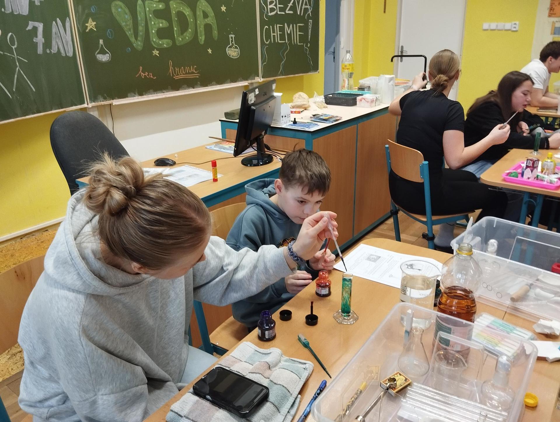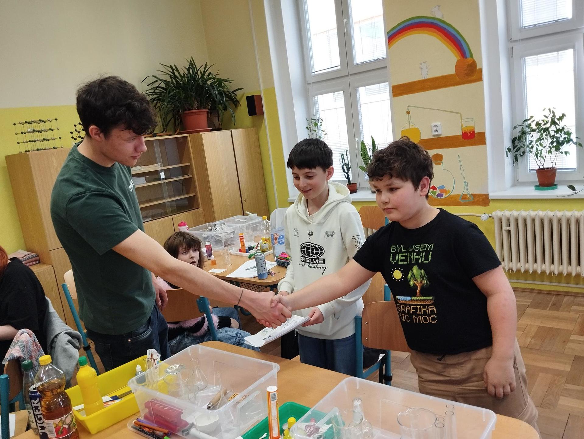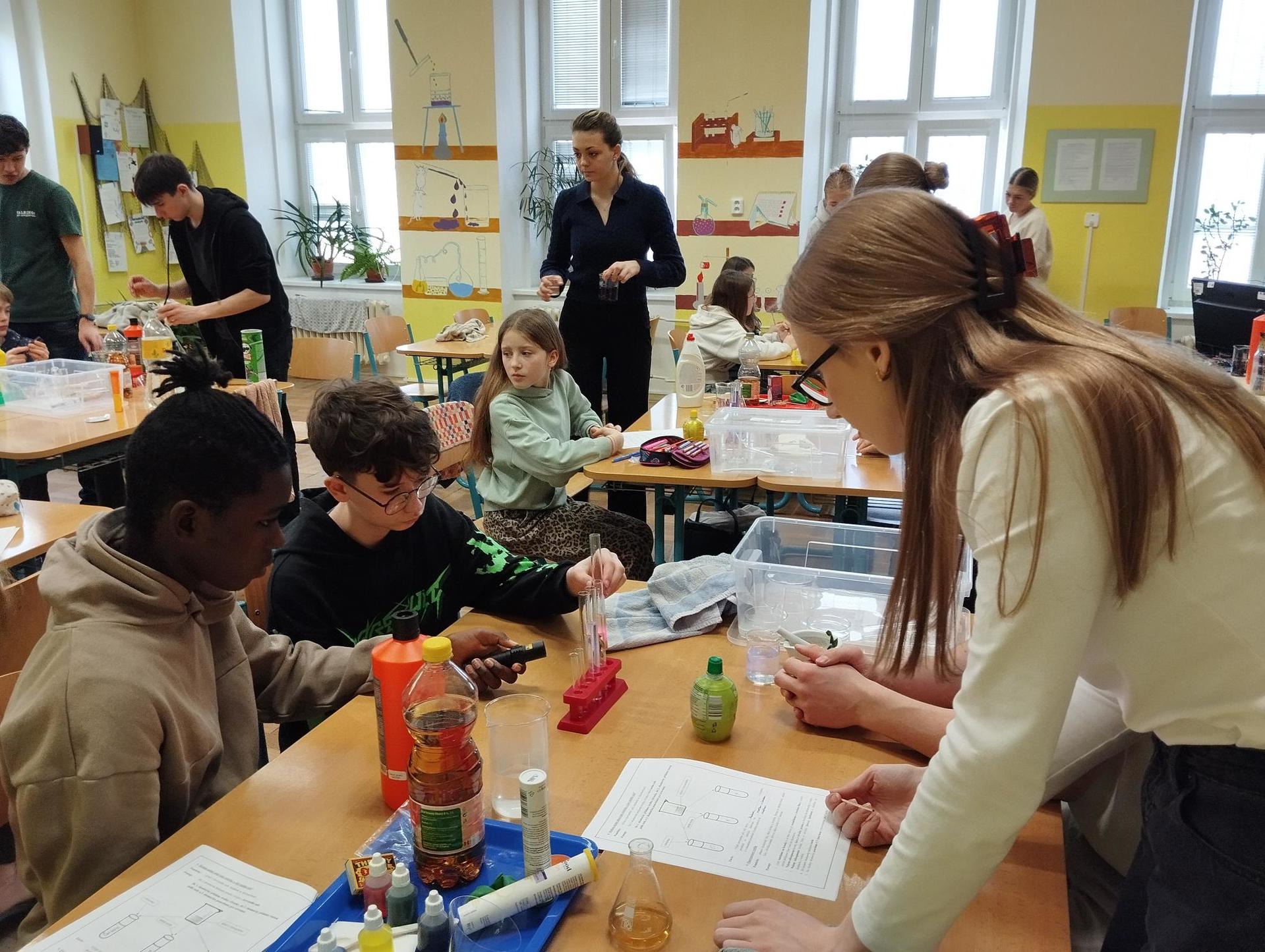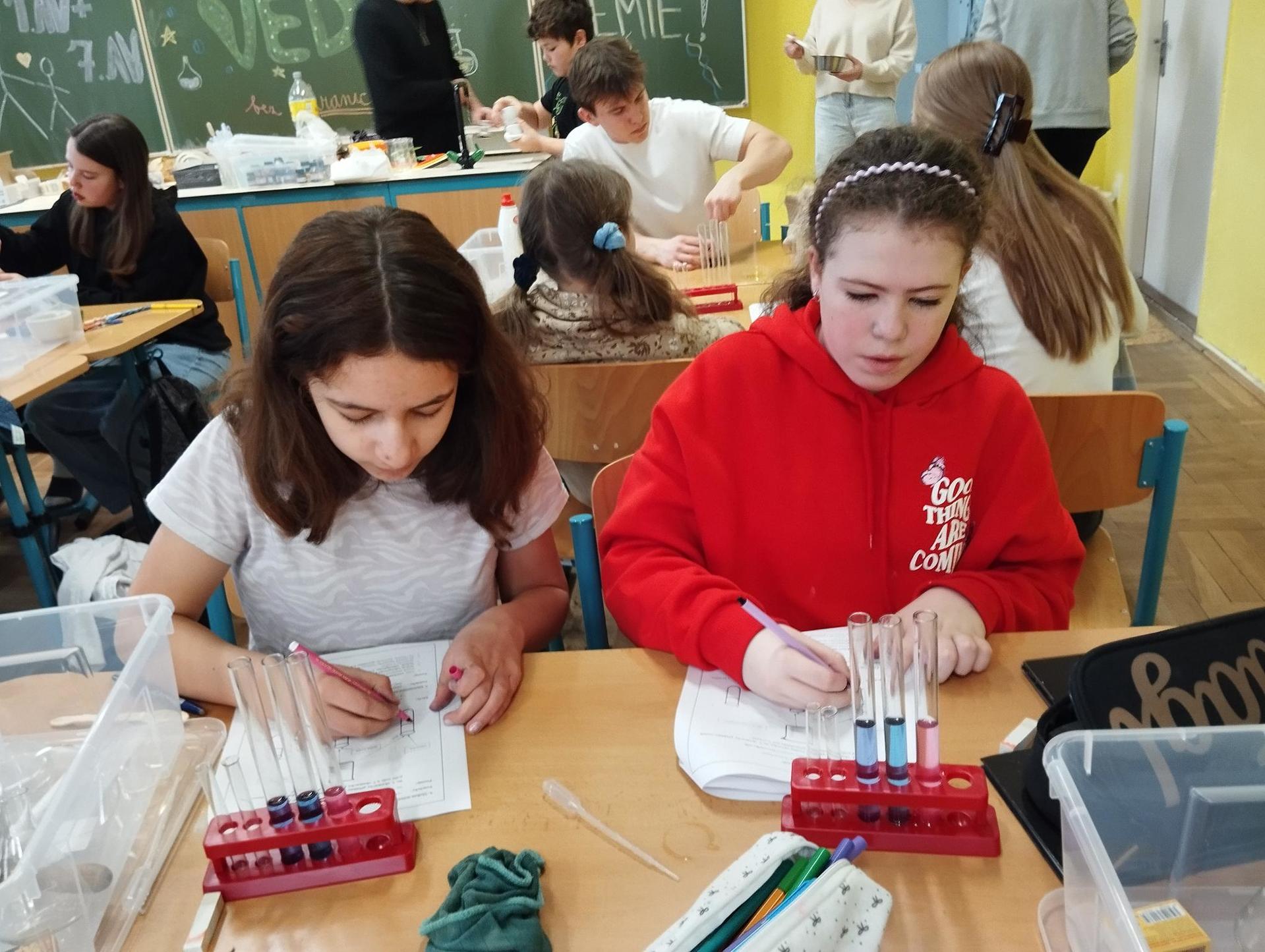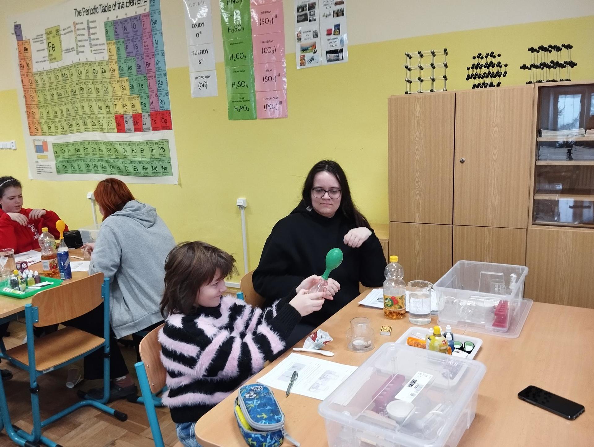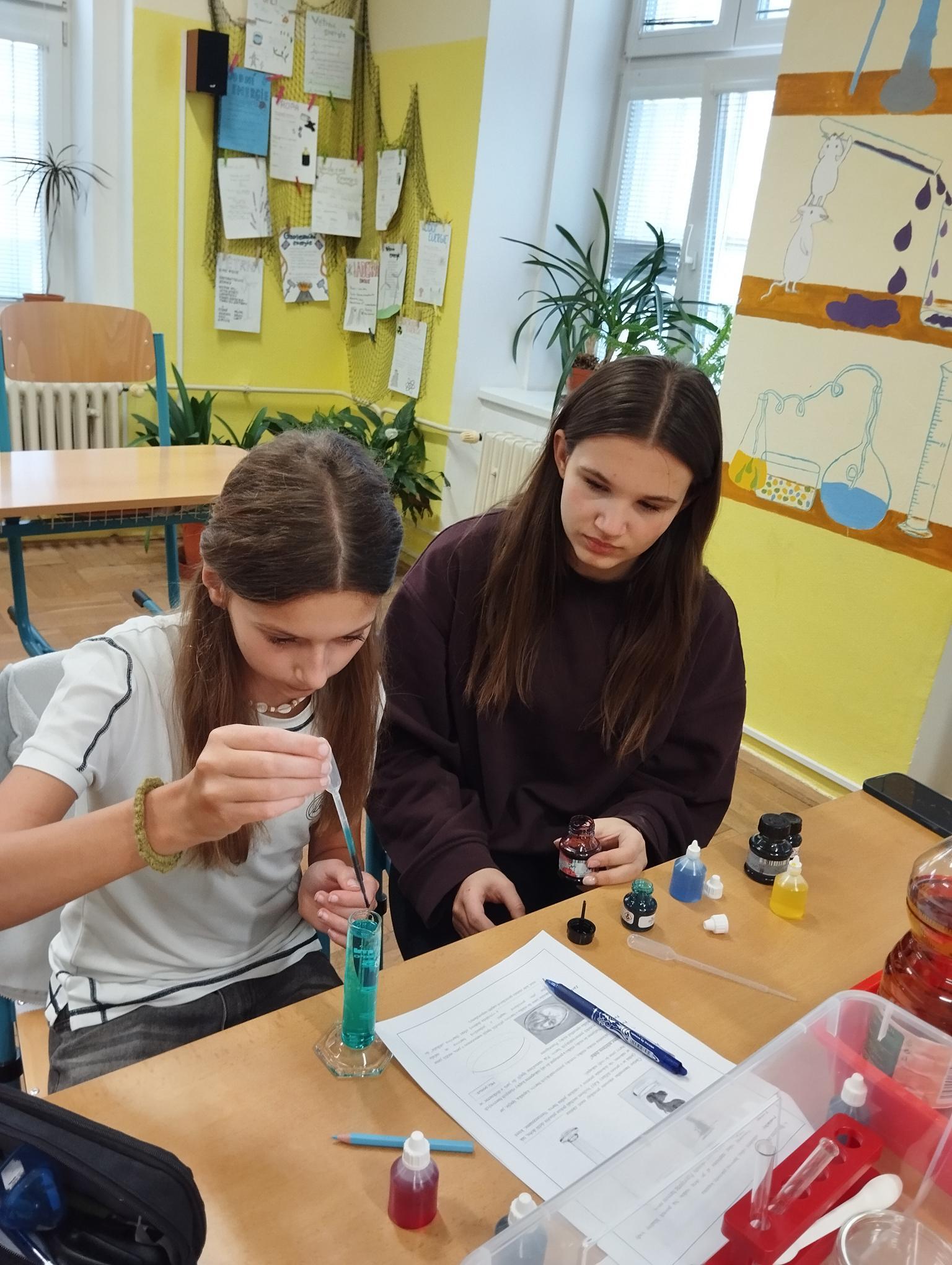 Žáci primy prováděli jednoduché experimenty pod vedením žáků septimy. Společná činnost mladších a starších žáků přinesla nová přátelství, pocit podpory, jistoty a sounáležitosti. Vytvoření příjemné atmosféry a kamarádského přístupu mezi žáky pozvedly projektový den na nezapomenutelný zážitek všech zúčastněných. Děti pracovaly s nově pořízenými laboratorními soupravami, které byly sestaveny pro účely práce s větším počtem žáků v učebně chemie či jakékoliv jiné třídě. A co všechno během projektového dne žáci zvládli? Dokázali přítomnost kyslíku, i když není vidět, nafoukli balonek bez použití vlastního dechu, přesvědčili se, že oxid uhličitý hasí plamen, zjišťovali složení barviv fixů pomocí chromatografie na papíře a křídě, seznámili se s procesem difúze, vyrobili mléčnou duhu, použili výluh z červeného zelí jako přírodní indikátor, pozorovali fluorescenci rostlin, dokazovali přítomnost škrobu v bramborách a rýži, pozorovali škrobová zrna pod mikroskopem a rozluštili tajné písmo. Dále pak pracovali s mikrokapkovacími destičkami, v nichž vytvořili z barevných roztoků obrázek, vyrobili těžišťáka, kterého postavili nejen na různá místa učebny, ale také na rozmanité části svého těla. V části věnované elektřině žáci zapojovali jednoduché elektrické obvody. Pomocí ampérmetru měřili elektrický proud a pomocí voltmetru napětí na jednotlivých částech obvodu. Se stavebnicemi elektroniky sestavovali různé varianty zapojení a ověřovali si, jak se obvod chová při změnách podmínek. Zajímavou částí bylo také zkoumání vlastností diody – žáci si prakticky ověřili, že dioda propouští proud pouze jedním směrem. Další část projektového dne byla zaměřena na optiku. Pomocí spojné čočky žáci hledali obraz předmětu a určovali ohniskovou vzdálenost spojky. Praktickým měřením si tak upevnili poznatky o vzniku skutečného obrazu a jeho vlastnostech. Cíl projektového dne byl naplněn ve všech ohledech, nešlo pouze o experimenty, ale především o spolupráci, vzájemnou podporu a sdílení zkušeností. Spolupráce žáků bude pokračovat nadále, výsledkem budou další projektové dny a Chemická show, kde žáci zúročí své vědomosti a dovednosti a přesvědčí tak rodiče a veřejnost, že věda je zábava!