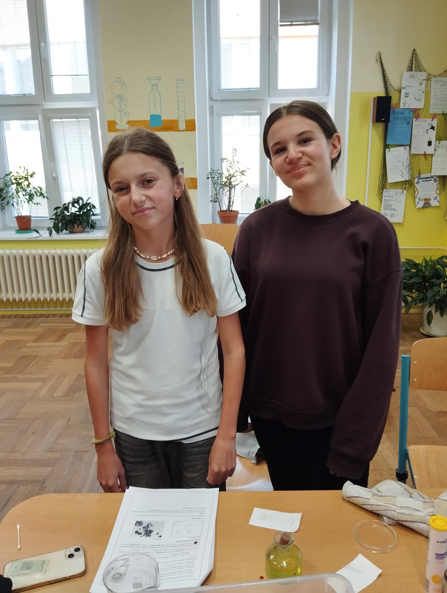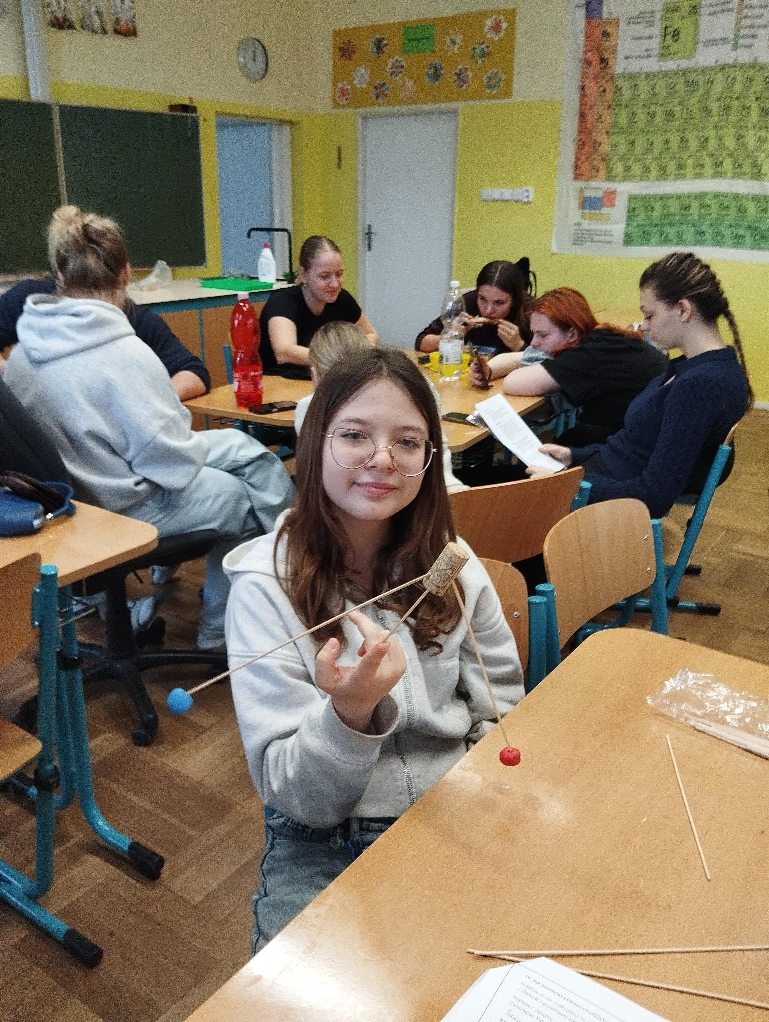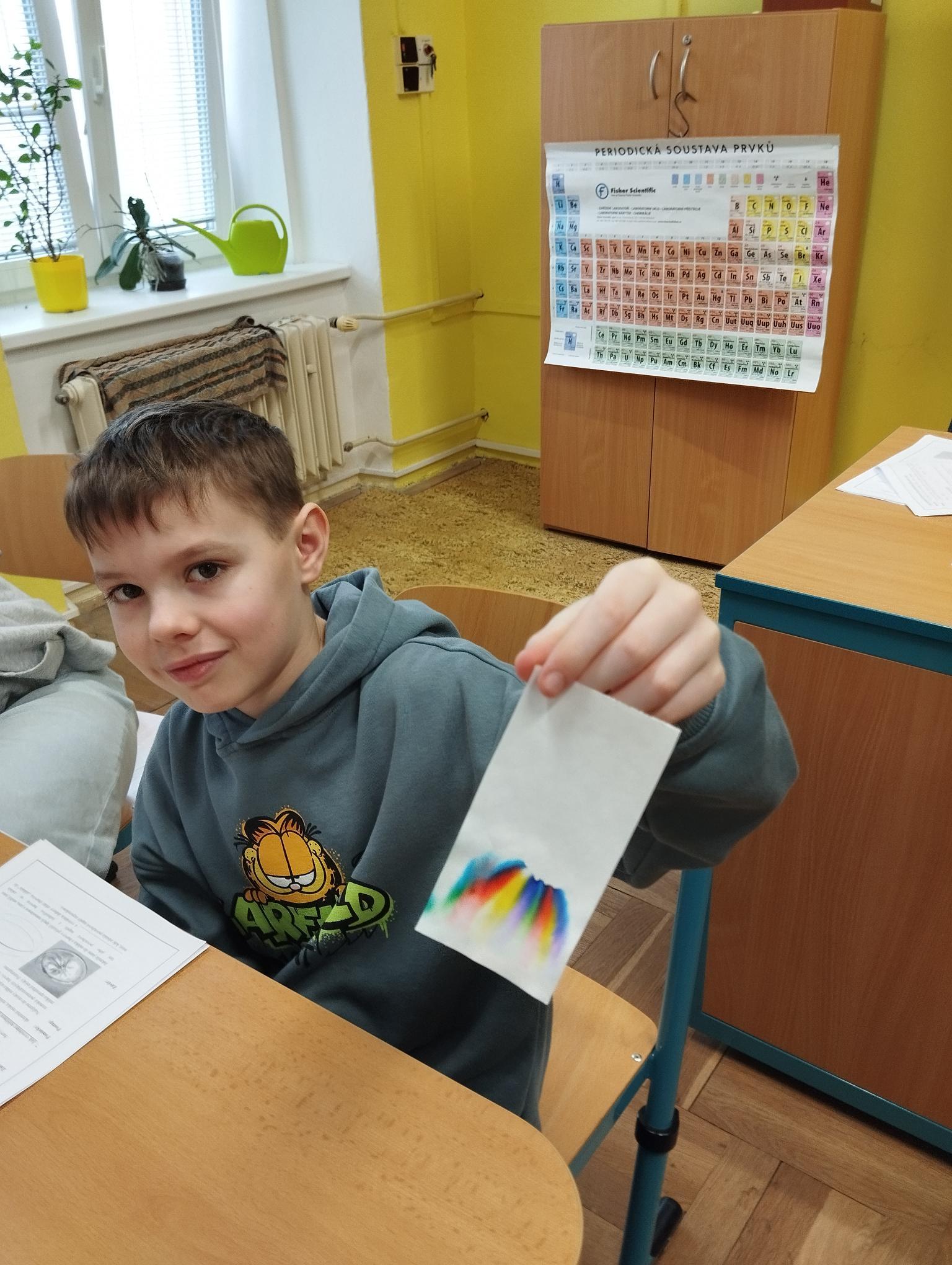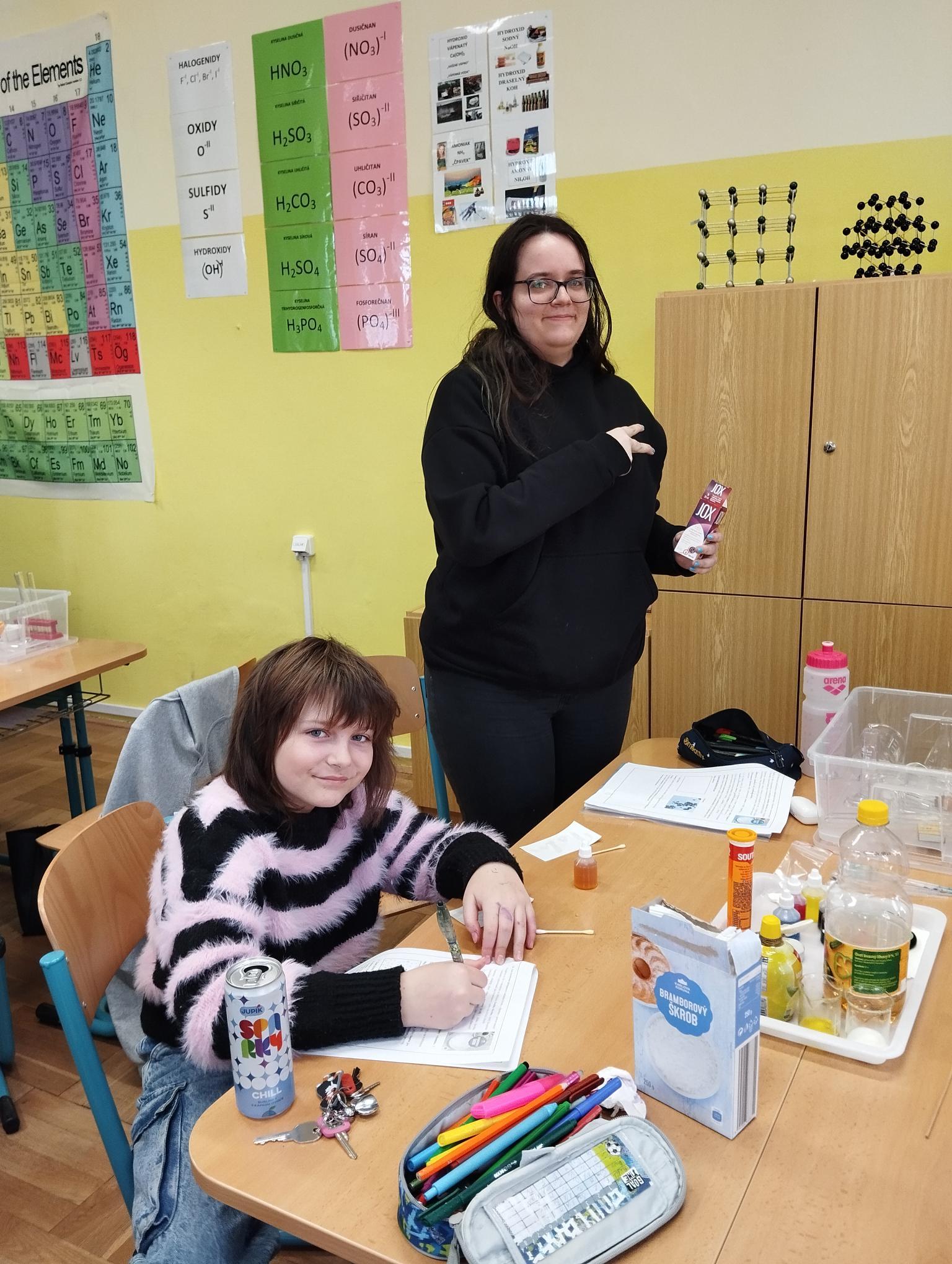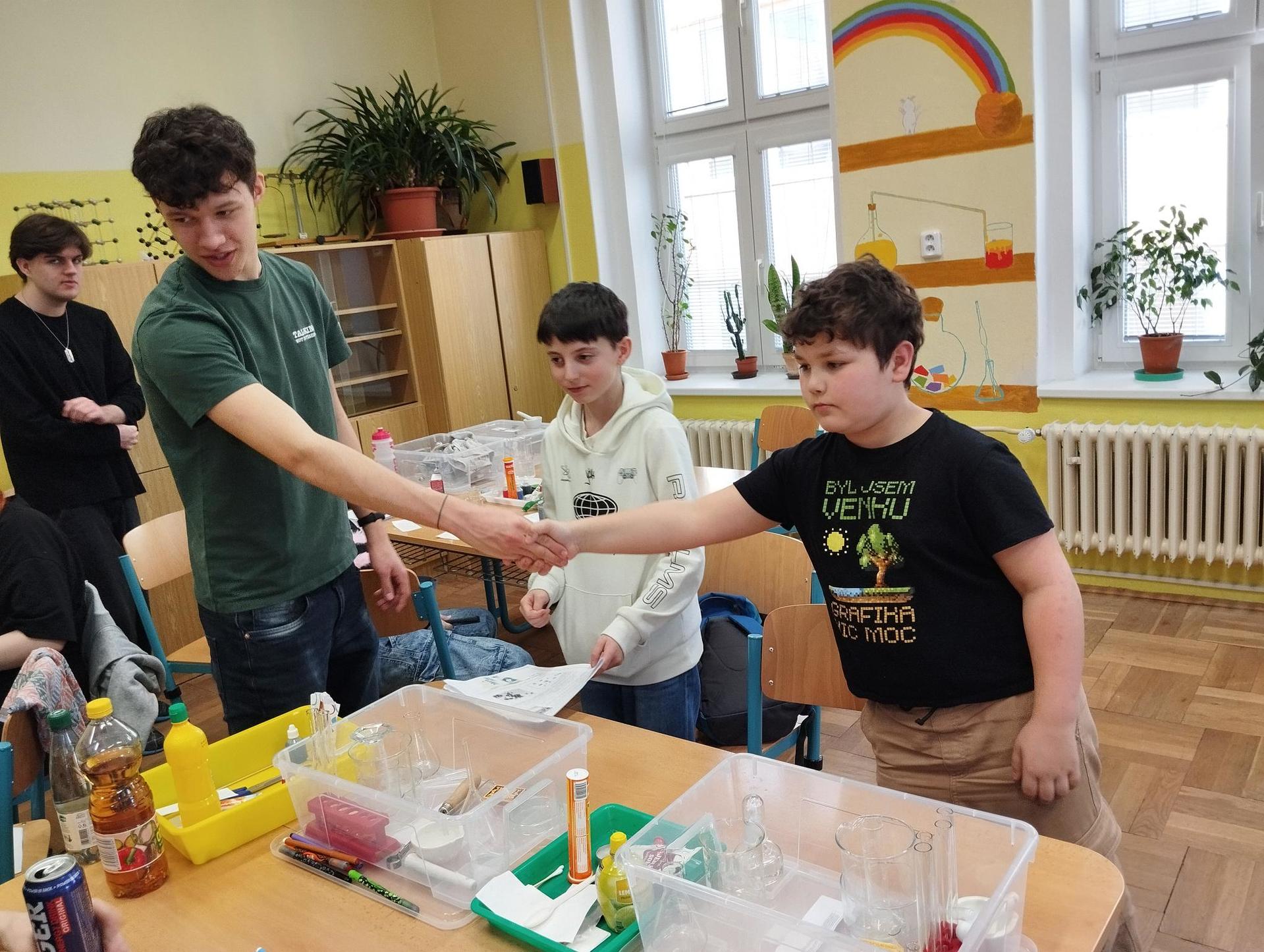 Žáci primy prováděli jednoduché experimenty pod vedením žáků septimy. Společná činnost mladších a starších žáků přinesla nová přátelství, pocit podpory, jistoty a sounáležitosti. Vytvoření příjemné atmosféry a kamarádského přístupu mezi žáky pozvedly projektový den na nezapomenutelný zážitek všech zúčastněných. Děti pracovaly s nově pořízenými laboratorními soupravami, které byly sestaveny pro účely práce s větším počtem žáků v učebně chemie či jakékoliv jiné třídě. A co všechno během projektového dne žáci zvládli? Dokázali přítomnost kyslíku, i když není vidět, nafoukli balonek bez použití vlastního dechu, přesvědčili se, že oxid uhličitý hasí plamen, zjišťovali složení barviv fixů pomocí chromatografie na papíře a křídě, seznámili se s procesem difúze, vyrobili mléčnou duhu, použili výluh z červeného zelí jako přírodní indikátor, pozorovali fluorescenci rostlin, dokazovali přítomnost škrobu v bramborách a rýži, pozorovali škrobová zrna pod mikroskopem a rozluštili tajné písmo. Dále pak pracovali s mikrokapkovacími destičkami, v nichž vytvořili z barevných roztoků obrázek, vyrobili těžišťáka, kterého postavili nejen na různá místa učebny, ale také na rozmanité části svého těla. V části věnované elektřině žáci zapojovali jednoduché elektrické obvody. Pomocí ampérmetru měřili elektrický proud a pomocí voltmetru napětí na jednotlivých částech obvodu. Se stavebnicemi elektroniky sestavovali různé varianty zapojení a ověřovali si, jak se obvod chová při změnách podmínek. Zajímavou částí bylo také zkoumání vlastností diody – žáci si prakticky ověřili, že dioda propouští proud pouze jedním směrem. Další část projektového dne byla zaměřena na optiku. Pomocí spojné čočky žáci hledali obraz předmětu a určovali ohniskovou vzdálenost spojky. Praktickým měřením si tak upevnili poznatky o vzniku skutečného obrazu a jeho vlastnostech. Cíl projektového dne byl naplněn ve všech ohledech, nešlo pouze o experimenty, ale především o spolupráci, vzájemnou podporu a sdílení zkušeností. Spolupráce žáků bude pokračovat nadále, výsledkem budou další projektové dny a Chemická show, kde žáci zúročí své vědomosti a dovednosti a přesvědčí tak rodiče a veřejnost, že věda je zábava!