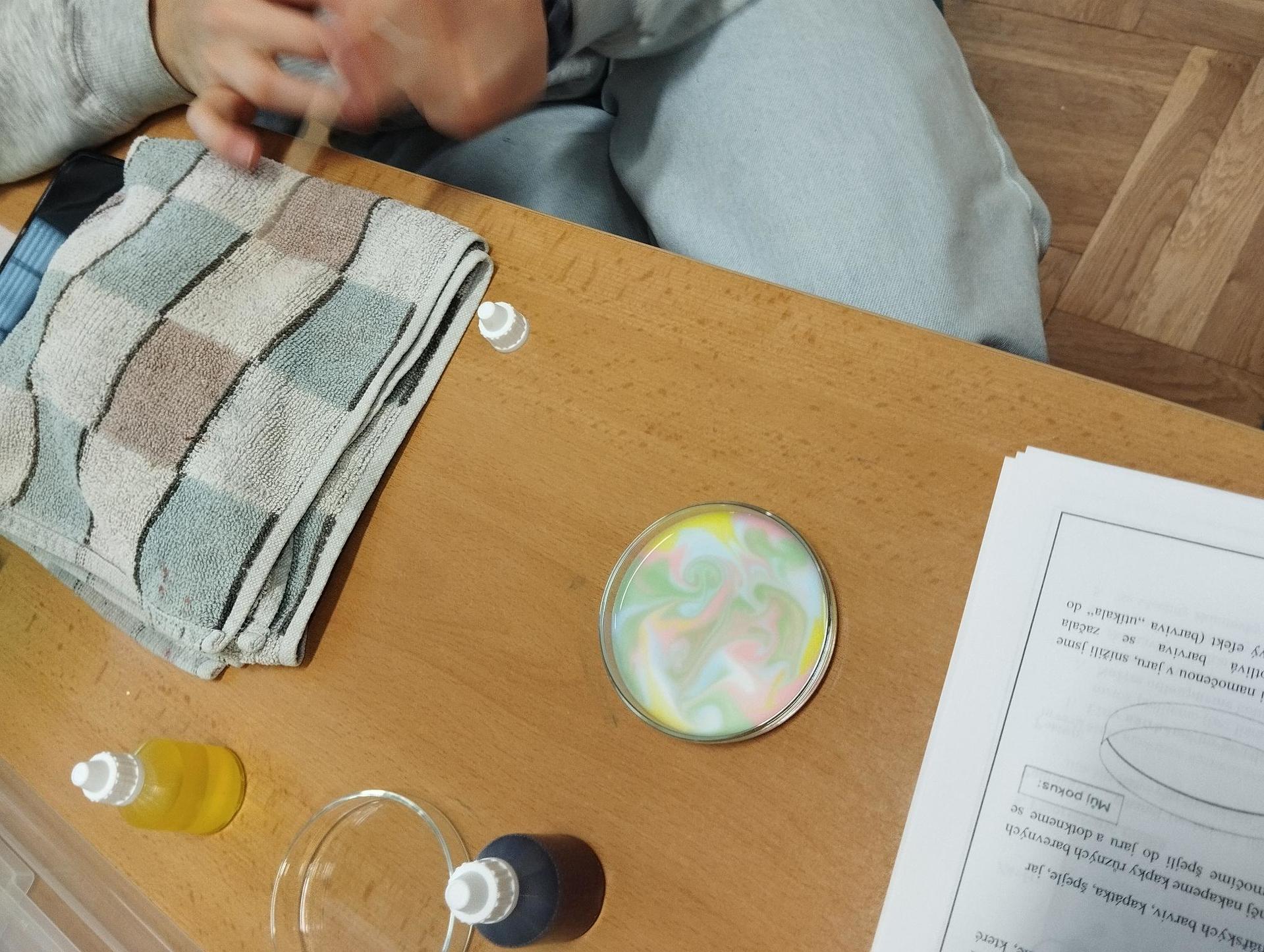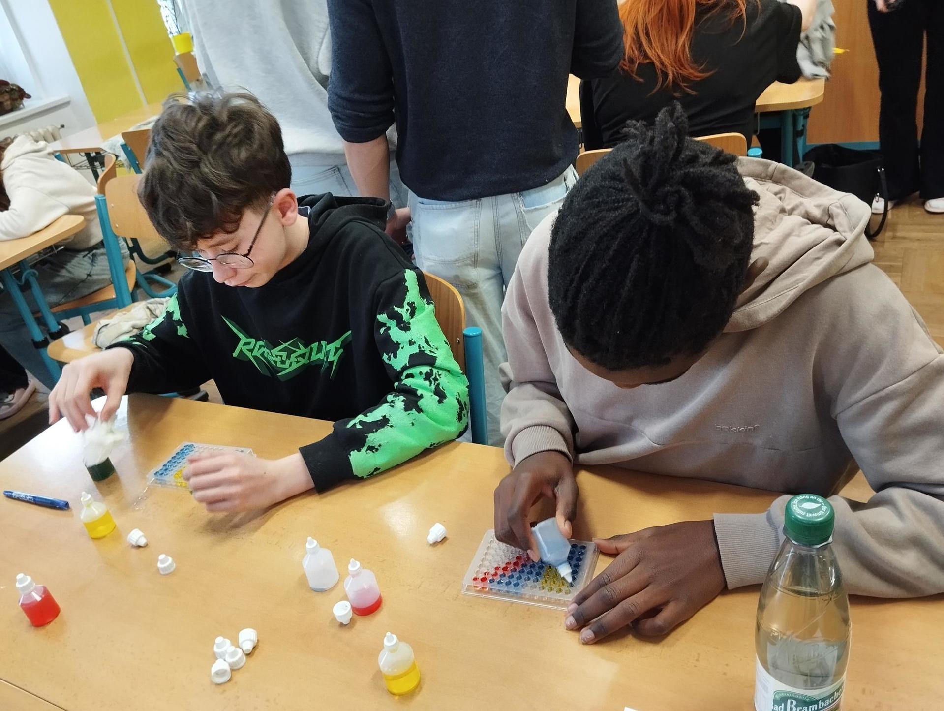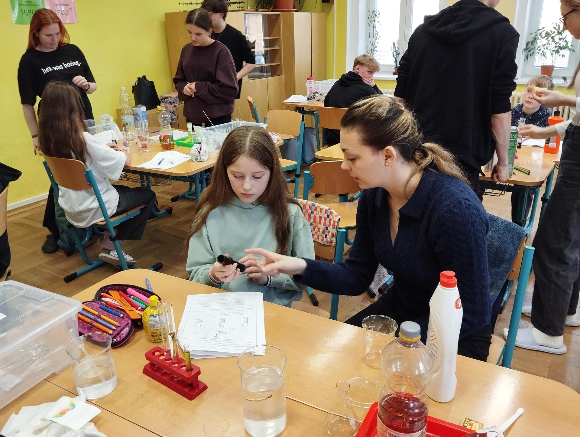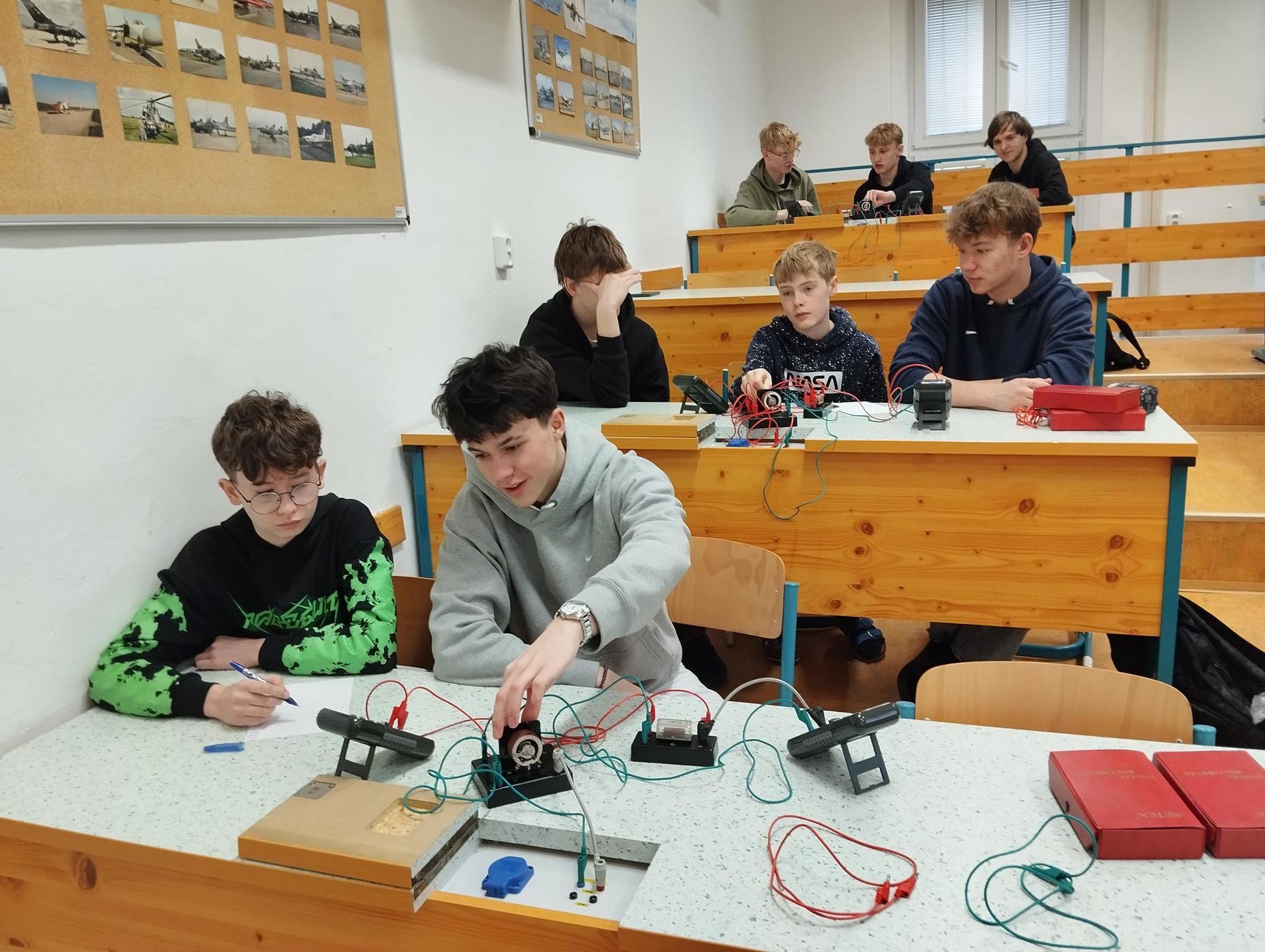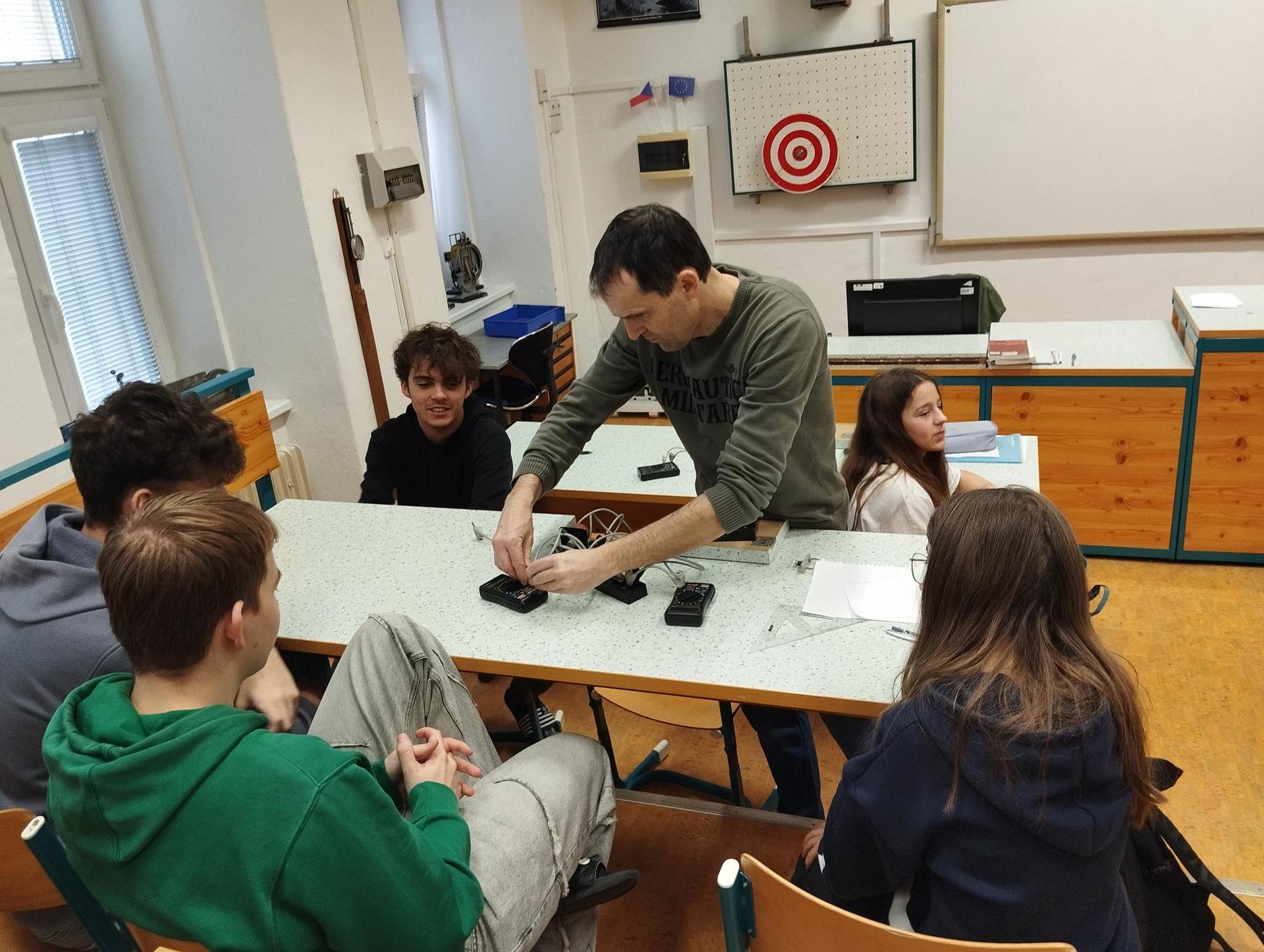 Žáci primy prováděli jednoduché experimenty pod vedením žáků septimy. Společná činnost mladších a starších žáků přinesla nová přátelství, pocit podpory, jistoty a sounáležitosti. Vytvoření příjemné atmosféry a kamarádského přístupu mezi žáky pozvedly projektový den na nezapomenutelný zážitek všech zúčastněných. Děti pracovaly s nově pořízenými laboratorními soupravami, které byly sestaveny pro účely práce s větším počtem žáků v učebně chemie či jakékoliv jiné třídě. A co všechno během projektového dne žáci zvládli? Dokázali přítomnost kyslíku, i když není vidět, nafoukli balonek bez použití vlastního dechu, přesvědčili se, že oxid uhličitý hasí plamen, zjišťovali složení barviv fixů pomocí chromatografie na papíře a křídě, seznámili se s procesem difúze, vyrobili mléčnou duhu, použili výluh z červeného zelí jako přírodní indikátor, pozorovali fluorescenci rostlin, dokazovali přítomnost škrobu v bramborách a rýži, pozorovali škrobová zrna pod mikroskopem a rozluštili tajné písmo. Dále pak pracovali s mikrokapkovacími destičkami, v nichž vytvořili z barevných roztoků obrázek, vyrobili těžišťáka, kterého postavili nejen na různá místa učebny, ale také na rozmanité části svého těla. V části věnované elektřině žáci zapojovali jednoduché elektrické obvody. Pomocí ampérmetru měřili elektrický proud a pomocí voltmetru napětí na jednotlivých částech obvodu. Se stavebnicemi elektroniky sestavovali různé varianty zapojení a ověřovali si, jak se obvod chová při změnách podmínek. Zajímavou částí bylo také zkoumání vlastností diody – žáci si prakticky ověřili, že dioda propouští proud pouze jedním směrem. Další část projektového dne byla zaměřena na optiku. Pomocí spojné čočky žáci hledali obraz předmětu a určovali ohniskovou vzdálenost spojky. Praktickým měřením si tak upevnili poznatky o vzniku skutečného obrazu a jeho vlastnostech. Cíl projektového dne byl naplněn ve všech ohledech, nešlo pouze o experimenty, ale především o spolupráci, vzájemnou podporu a sdílení zkušeností. Spolupráce žáků bude pokračovat nadále, výsledkem budou další projektové dny a Chemická show, kde žáci zúročí své vědomosti a dovednosti a přesvědčí tak rodiče a veřejnost, že věda je zábava!