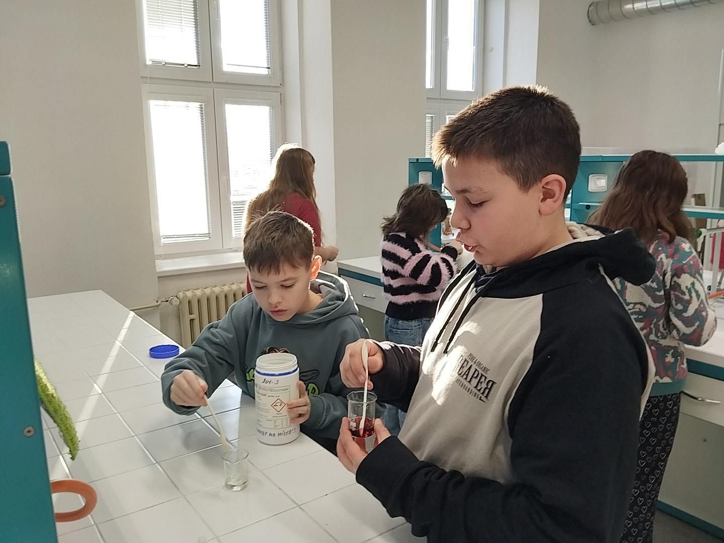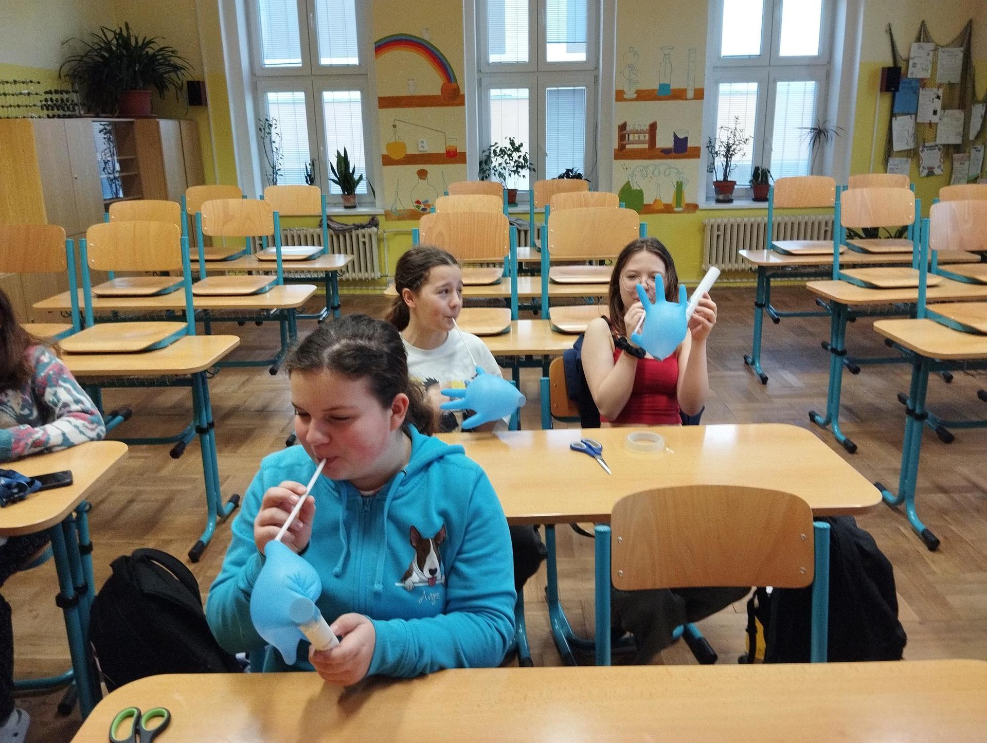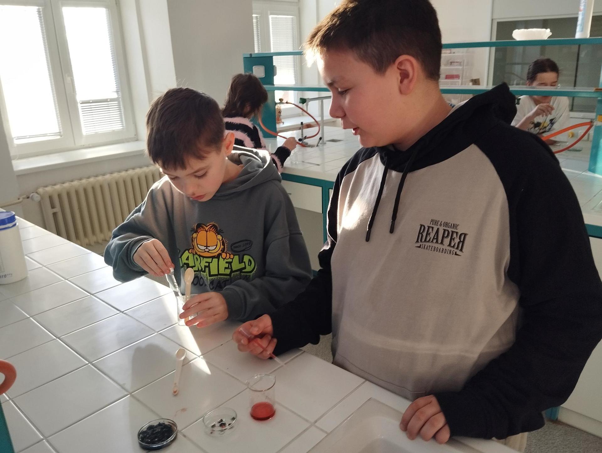 Protože každý žák měl jinou délku a průměr ruličky, vznikaly ve výsledku různě hluboké tóny. Ve druhé části kroužku si žáci vyzkoušely kouzlo chemické reakce, při které dotykem kapek 2 barevných roztoků vznikl nový roztok třetí barvy. Děti tak mohly podpořit svou kreativitu vytvořením různých barevných obrazců na Petriho misce.