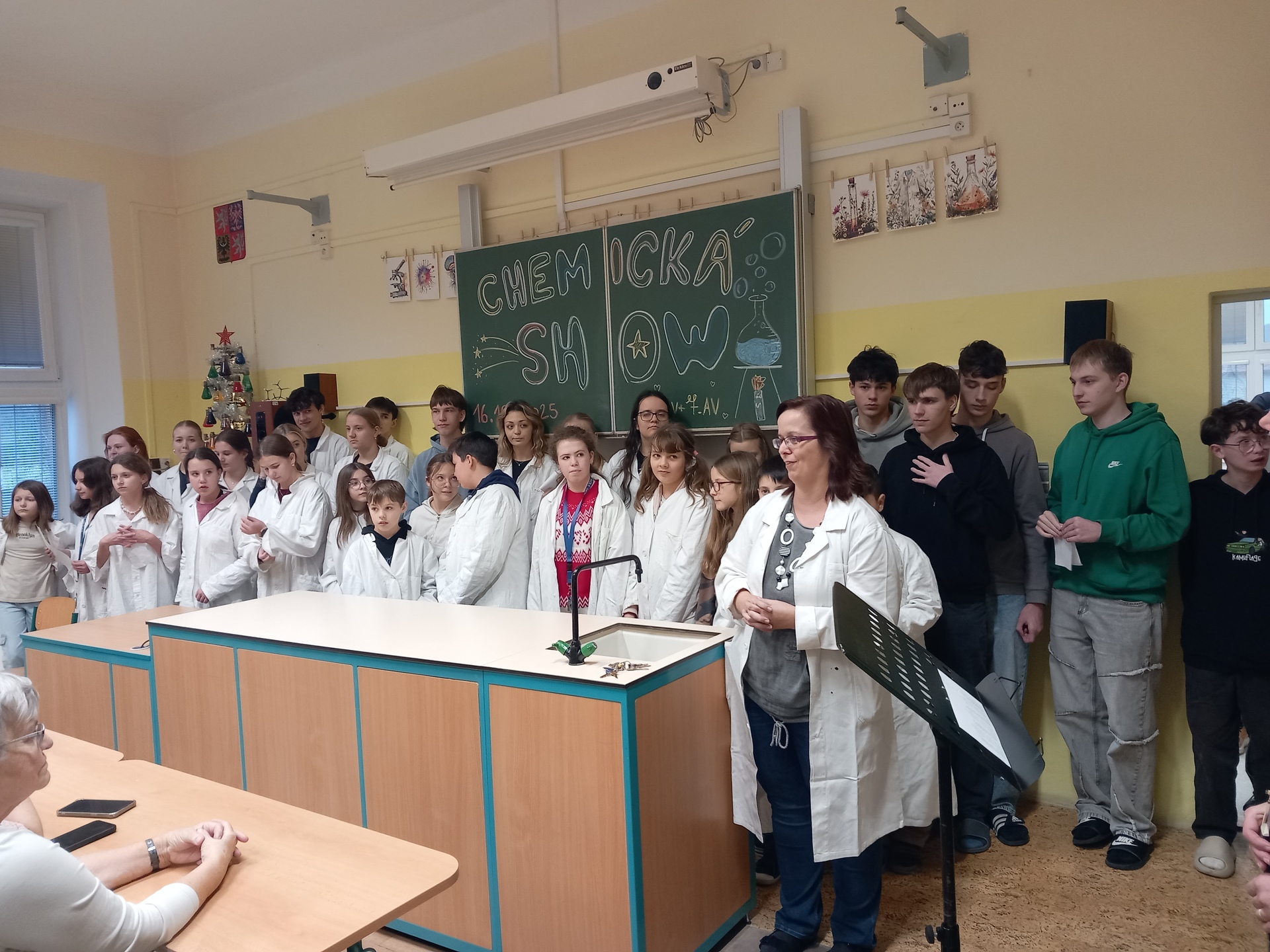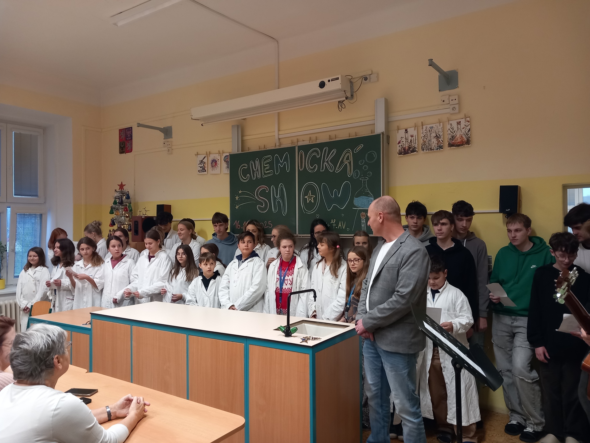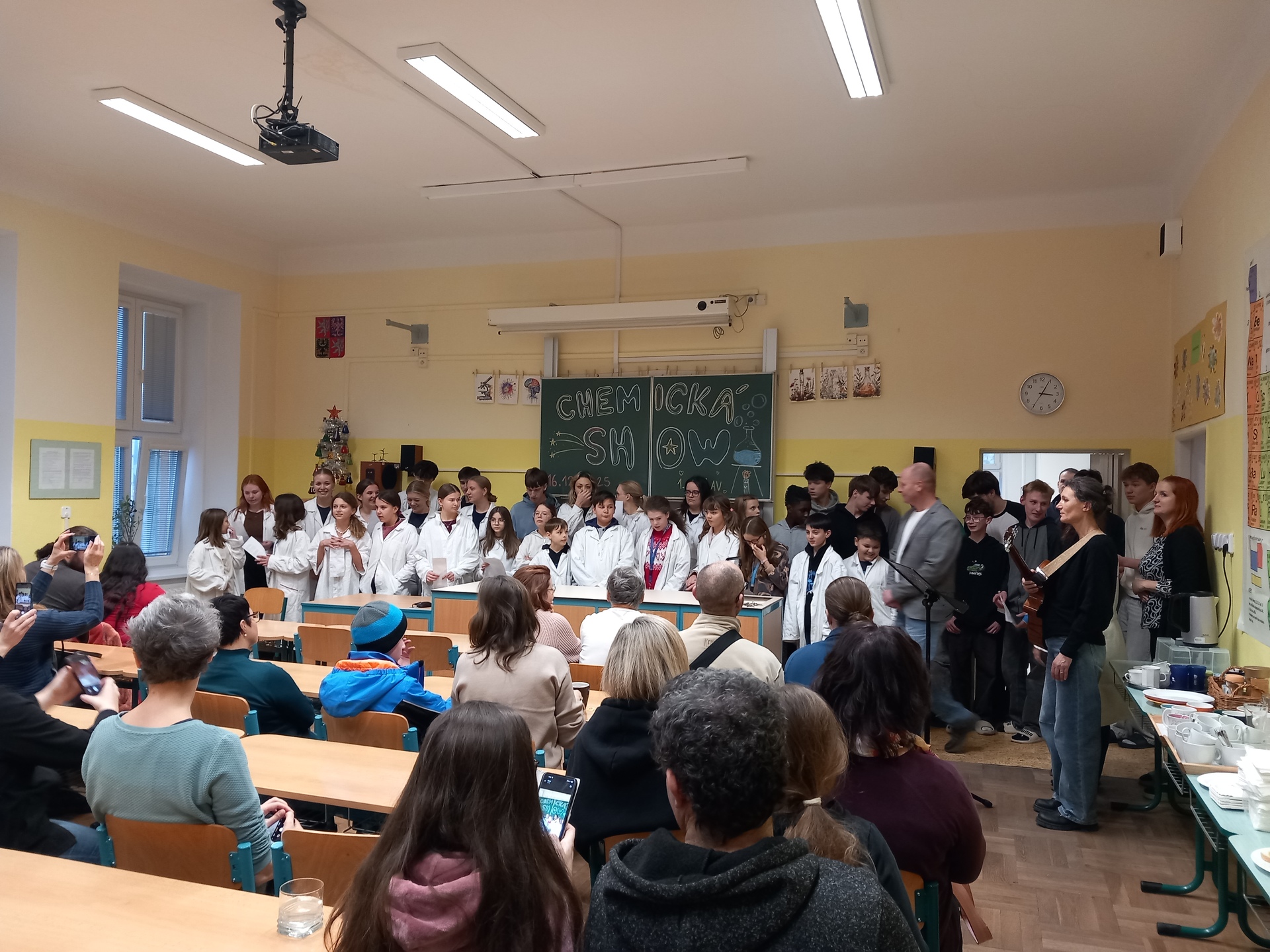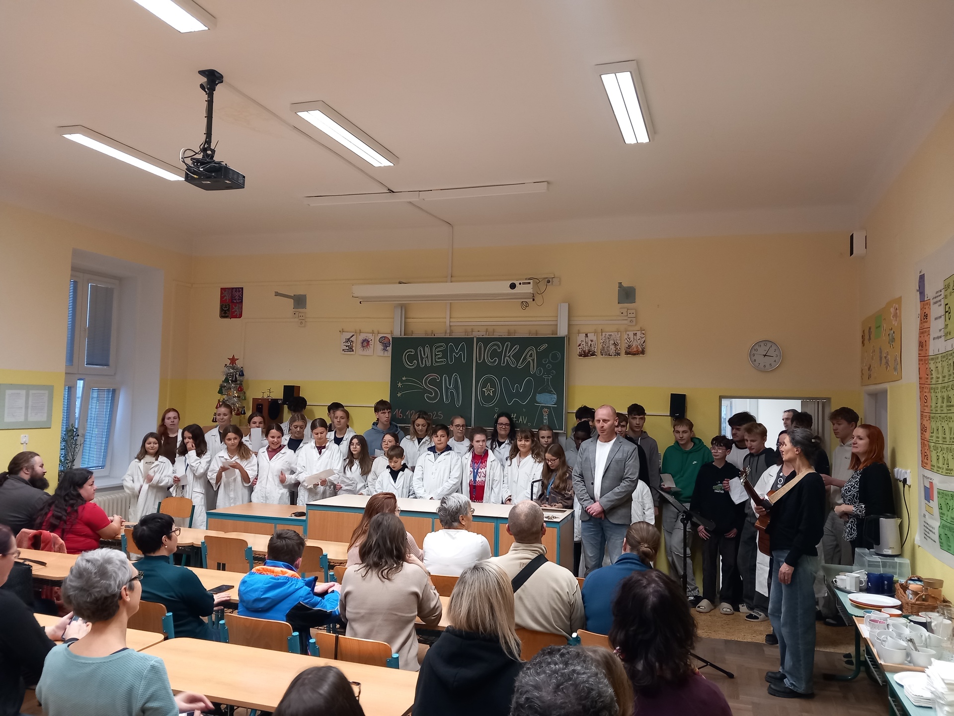 Příjemnou a slavnostní atmosféru celého odpoledne navodila hned v úvodu píseň o chemii, kterou se žáky nacvičila paní učitelka Petra Burdová. Ta doprovodila žáky hrou na kytaru a dodala tak vystoupení jedinečný a srdečný nádech.
