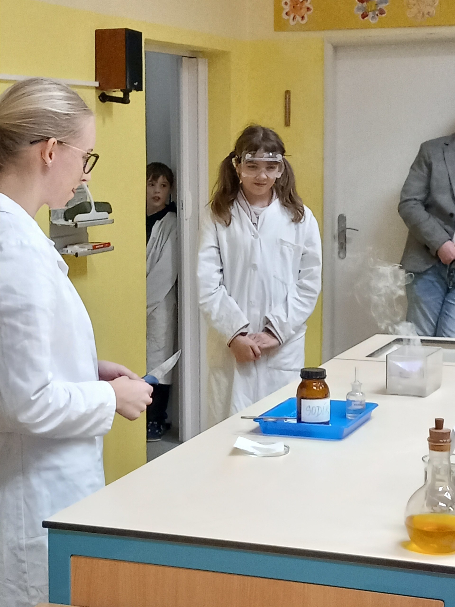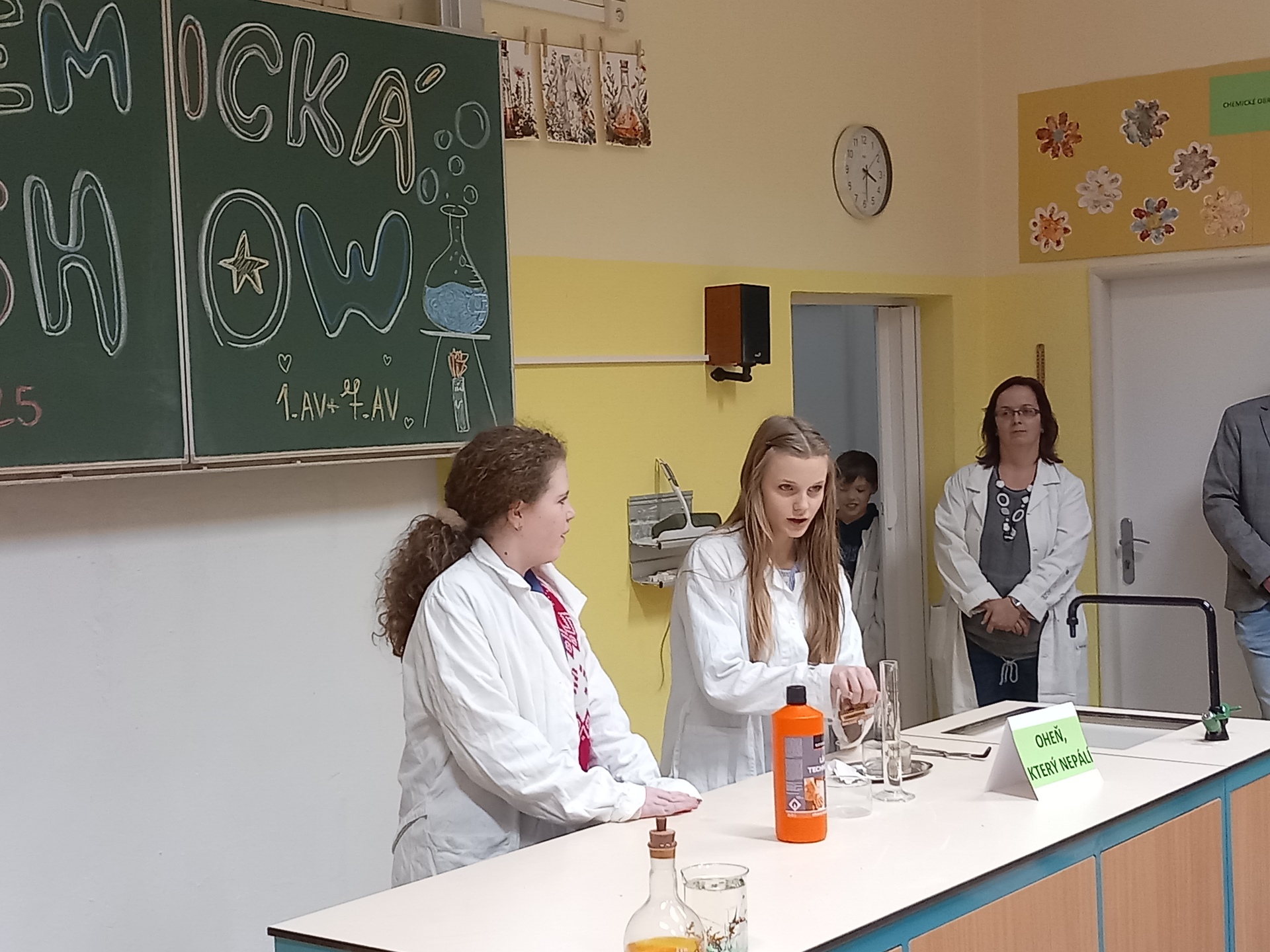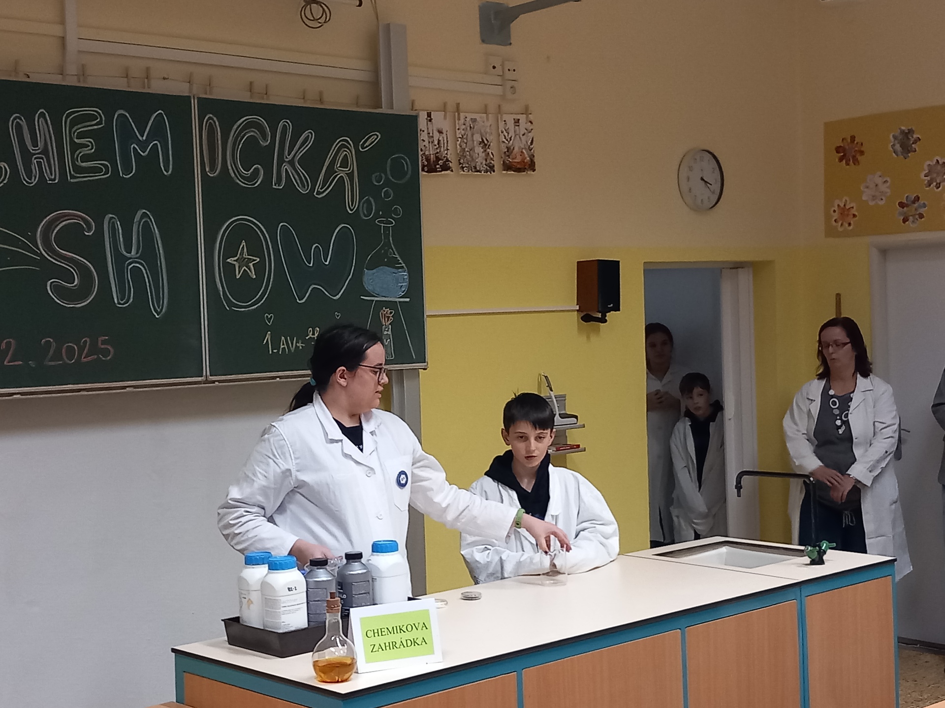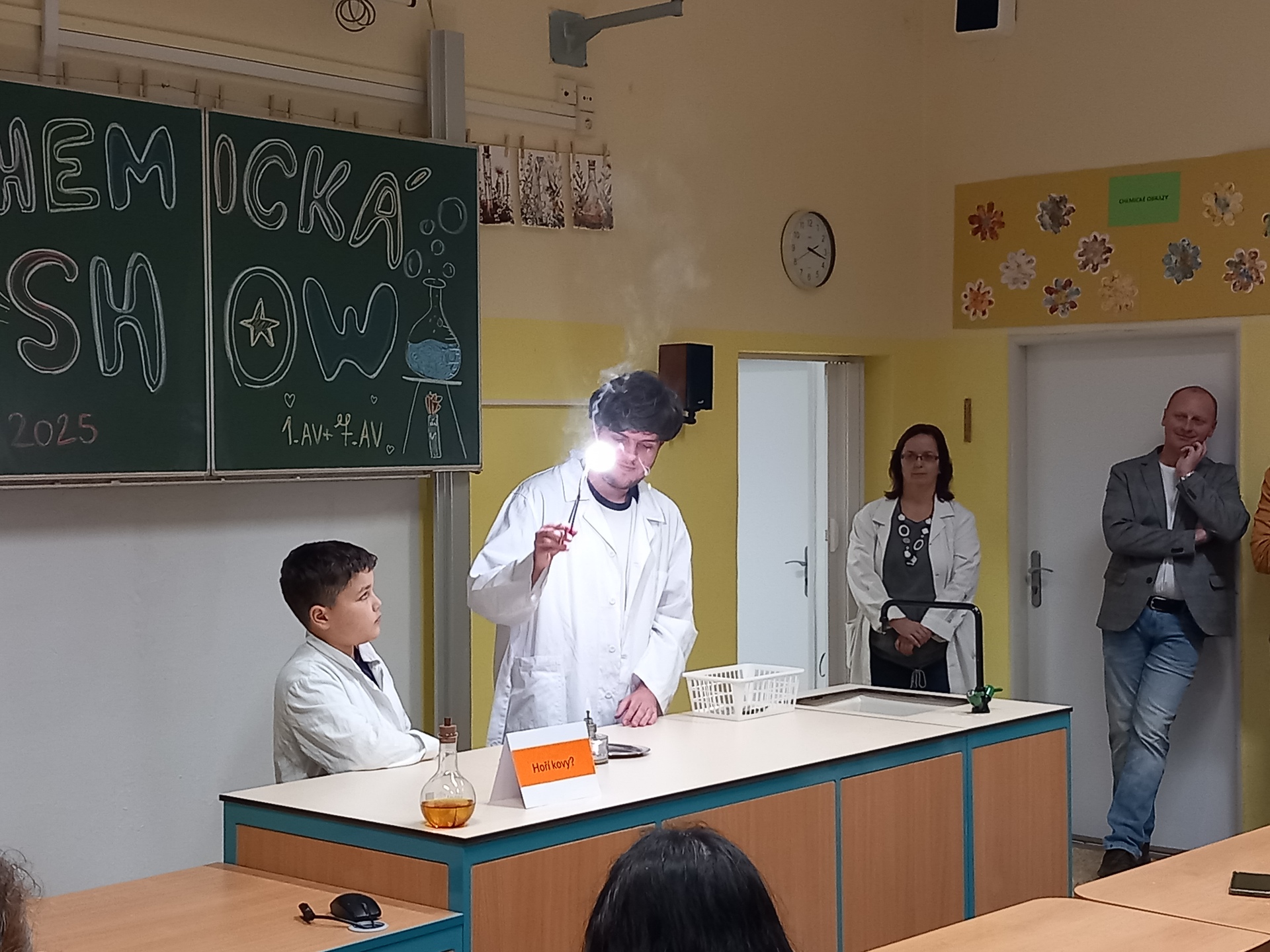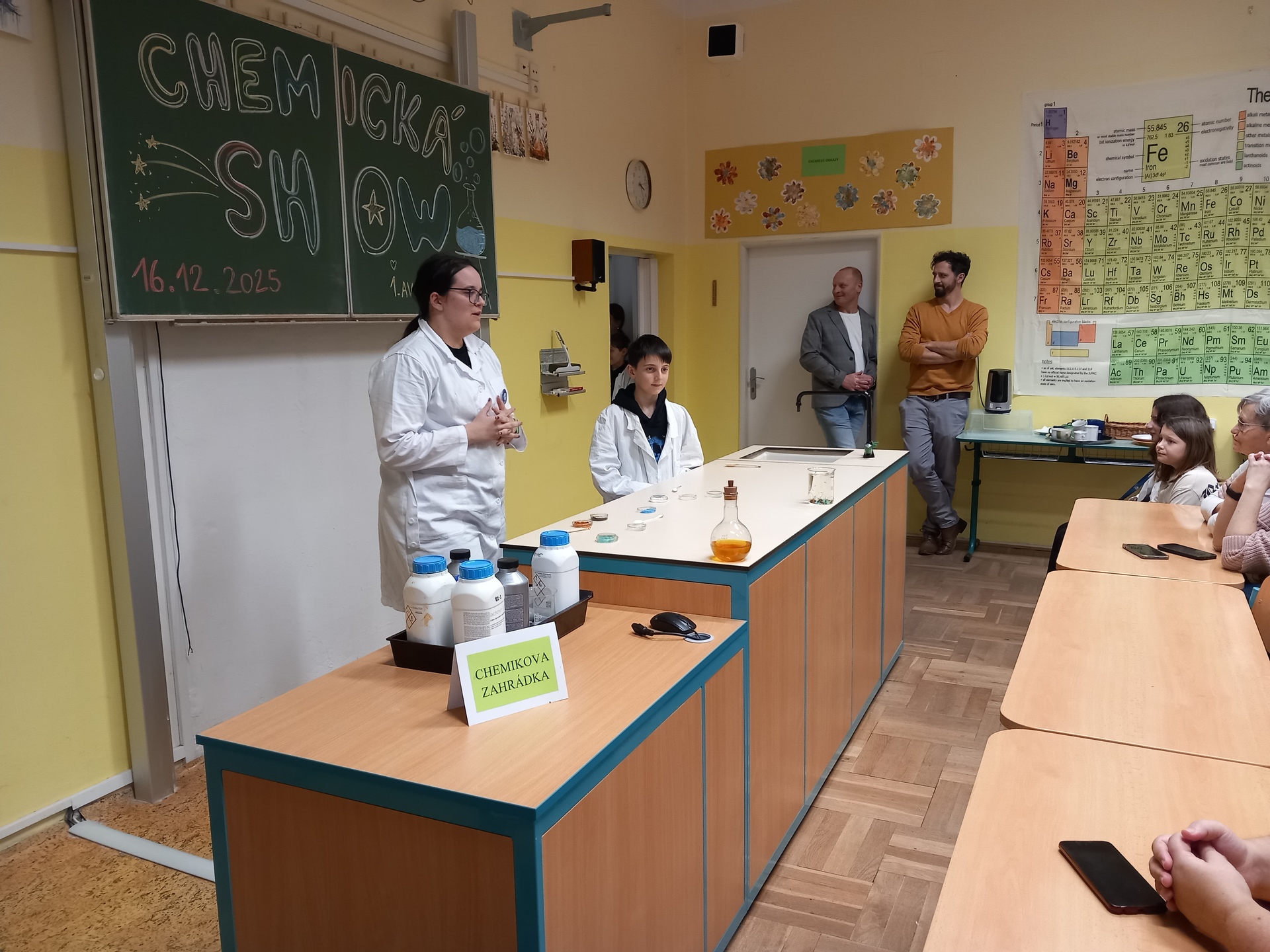 Příjemnou a slavnostní atmosféru celého odpoledne navodila hned v úvodu píseň o chemii, kterou se žáky nacvičila paní učitelka Petra Burdová. Ta doprovodila žáky hrou na kytaru a dodala tak vystoupení jedinečný a srdečný nádech.