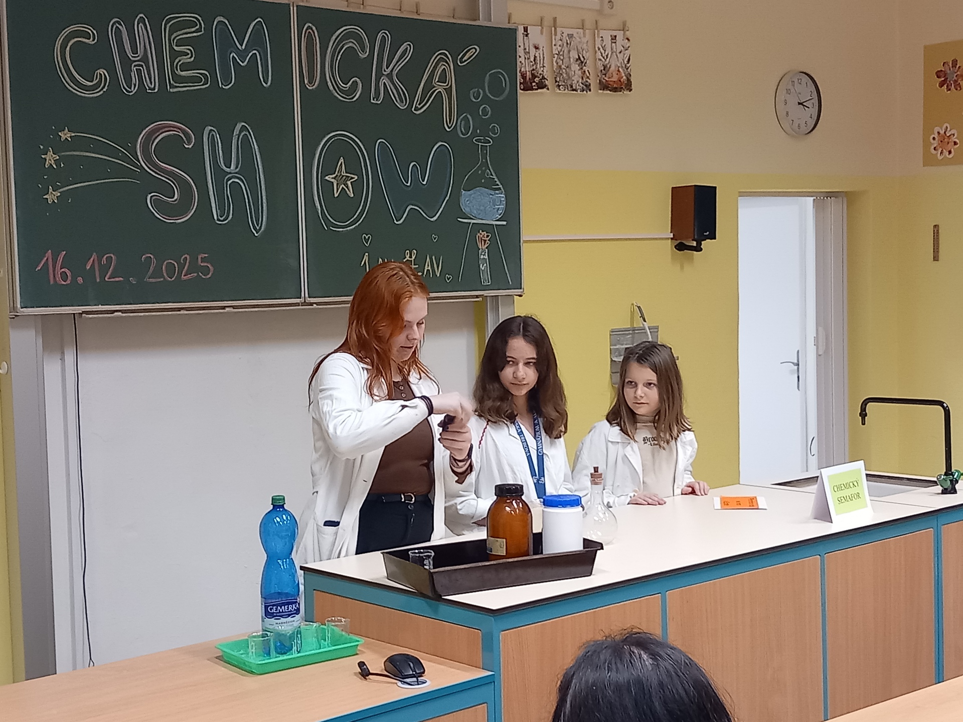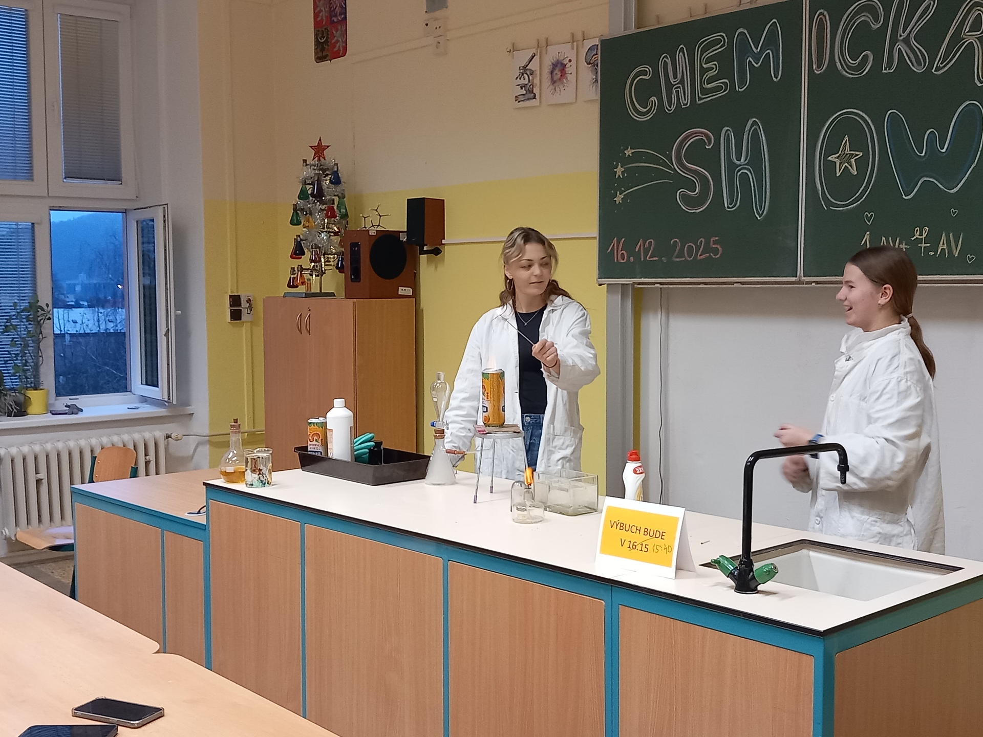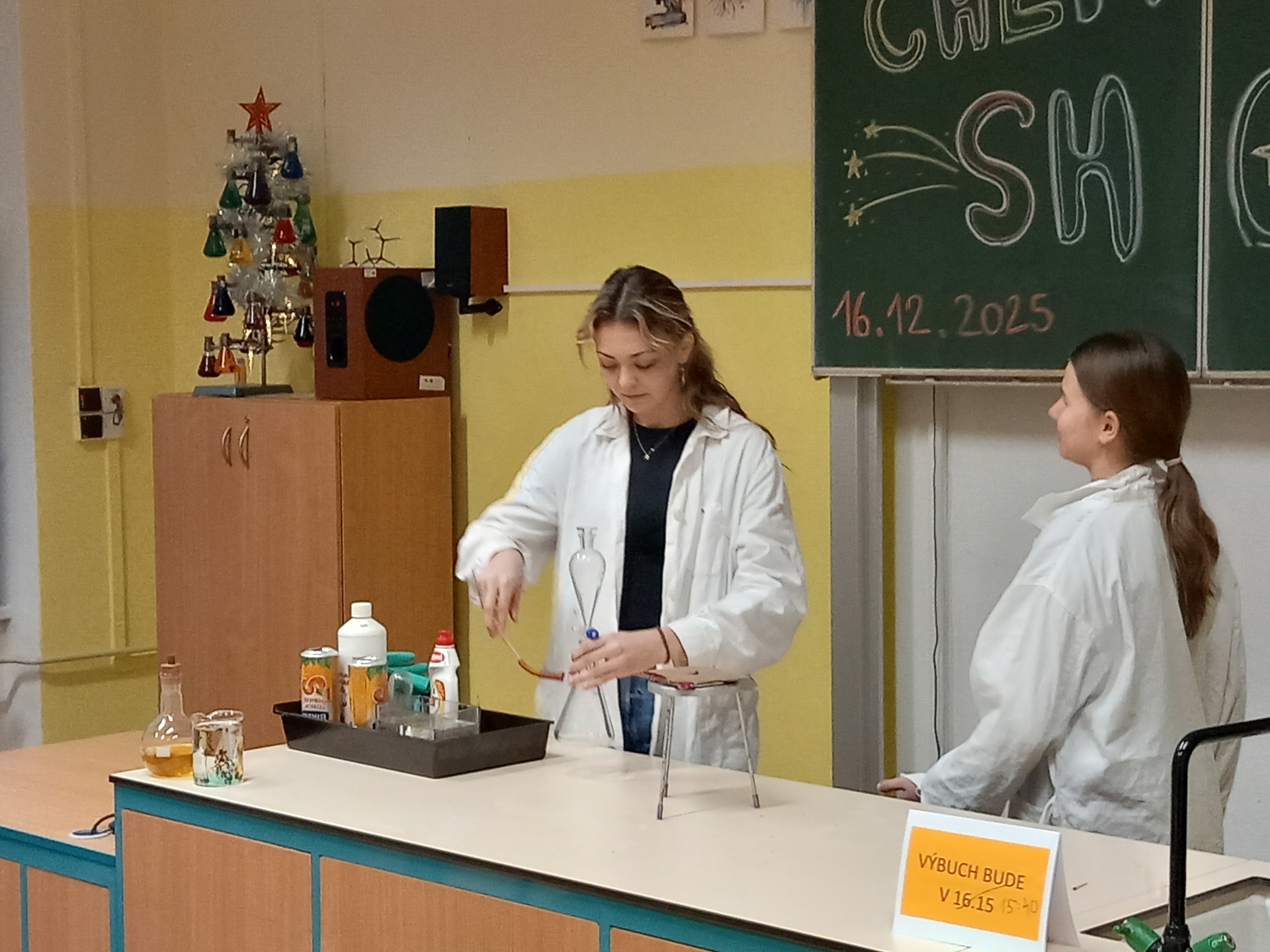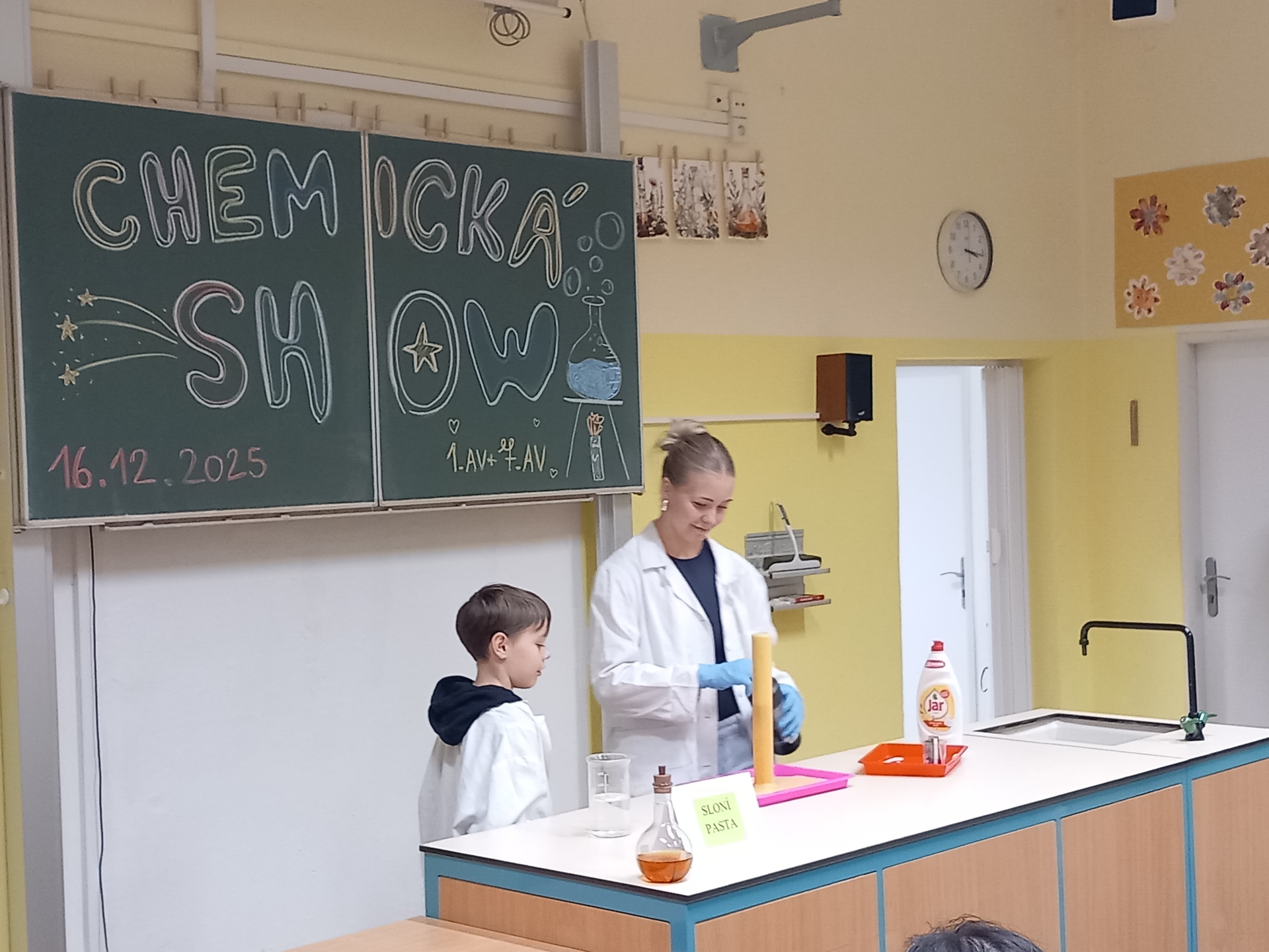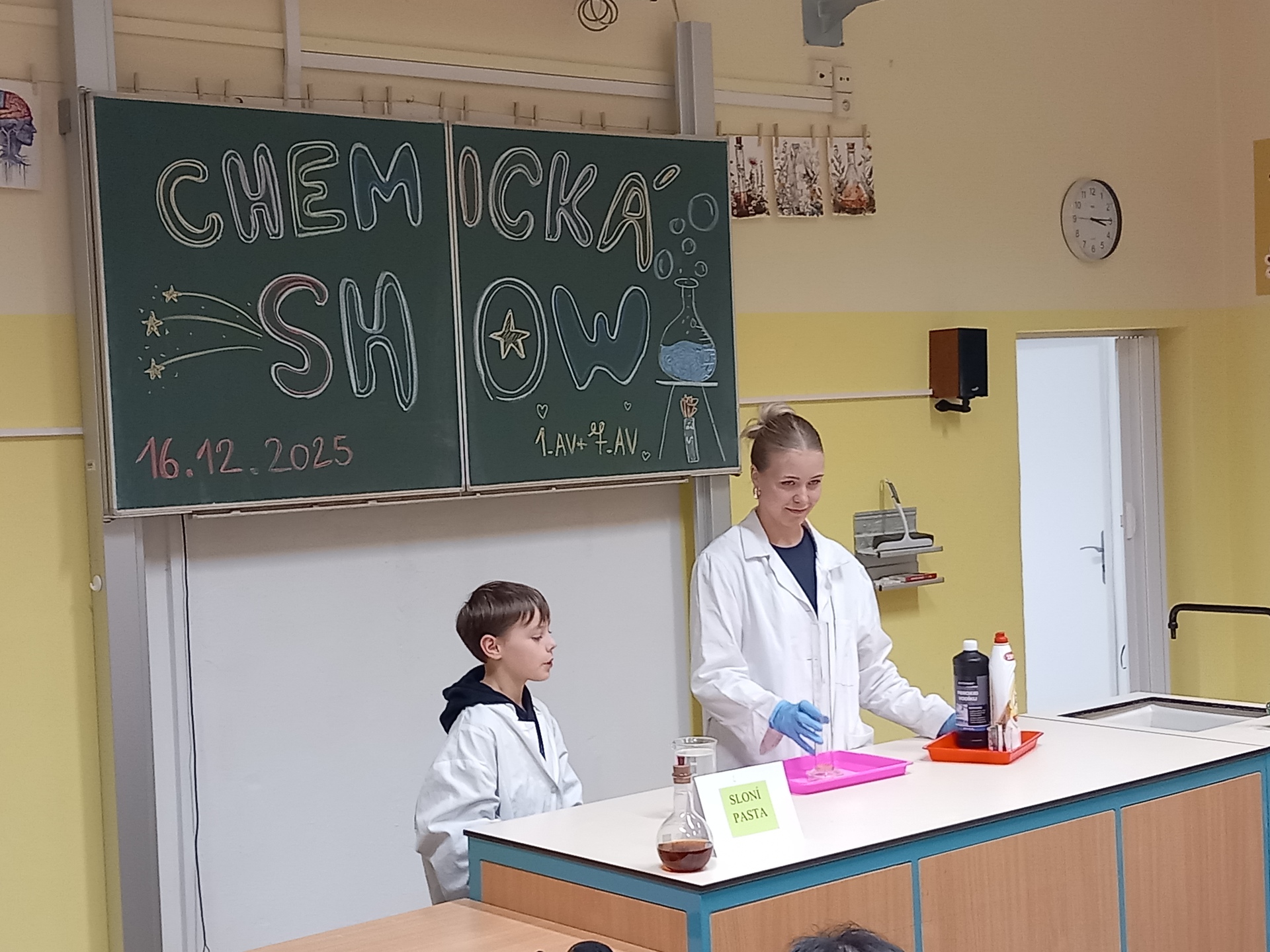 V úterý 16. prosince 2025 se v naší škole odehrálo výjimečné odpoledne. Nejmladší žáci – primánci – spojili své síly s téměř nejstaršími spolužáky ze septimy a společně připravili chemickou a fyzikální show pro rodiče, učitele i kamarády.