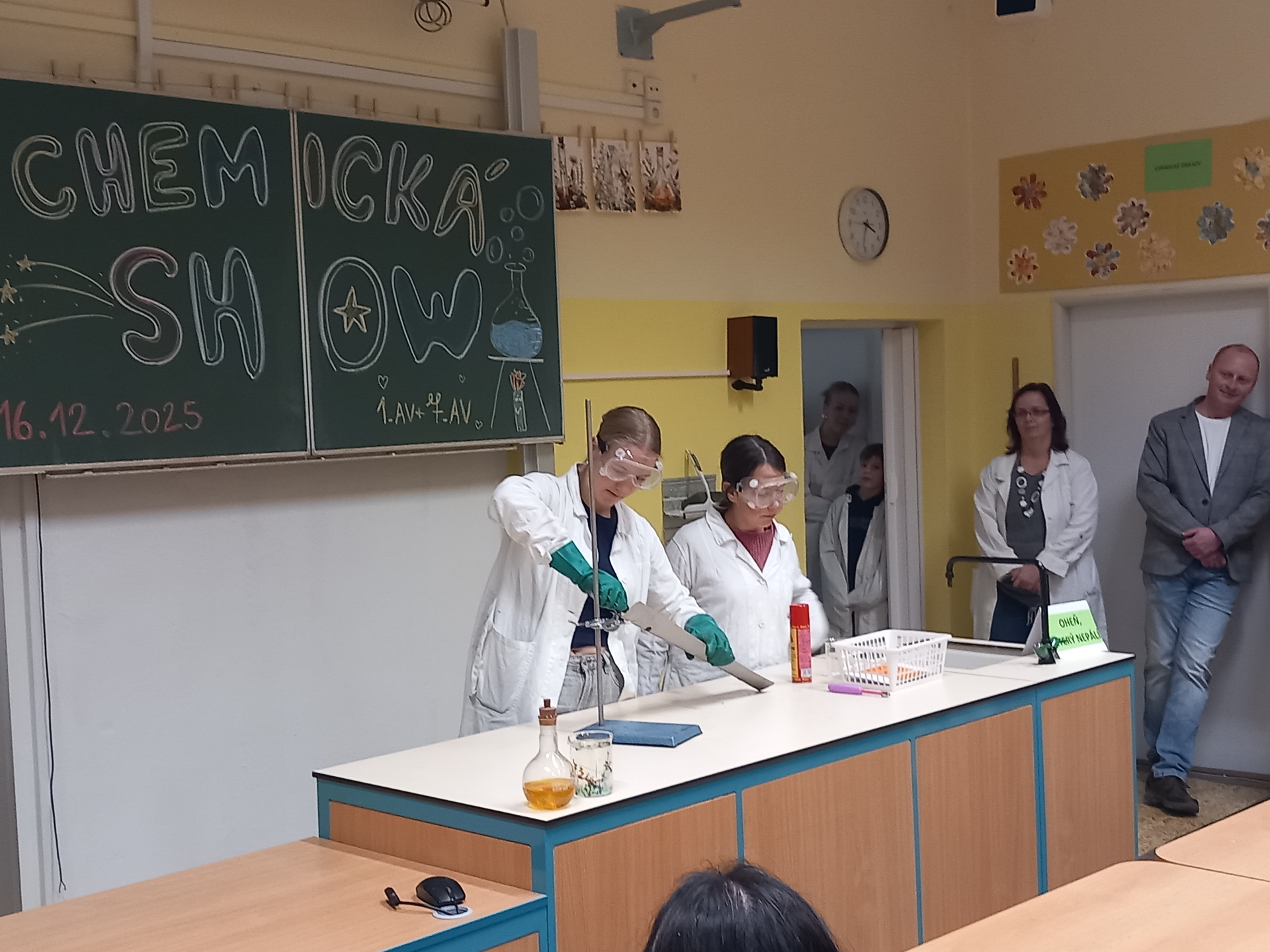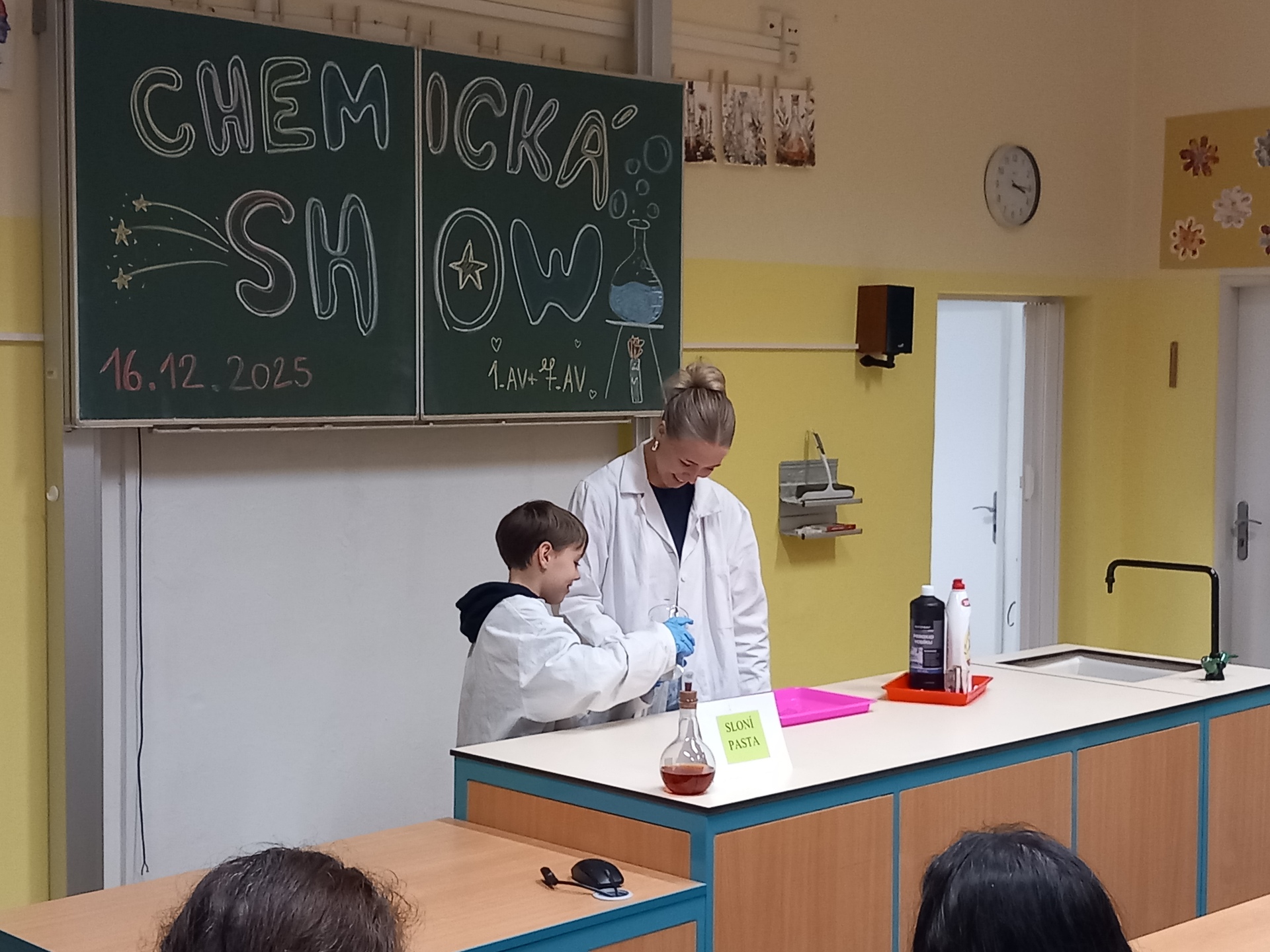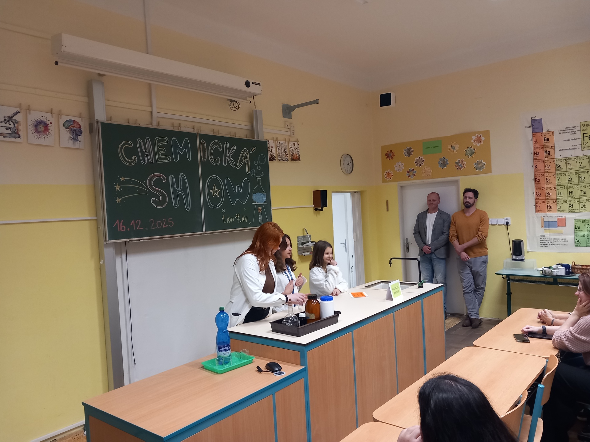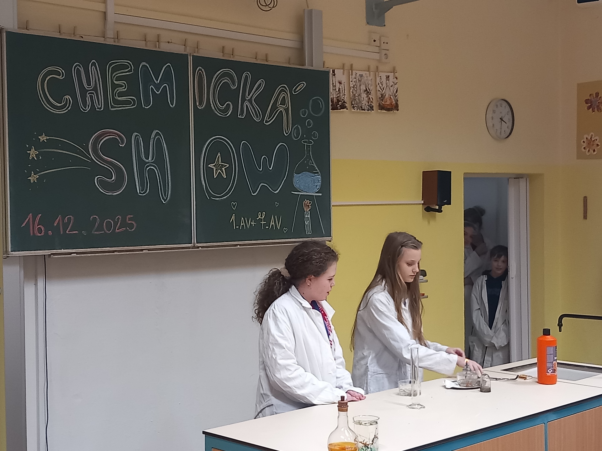 V úterý 16. prosince 2025 se v naší škole odehrálo výjimečné odpoledne. Nejmladší žáci – primánci – spojili své síly s téměř nejstaršími spolužáky ze septimy a společně připravili chemickou a fyzikální show pro rodiče, učitele i kamarády.