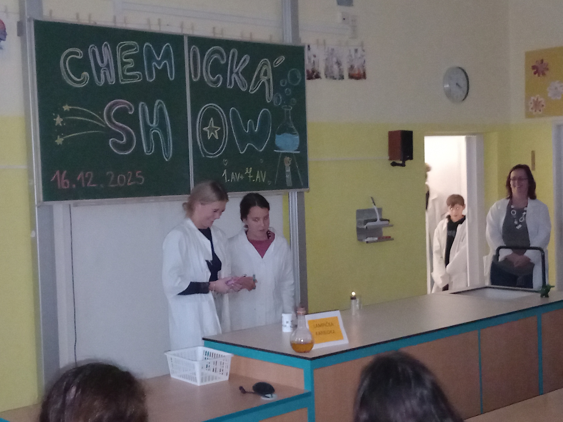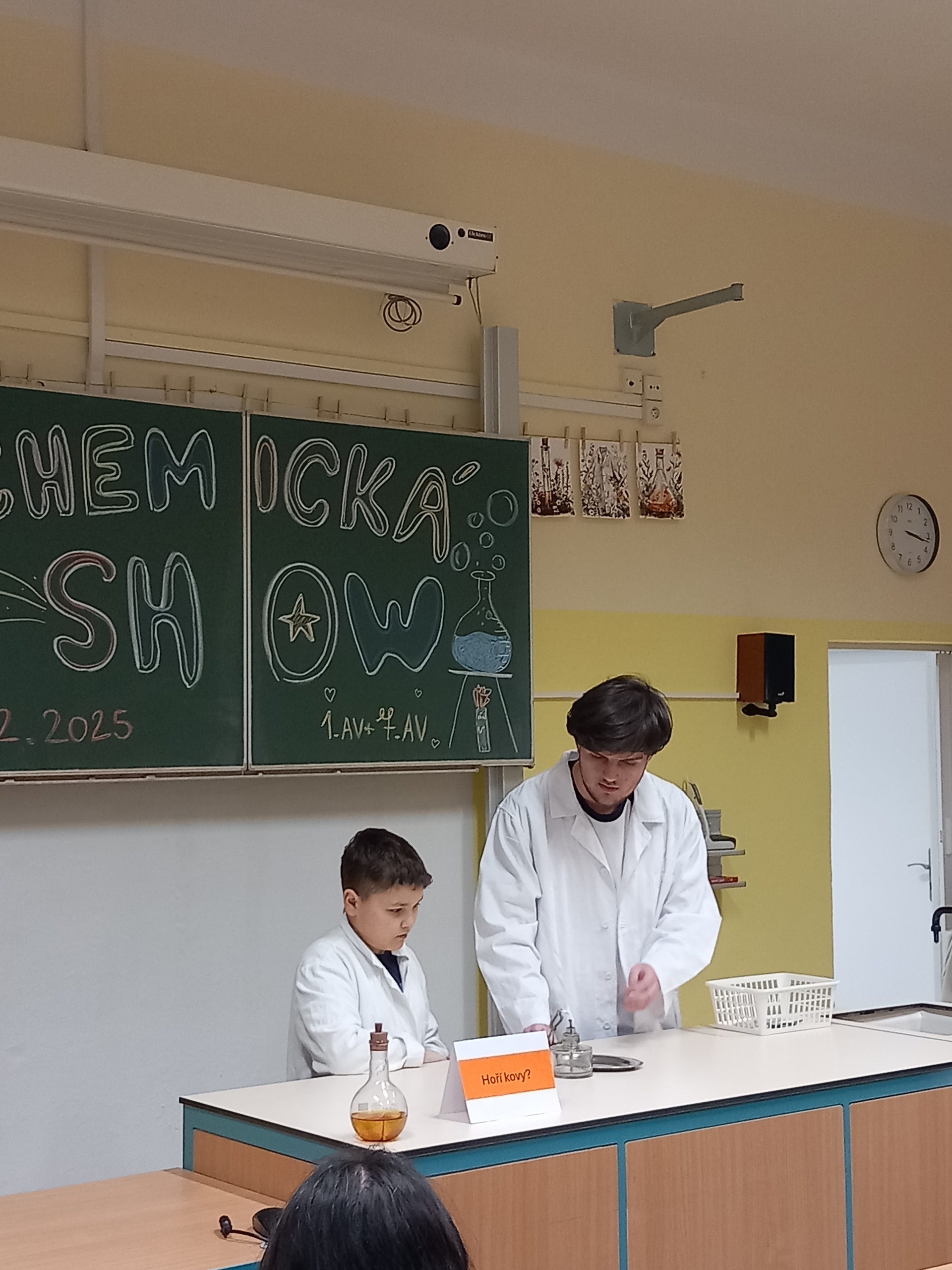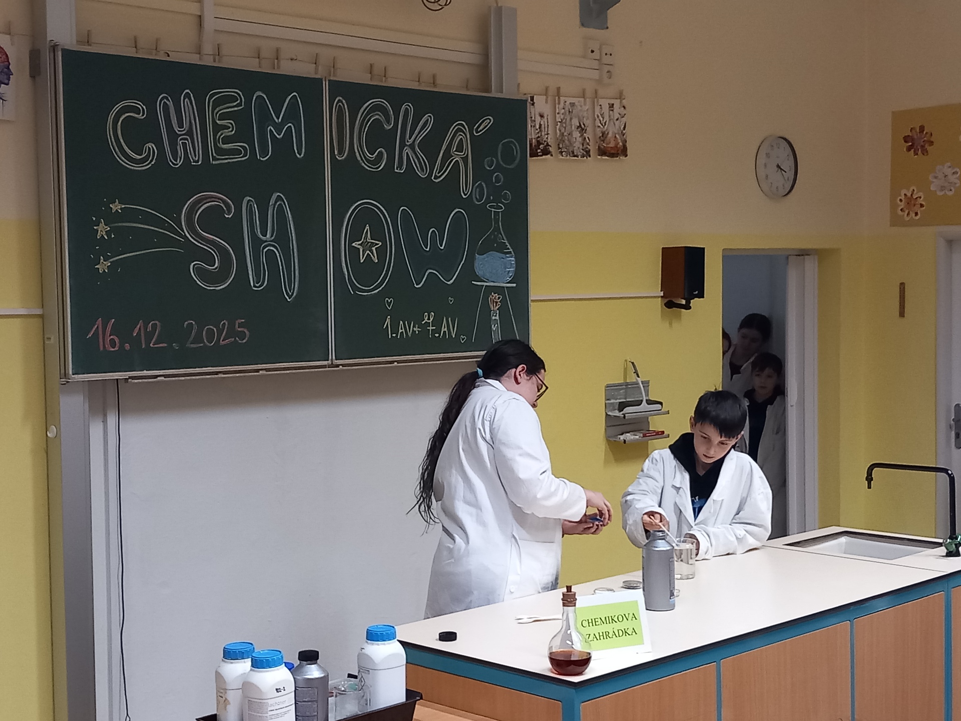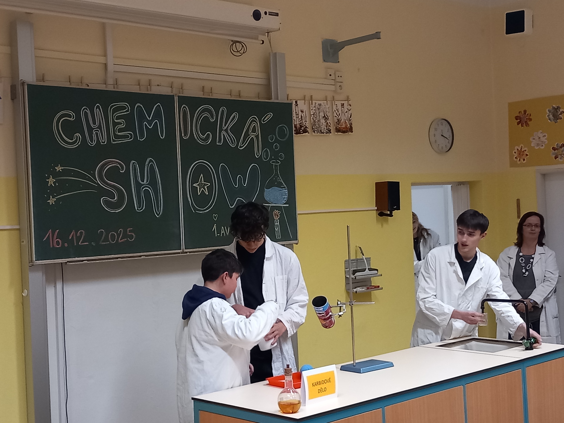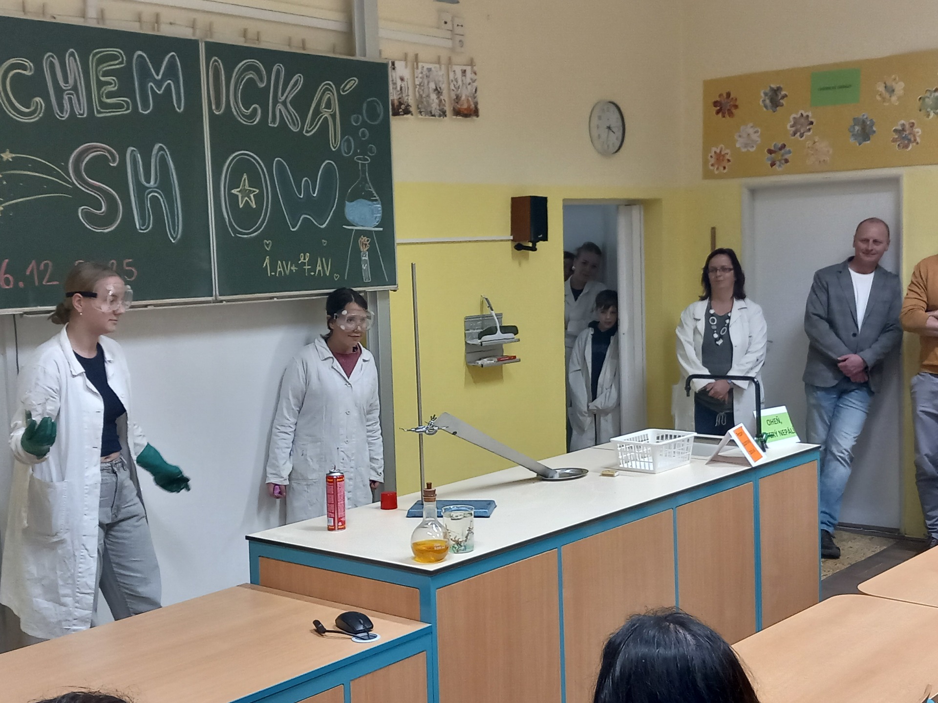 V úterý 16. prosince 2025 se v naší škole odehrálo výjimečné odpoledne. Nejmladší žáci – primánci – spojili své síly s téměř nejstaršími spolužáky ze septimy a společně připravili chemickou a fyzikální show pro rodiče, učitele i kamarády.