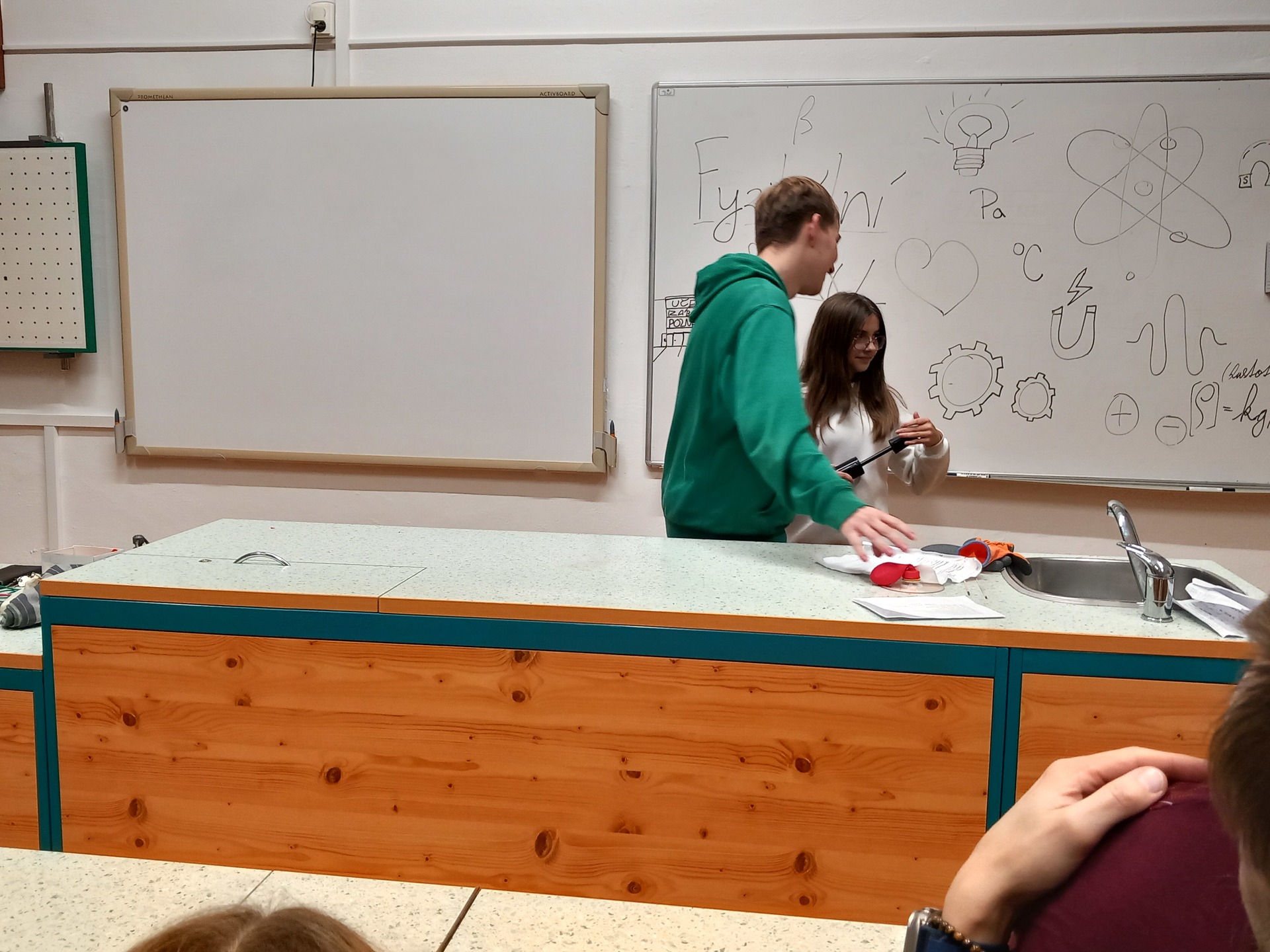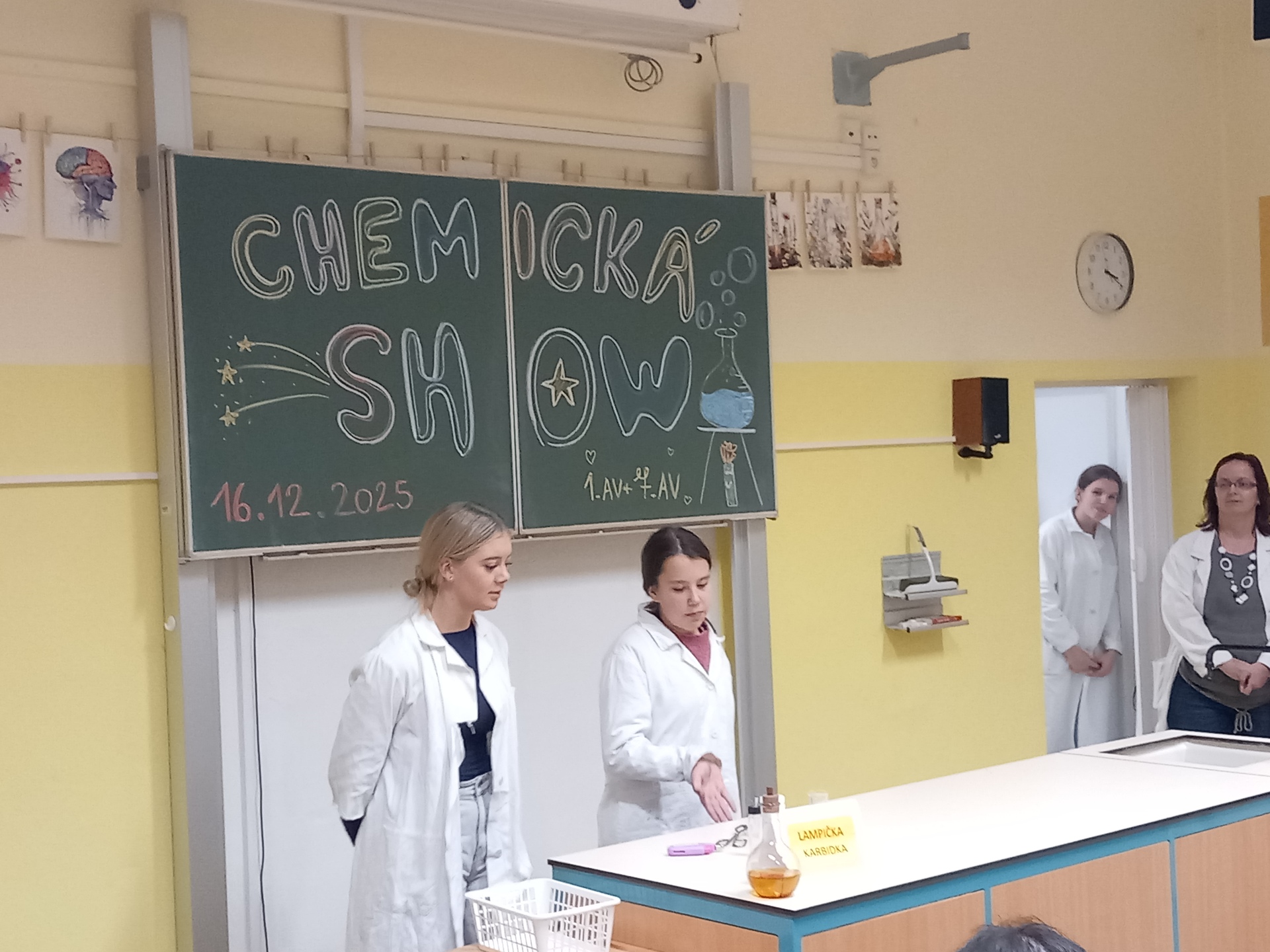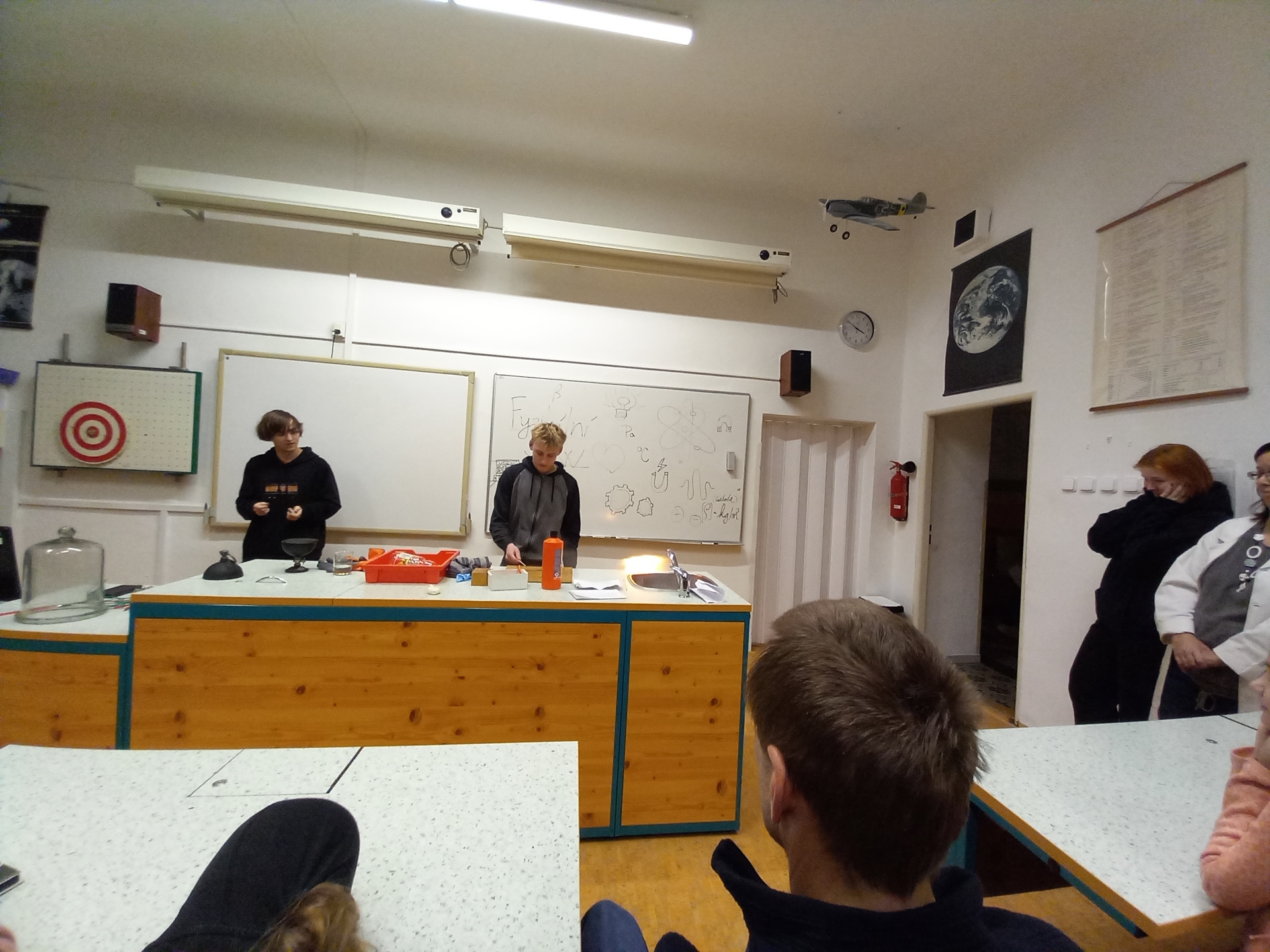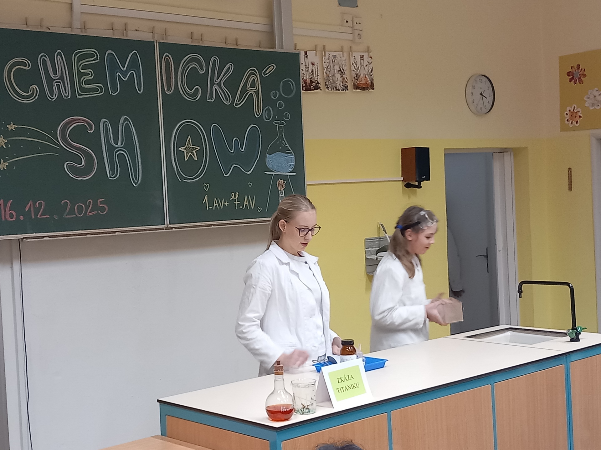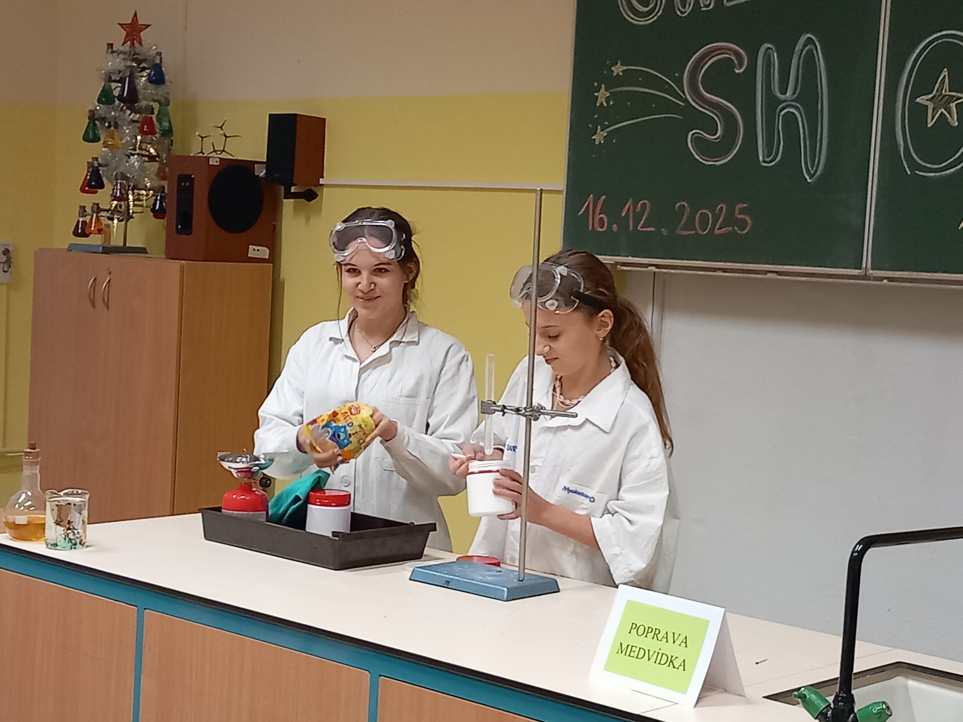 V úterý 16. prosince 2025 se v naší škole odehrálo výjimečné odpoledne. Nejmladší žáci – primánci – spojili své síly s téměř nejstaršími spolužáky ze septimy a společně připravili chemickou a fyzikální show pro rodiče, učitele i kamarády.