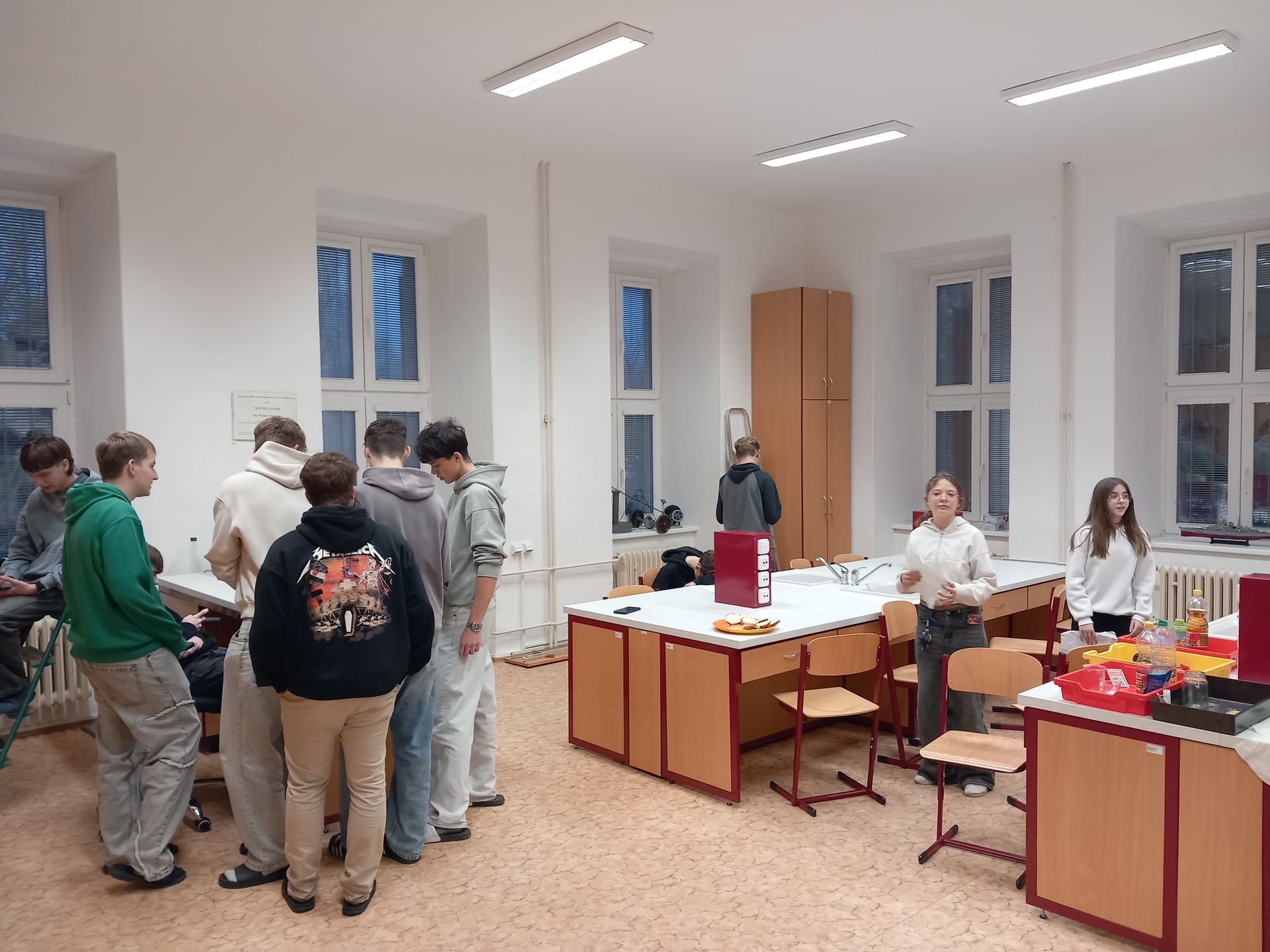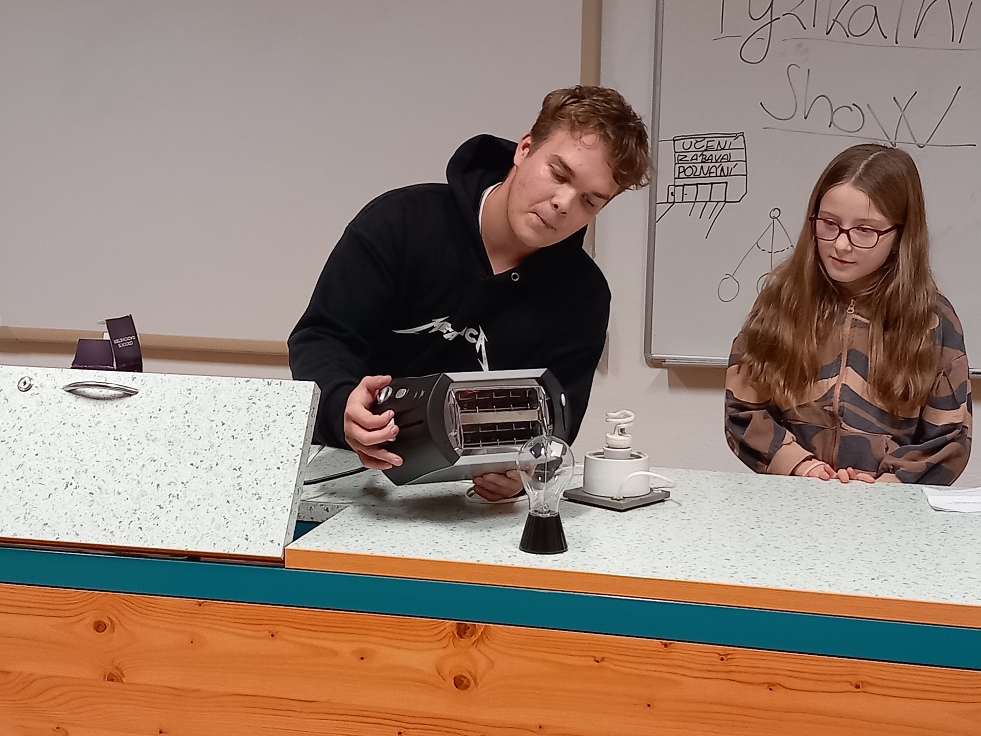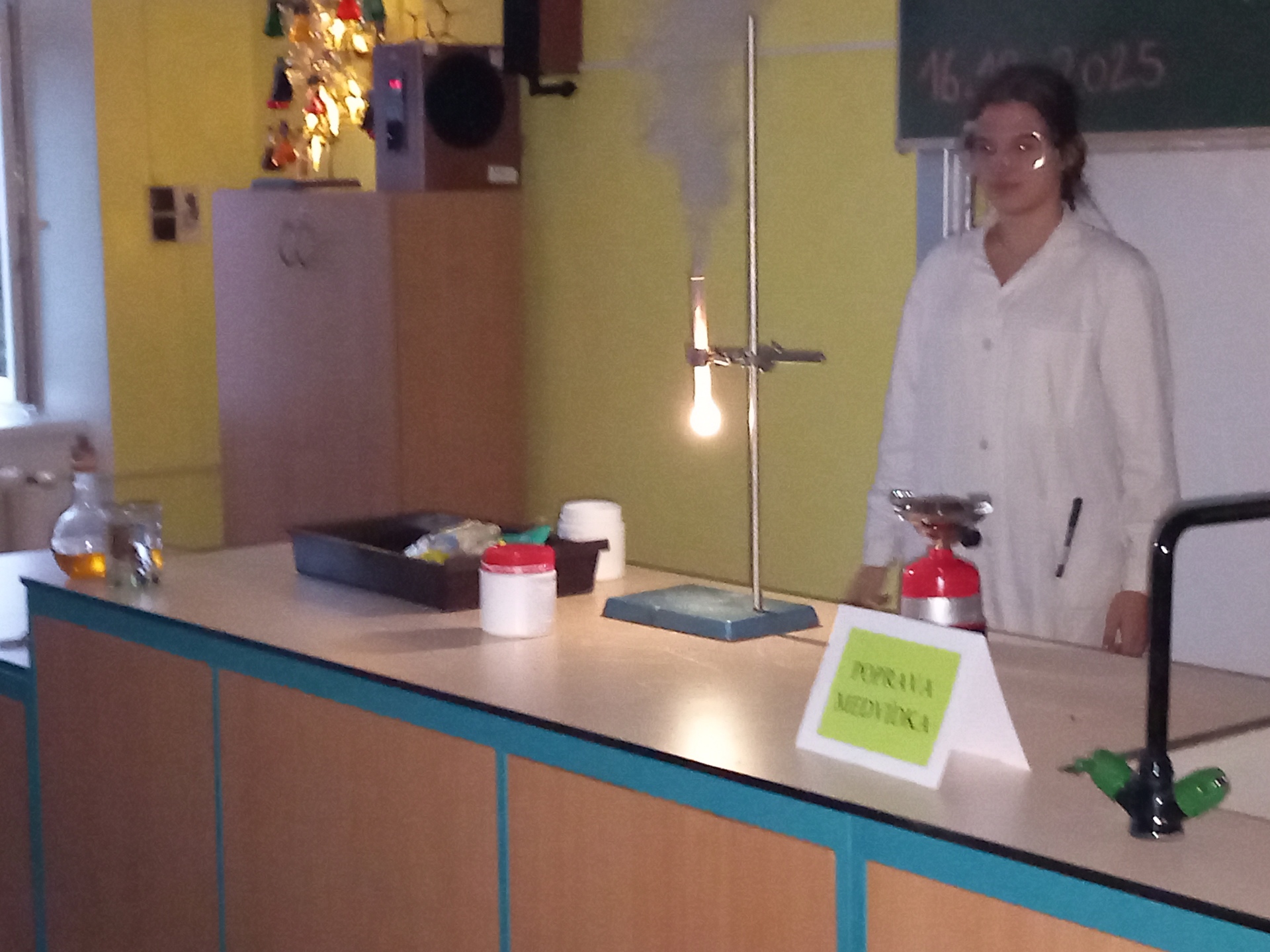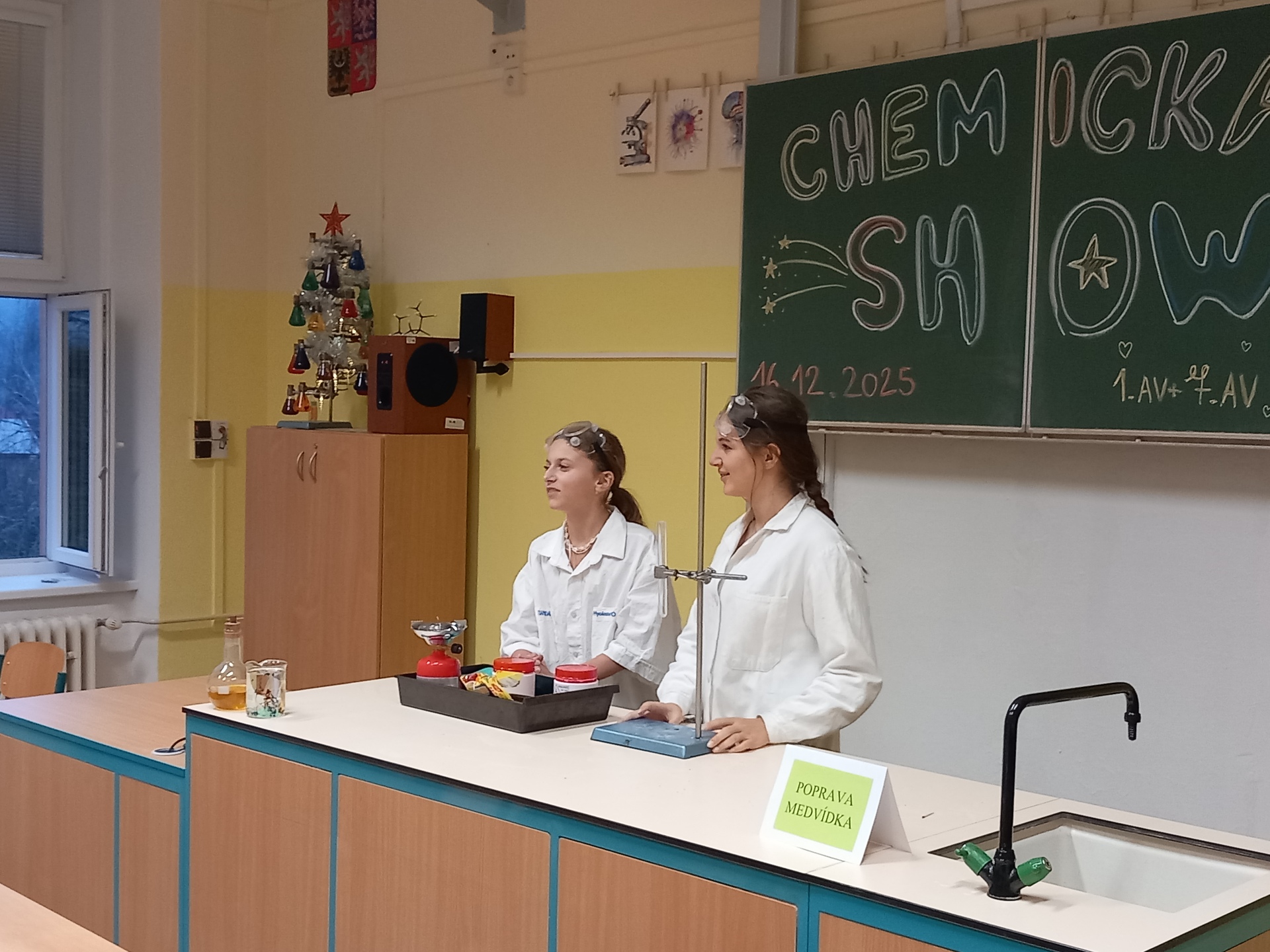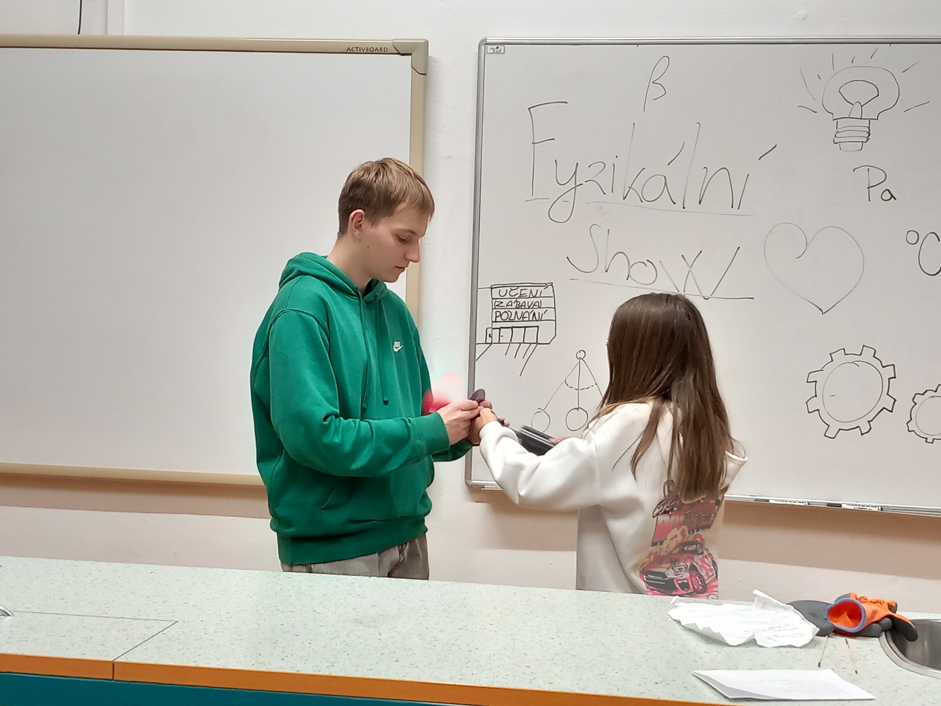 V úterý 16. prosince 2025 se v naší škole odehrálo výjimečné odpoledne. Nejmladší žáci – primánci – spojili své síly s téměř nejstaršími spolužáky ze septimy a společně připravili chemickou a fyzikální show pro rodiče, učitele i kamarády.