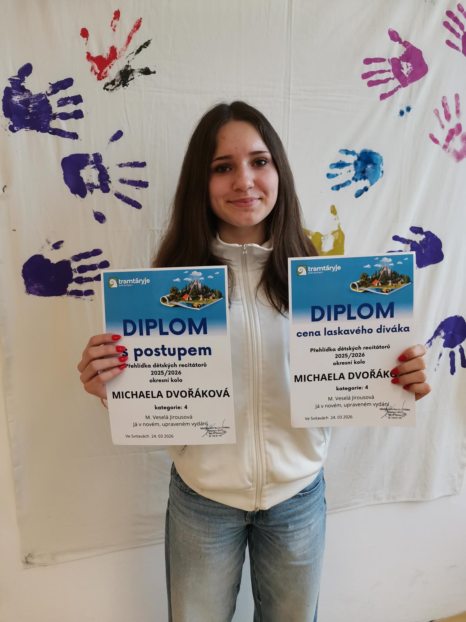 Včera se ve svitavském divadle Trám konalo okresní kolo recitační soutěže. Studentka kvarty Michaela Dvořáková v něm získala skvělé první místo a zároveň postup do krajského kola.