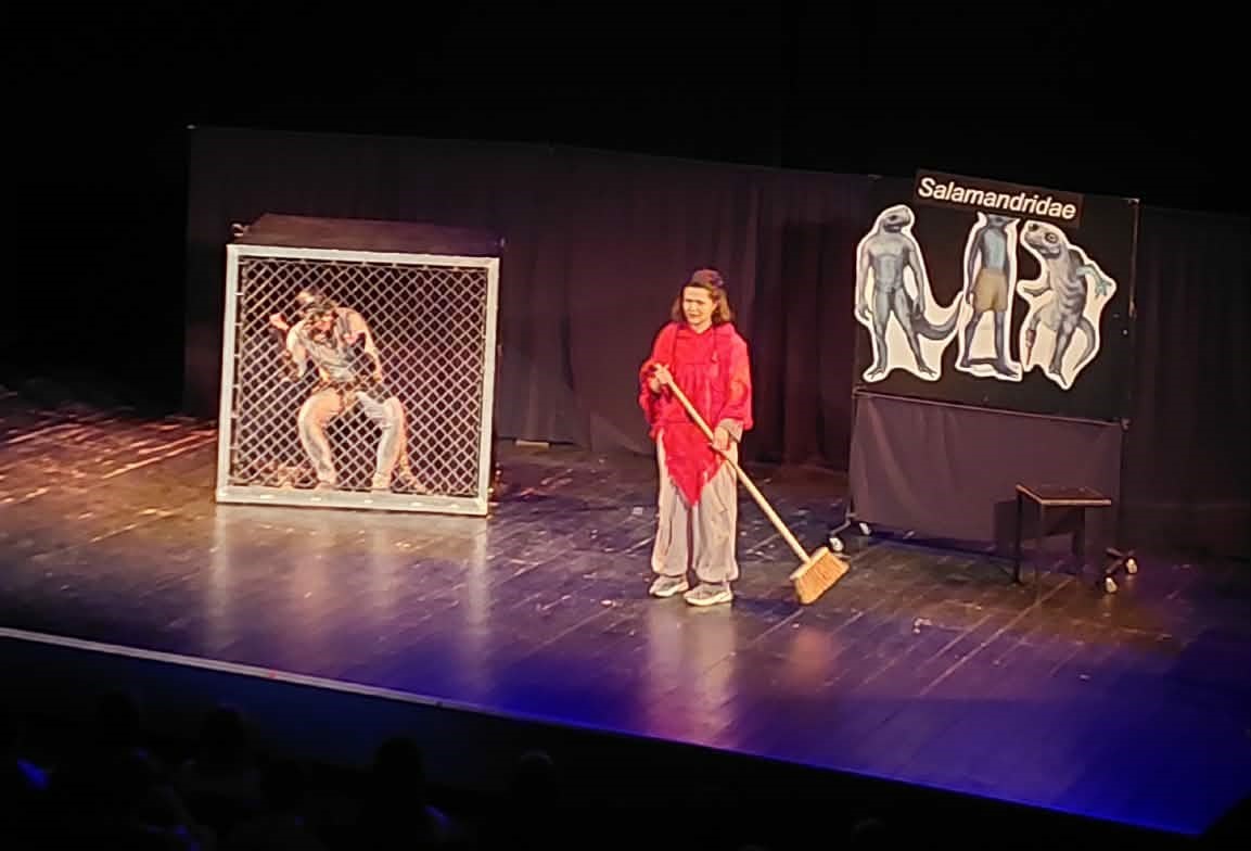 Žáci druhých a třetích ročníků gymnázia i lycea zhlédli divadelní adaptaci tradičního českého díla v netradiční úpravě. Byla to Čapkova Válka s mloky v česko-anglické verzi pod názvem Hey people. Už název napovídá, že protagonisté představení nejen provedli diváky hlavní linií Čapkova příběhu, ale také se snažili předat mladým lidem stále aktuální výzvu k zodpovědnosti za vlastní jednání.