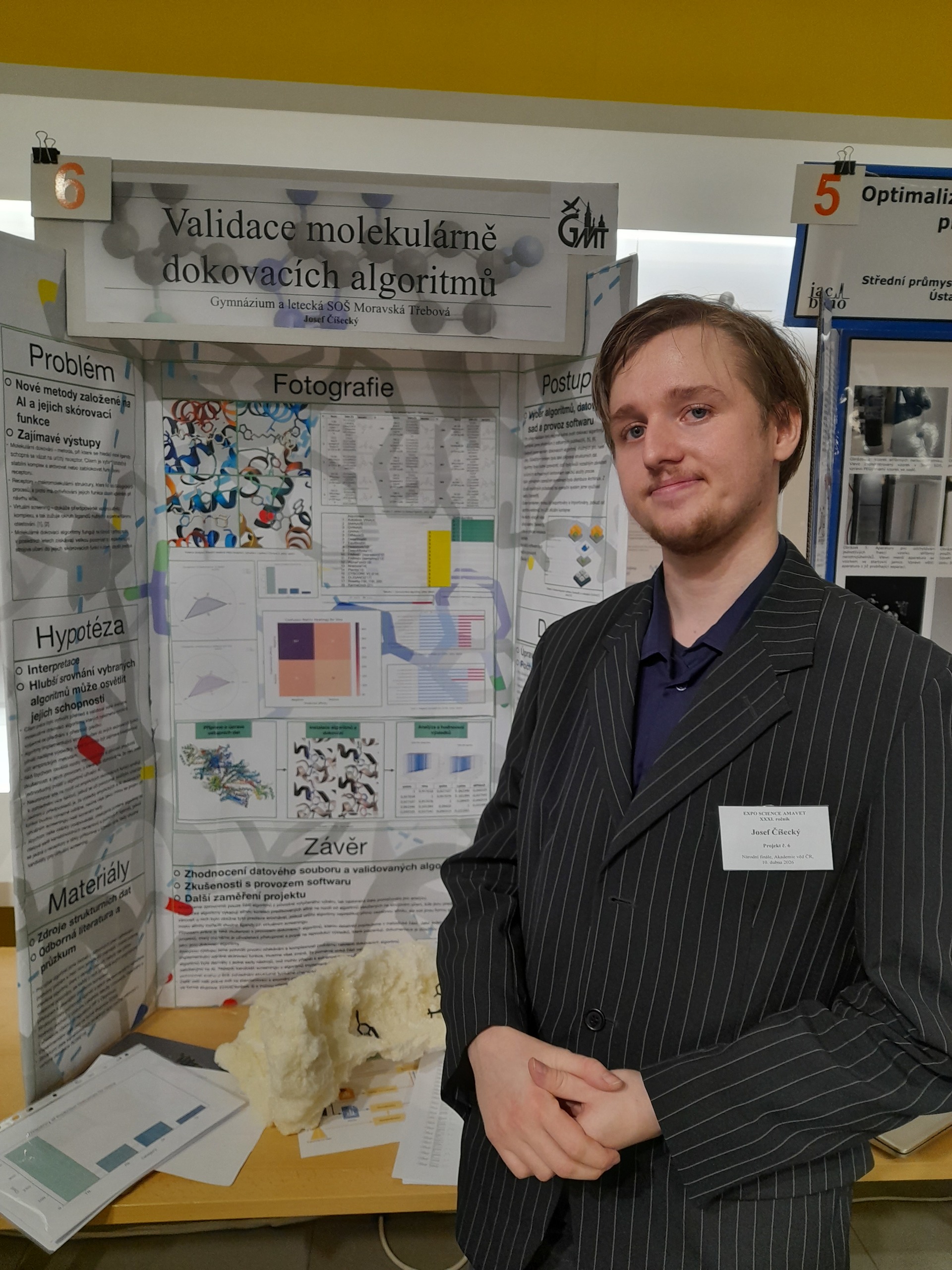 Žák naší školy Josef Číšecký zaznamenal úspěch se svým projektem „Validace molekulárně dokovacích algoritmů“ v okresním i krajském kole Soutěže vědeckých a technických projektů středoškolské mládeže EXPO SCIENCE AMAVET a postoupil tak do kola národního. To se konalo 10. dubna v Ústavu molekulární genetiky Akademie věd České republiky v Praze.