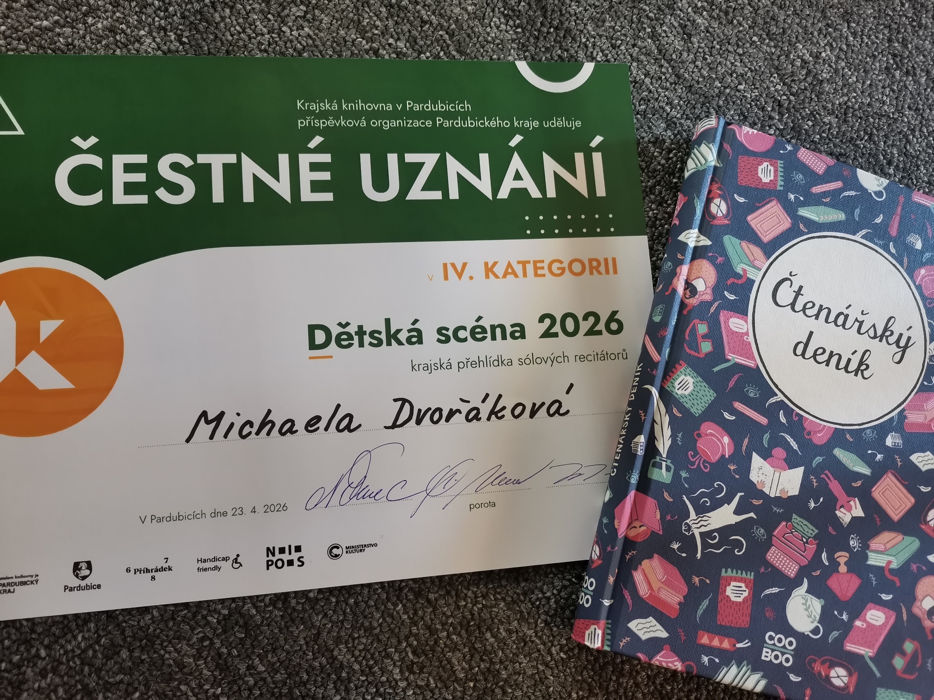 Včera se žákyně kvarty Michaela Dvořáková zúčastnila krajské postupové přehlídky sólových recitátorů v Pardubicích.