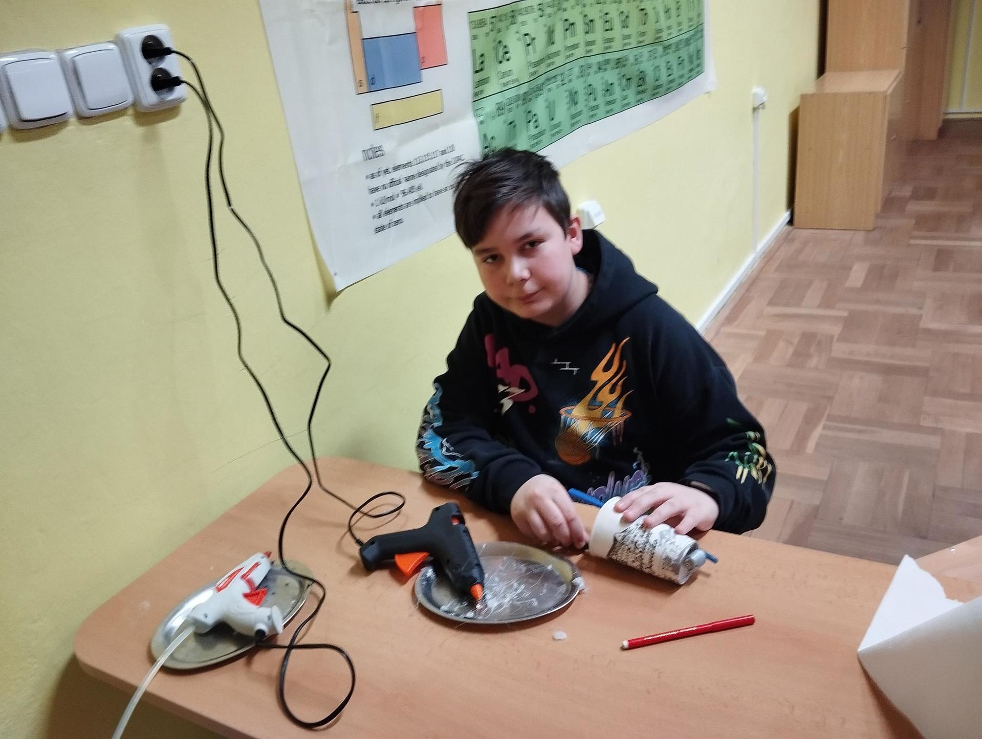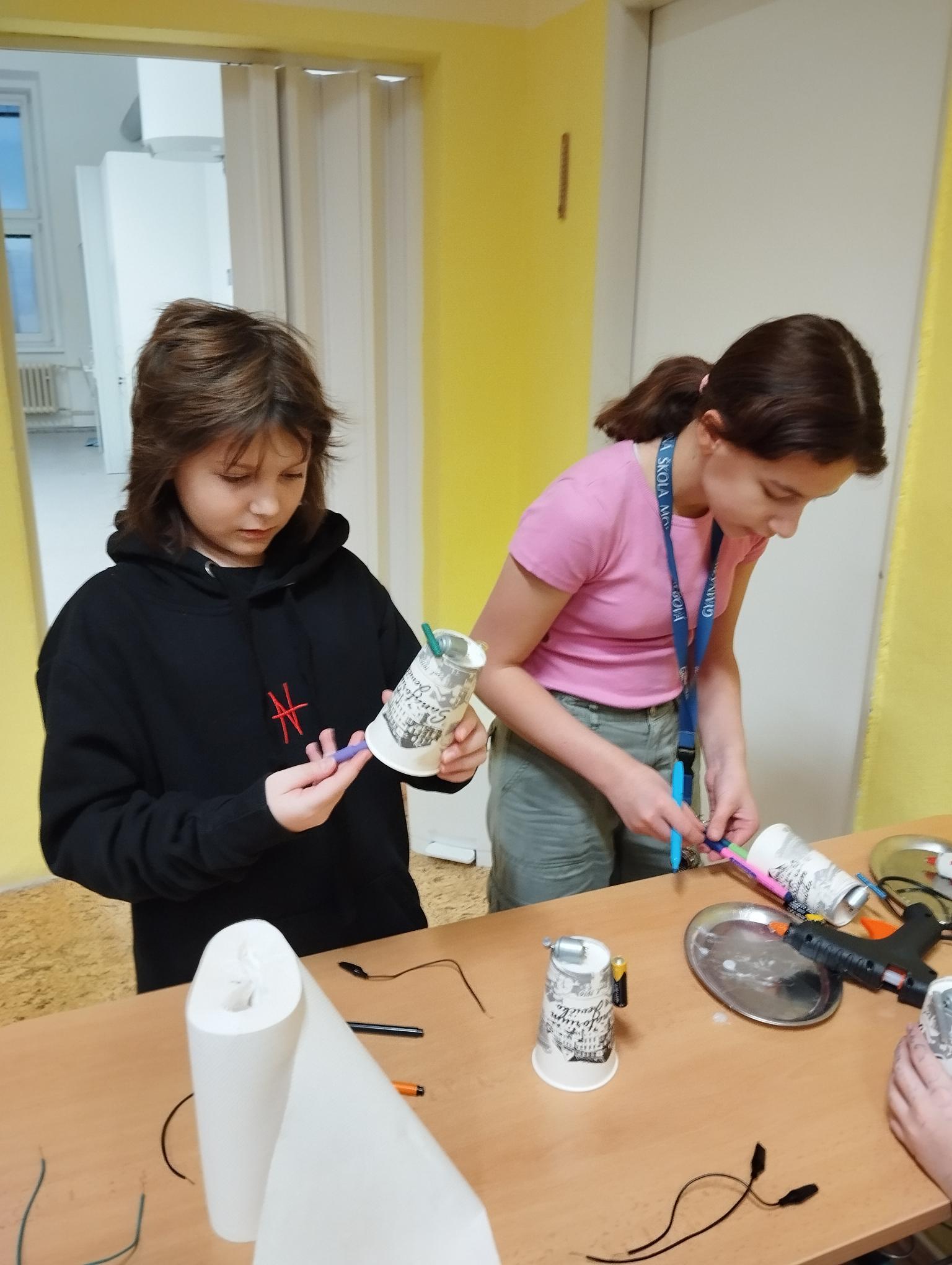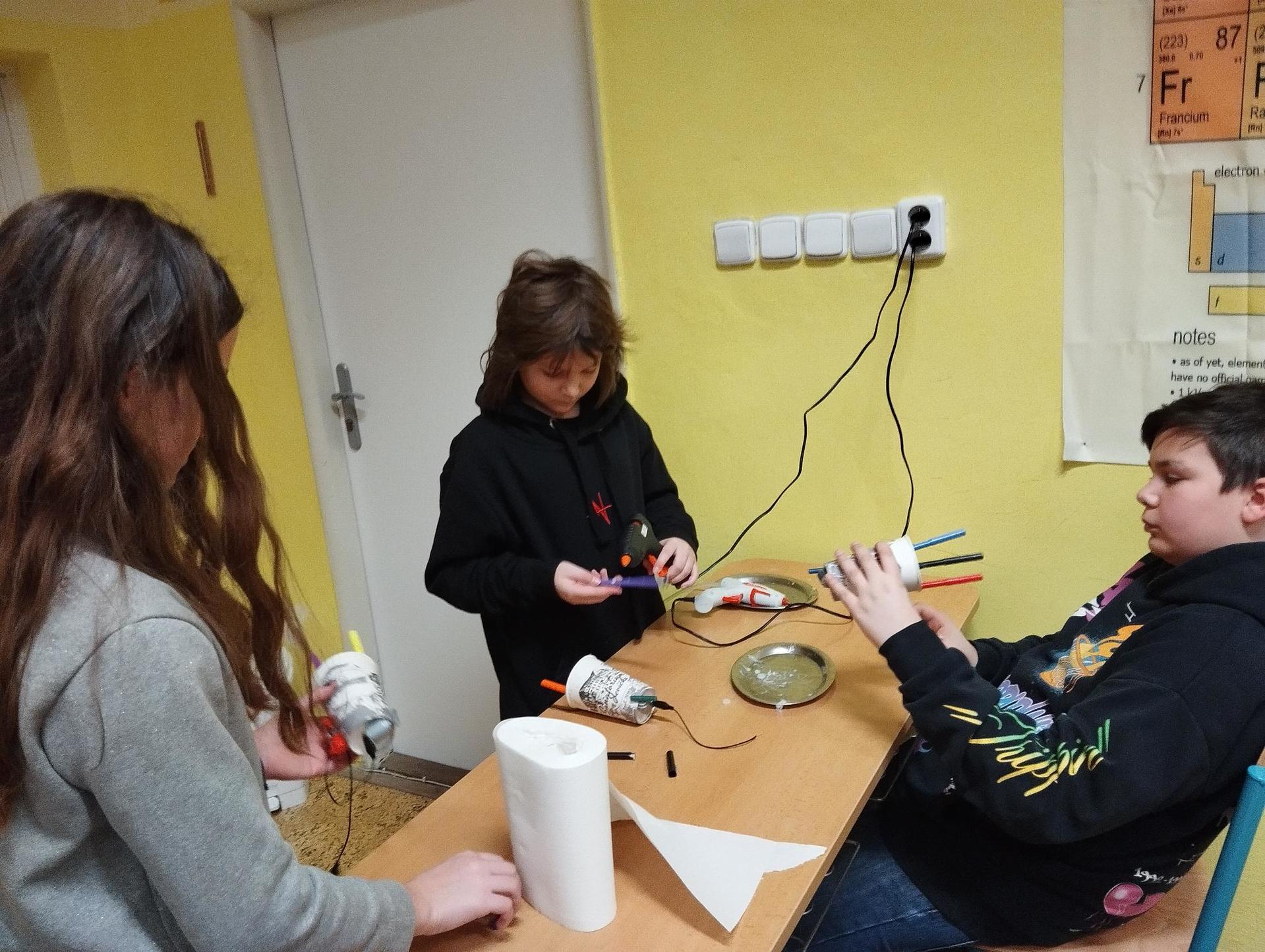 Nejprve jsme si vlastnoručně sestavili kreslicího robota s otáčivým „nosem“. Robot byl poháněn elektřinou z tužkové baterie napojené na malý motorek. Když se roztočil, začal po papíře vytvářet originální obrazce – každý robot kreslil trochu jinak, a tak vznikla pestrá galerie jedinečných výtvorů. Radost z fungujícího výrobku byla obrovská a zasloužená. Všem dětem se jejich robot podařil a nadšení z první „robotické“ zkušenosti bylo znát na první pohled.