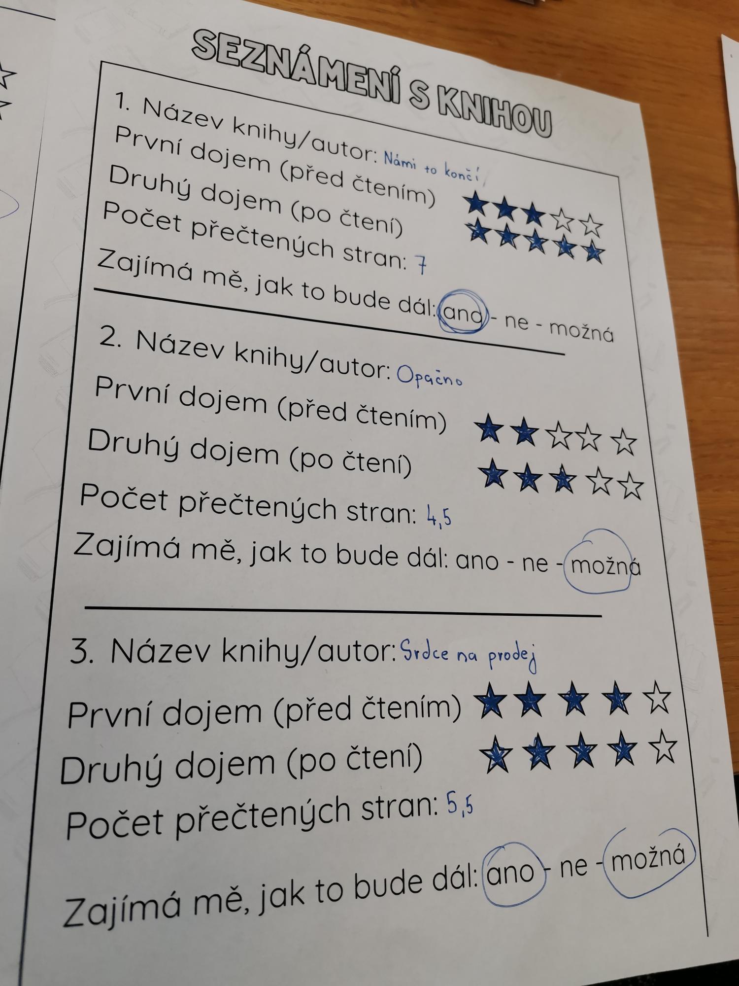 Minulý týden si navíc žáci tercie vyzkoušeli zajímavou aktivitu, kdy se vždy na část hodiny začetli do knihy svého spolužáka. Knihu hodnotili před čtením i po něm a sami zjistili, že není dobré spoléhat jen na první dojem.