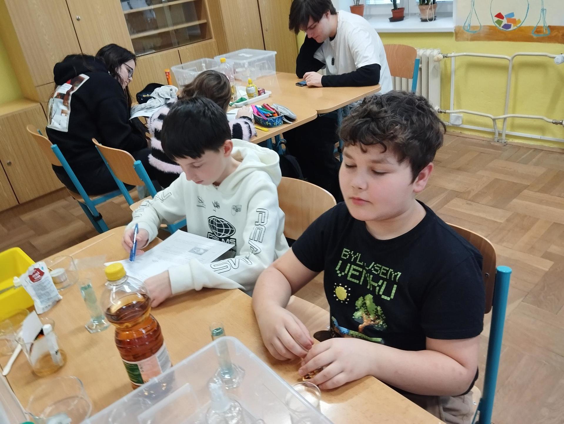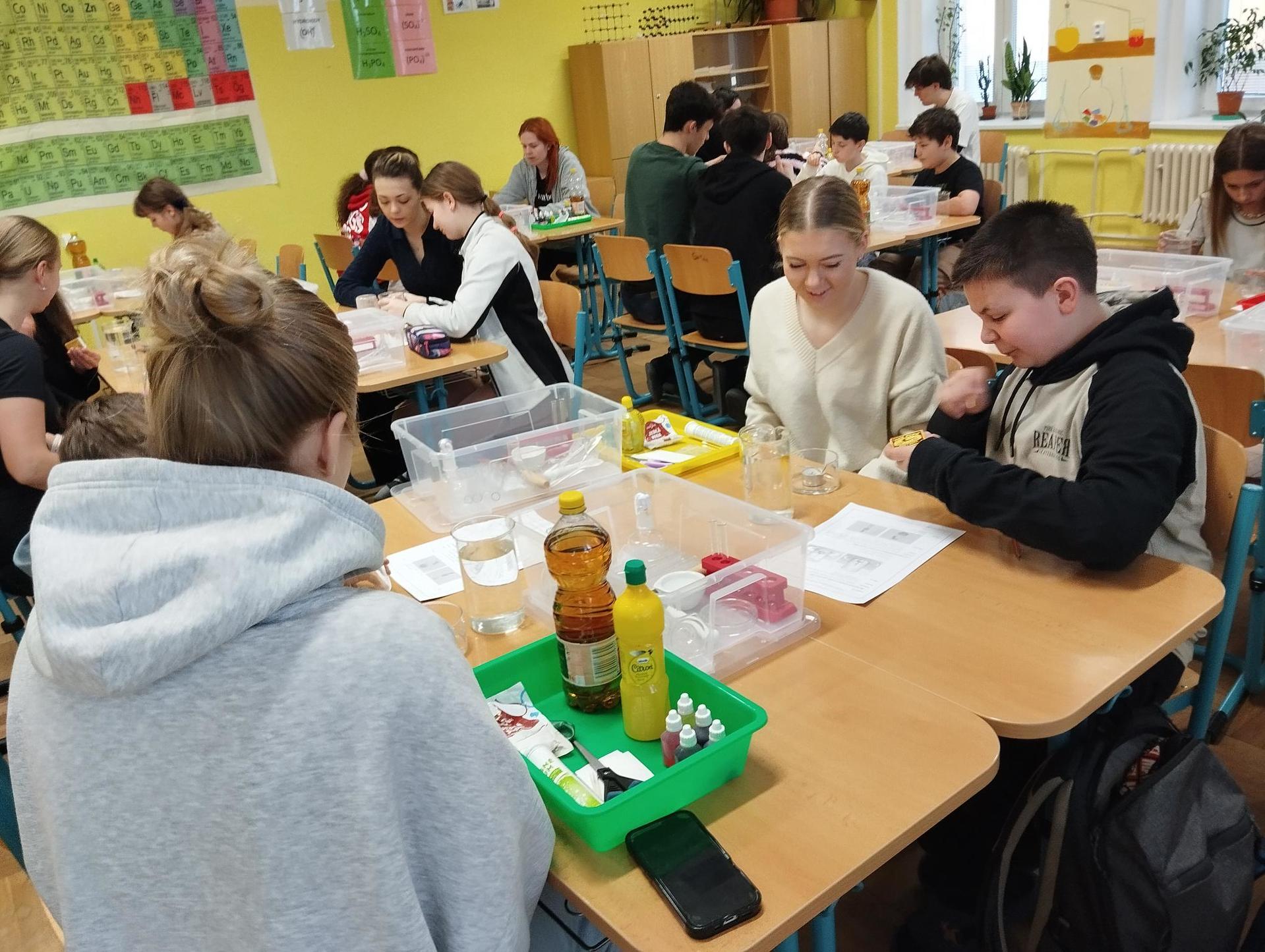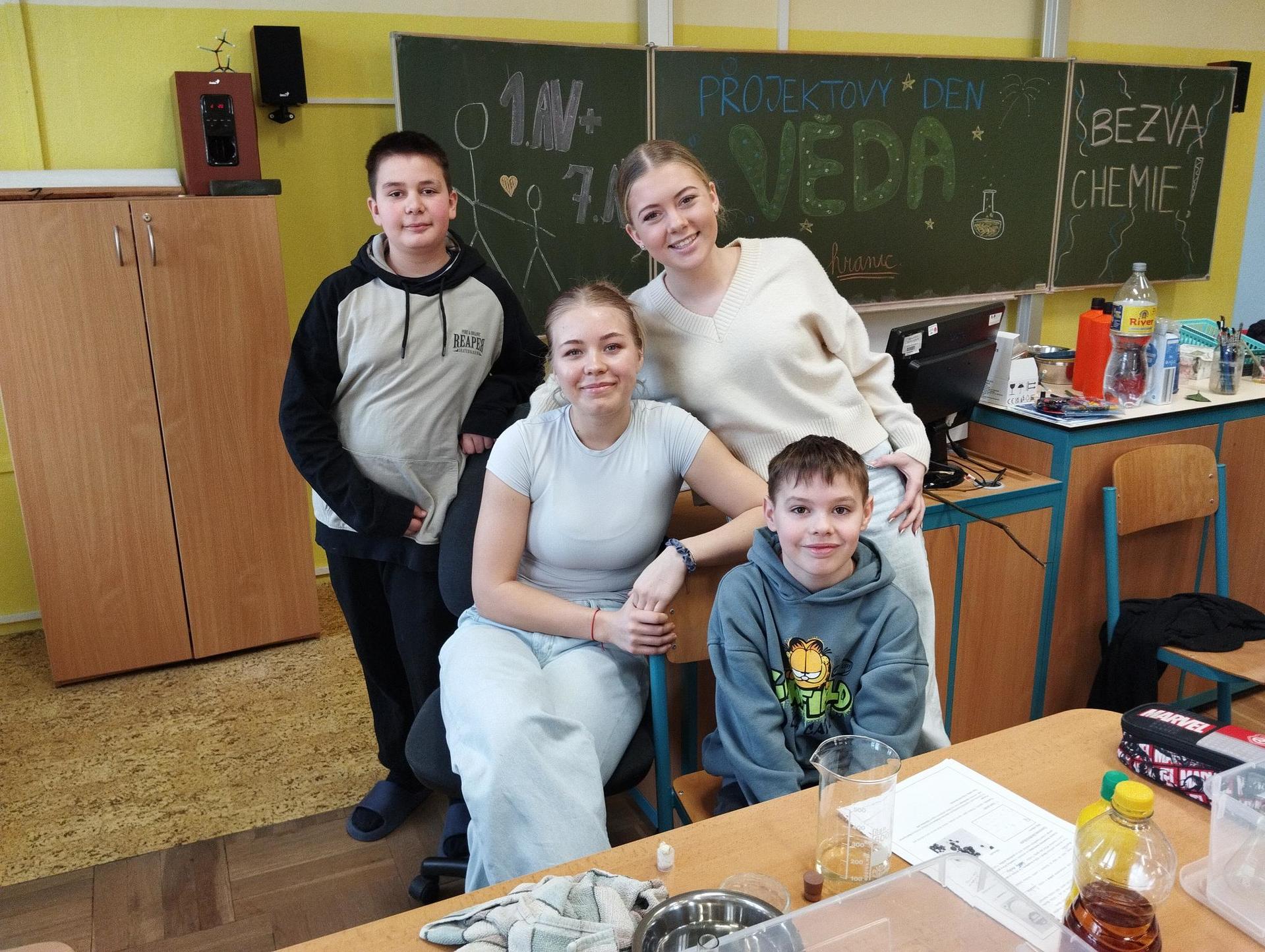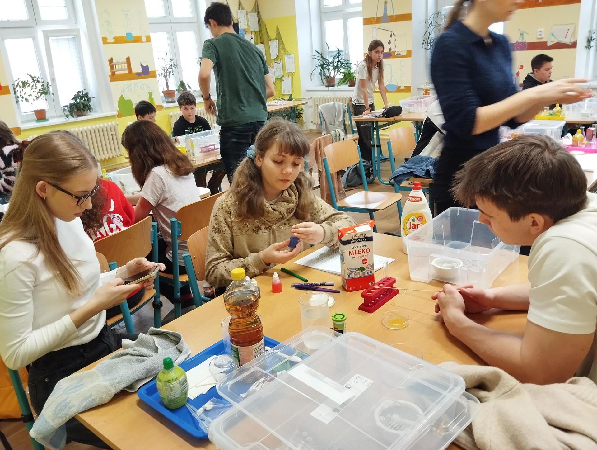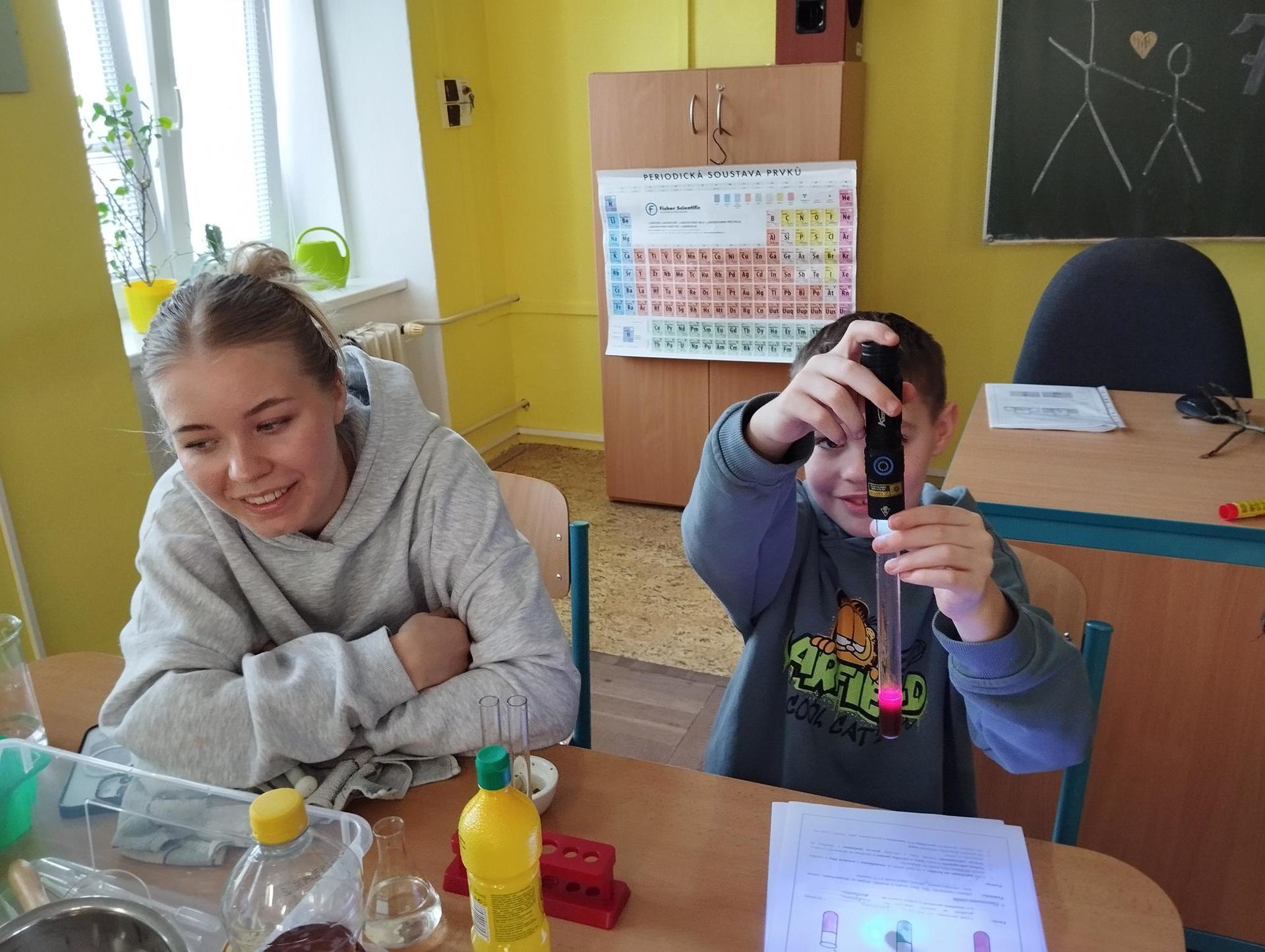 Žáci primy prováděli jednoduché experimenty pod vedením žáků septimy. Společná činnost mladších a starších žáků přinesla nová přátelství, pocit podpory, jistoty a sounáležitosti. Vytvoření příjemné atmosféry a kamarádského přístupu mezi žáky pozvedly projektový den na nezapomenutelný zážitek všech zúčastněných. Děti pracovaly s nově pořízenými laboratorními soupravami, které byly sestaveny pro účely práce s větším počtem žáků v učebně chemie či jakékoliv jiné třídě. A co všechno během projektového dne žáci zvládli? Dokázali přítomnost kyslíku, i když není vidět, nafoukli balonek bez použití vlastního dechu, přesvědčili se, že oxid uhličitý hasí plamen, zjišťovali složení barviv fixů pomocí chromatografie na papíře a křídě, seznámili se s procesem difúze, vyrobili mléčnou duhu, použili výluh z červeného zelí jako přírodní indikátor, pozorovali fluorescenci rostlin, dokazovali přítomnost škrobu v bramborách a rýži, pozorovali škrobová zrna pod mikroskopem a rozluštili tajné písmo. Dále pak pracovali s mikrokapkovacími destičkami, v nichž vytvořili z barevných roztoků obrázek, vyrobili těžišťáka, kterého postavili nejen na různá místa učebny, ale také na rozmanité části svého těla. V části věnované elektřině žáci zapojovali jednoduché elektrické obvody. Pomocí ampérmetru měřili elektrický proud a pomocí voltmetru napětí na jednotlivých částech obvodu. Se stavebnicemi elektroniky sestavovali různé varianty zapojení a ověřovali si, jak se obvod chová při změnách podmínek. Zajímavou částí bylo také zkoumání vlastností diody – žáci si prakticky ověřili, že dioda propouští proud pouze jedním směrem. Další část projektového dne byla zaměřena na optiku. Pomocí spojné čočky žáci hledali obraz předmětu a určovali ohniskovou vzdálenost spojky. Praktickým měřením si tak upevnili poznatky o vzniku skutečného obrazu a jeho vlastnostech. Cíl projektového dne byl naplněn ve všech ohledech, nešlo pouze o experimenty, ale především o spolupráci, vzájemnou podporu a sdílení zkušeností. Spolupráce žáků bude pokračovat nadále, výsledkem budou další projektové dny a Chemická show, kde žáci zúročí své vědomosti a dovednosti a přesvědčí tak rodiče a veřejnost, že věda je zábava!