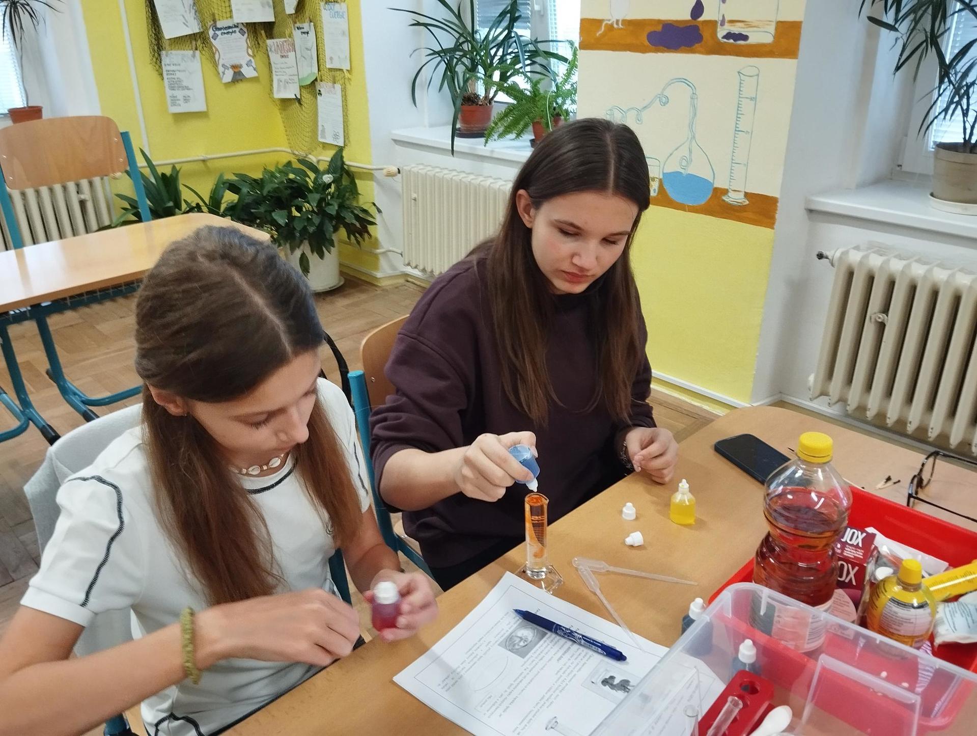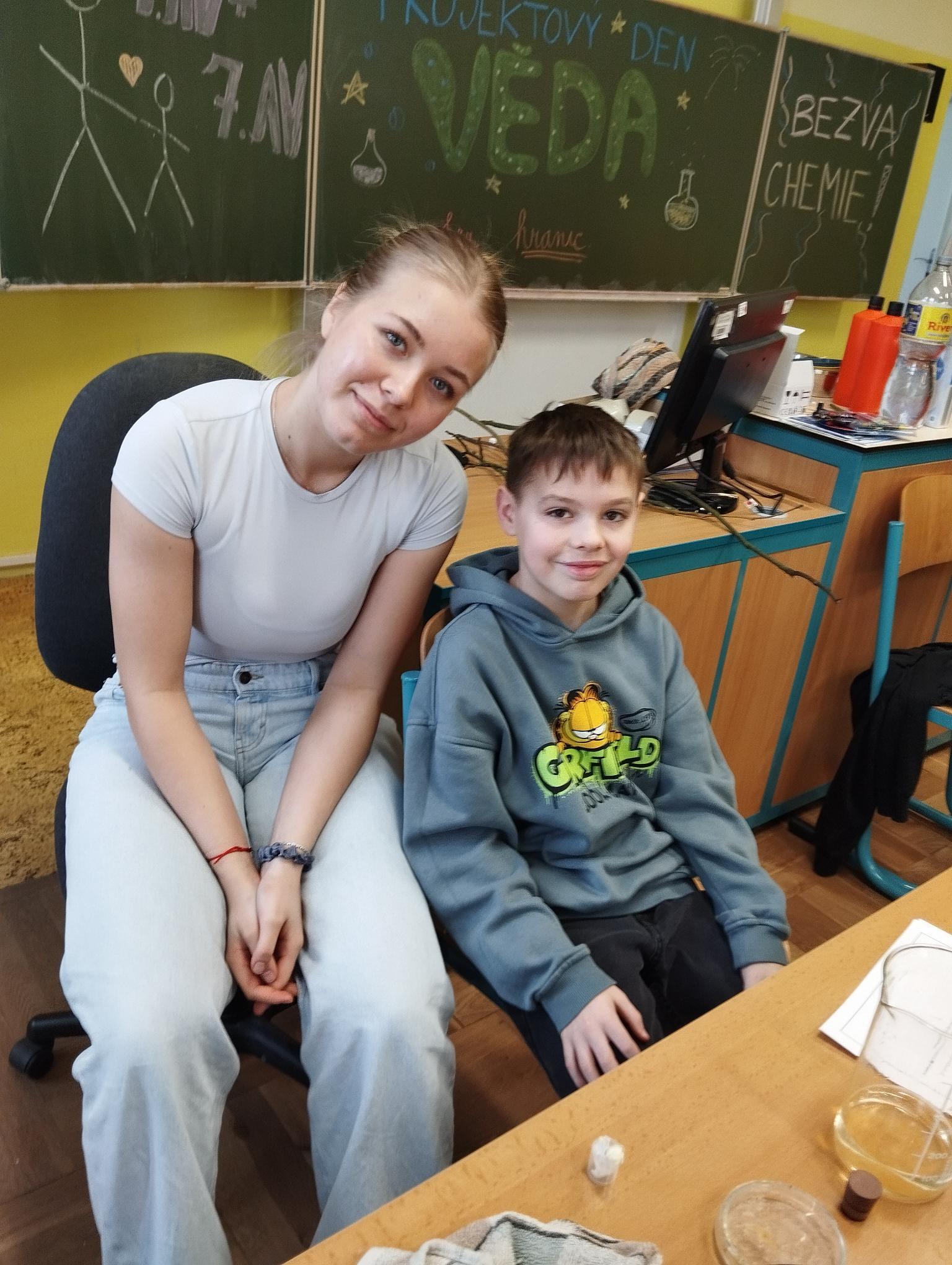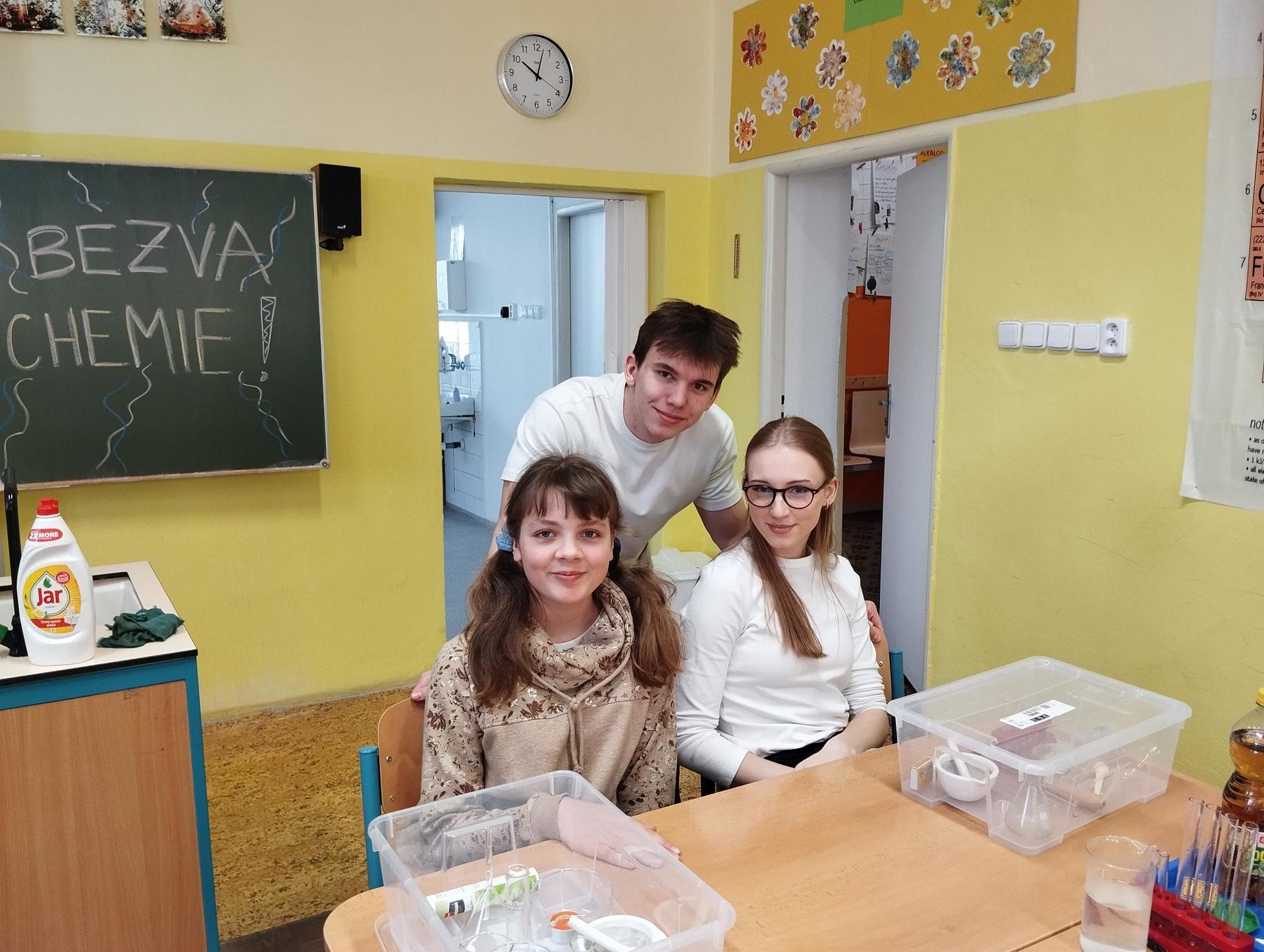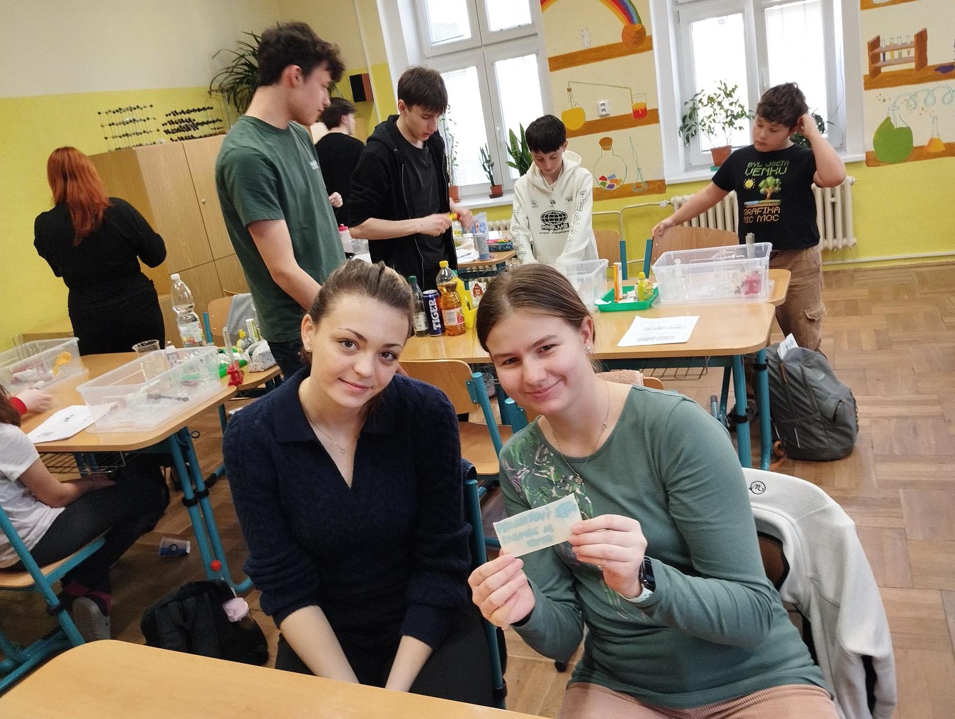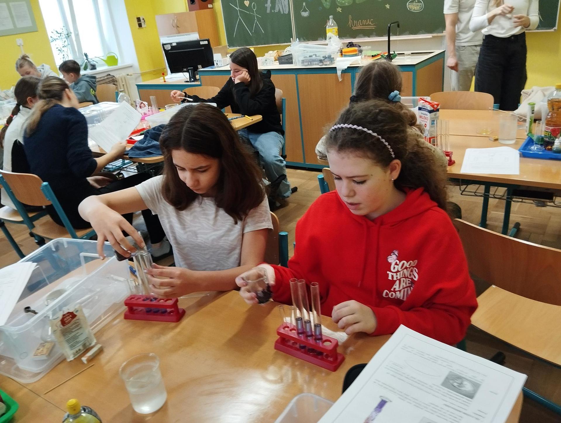 Žáci primy prováděli jednoduché experimenty pod vedením žáků septimy. Společná činnost mladších a starších žáků přinesla nová přátelství, pocit podpory, jistoty a sounáležitosti. Vytvoření příjemné atmosféry a kamarádského přístupu mezi žáky pozvedly projektový den na nezapomenutelný zážitek všech zúčastněných. Děti pracovaly s nově pořízenými laboratorními soupravami, které byly sestaveny pro účely práce s větším počtem žáků v učebně chemie či jakékoliv jiné třídě. A co všechno během projektového dne žáci zvládli? Dokázali přítomnost kyslíku, i když není vidět, nafoukli balonek bez použití vlastního dechu, přesvědčili se, že oxid uhličitý hasí plamen, zjišťovali složení barviv fixů pomocí chromatografie na papíře a křídě, seznámili se s procesem difúze, vyrobili mléčnou duhu, použili výluh z červeného zelí jako přírodní indikátor, pozorovali fluorescenci rostlin, dokazovali přítomnost škrobu v bramborách a rýži, pozorovali škrobová zrna pod mikroskopem a rozluštili tajné písmo. Dále pak pracovali s mikrokapkovacími destičkami, v nichž vytvořili z barevných roztoků obrázek, vyrobili těžišťáka, kterého postavili nejen na různá místa učebny, ale také na rozmanité části svého těla. V části věnované elektřině žáci zapojovali jednoduché elektrické obvody. Pomocí ampérmetru měřili elektrický proud a pomocí voltmetru napětí na jednotlivých částech obvodu. Se stavebnicemi elektroniky sestavovali různé varianty zapojení a ověřovali si, jak se obvod chová při změnách podmínek. Zajímavou částí bylo také zkoumání vlastností diody – žáci si prakticky ověřili, že dioda propouští proud pouze jedním směrem. Další část projektového dne byla zaměřena na optiku. Pomocí spojné čočky žáci hledali obraz předmětu a určovali ohniskovou vzdálenost spojky. Praktickým měřením si tak upevnili poznatky o vzniku skutečného obrazu a jeho vlastnostech. Cíl projektového dne byl naplněn ve všech ohledech, nešlo pouze o experimenty, ale především o spolupráci, vzájemnou podporu a sdílení zkušeností. Spolupráce žáků bude pokračovat nadále, výsledkem budou další projektové dny a Chemická show, kde žáci zúročí své vědomosti a dovednosti a přesvědčí tak rodiče a veřejnost, že věda je zábava!