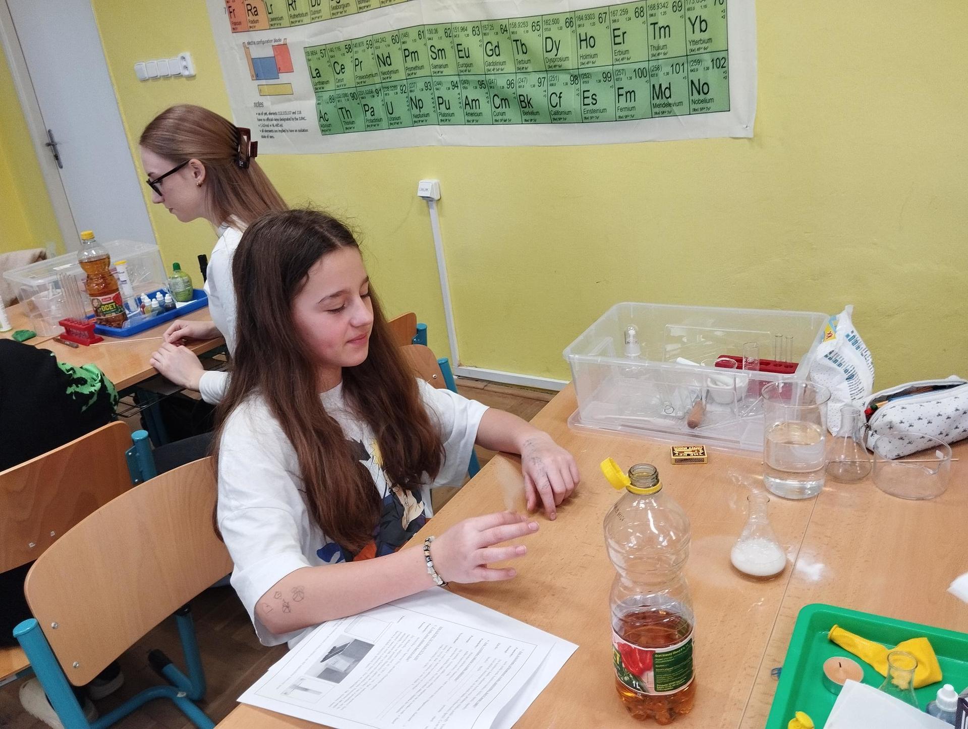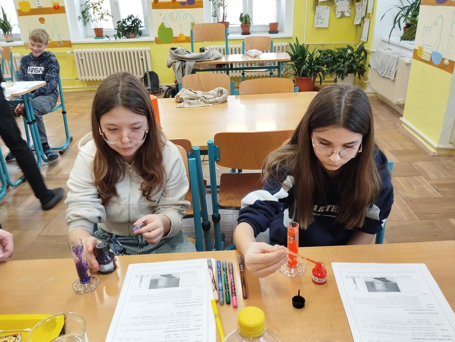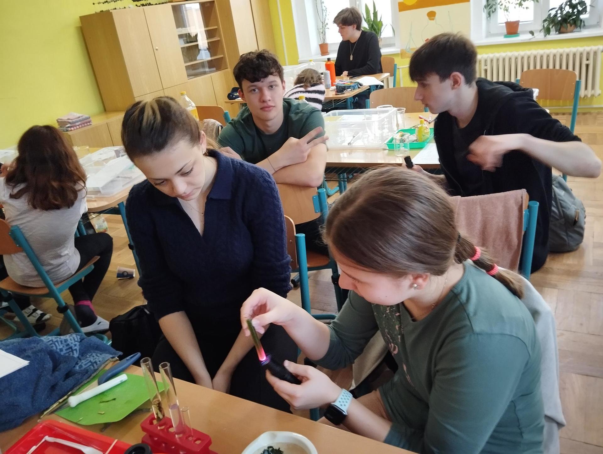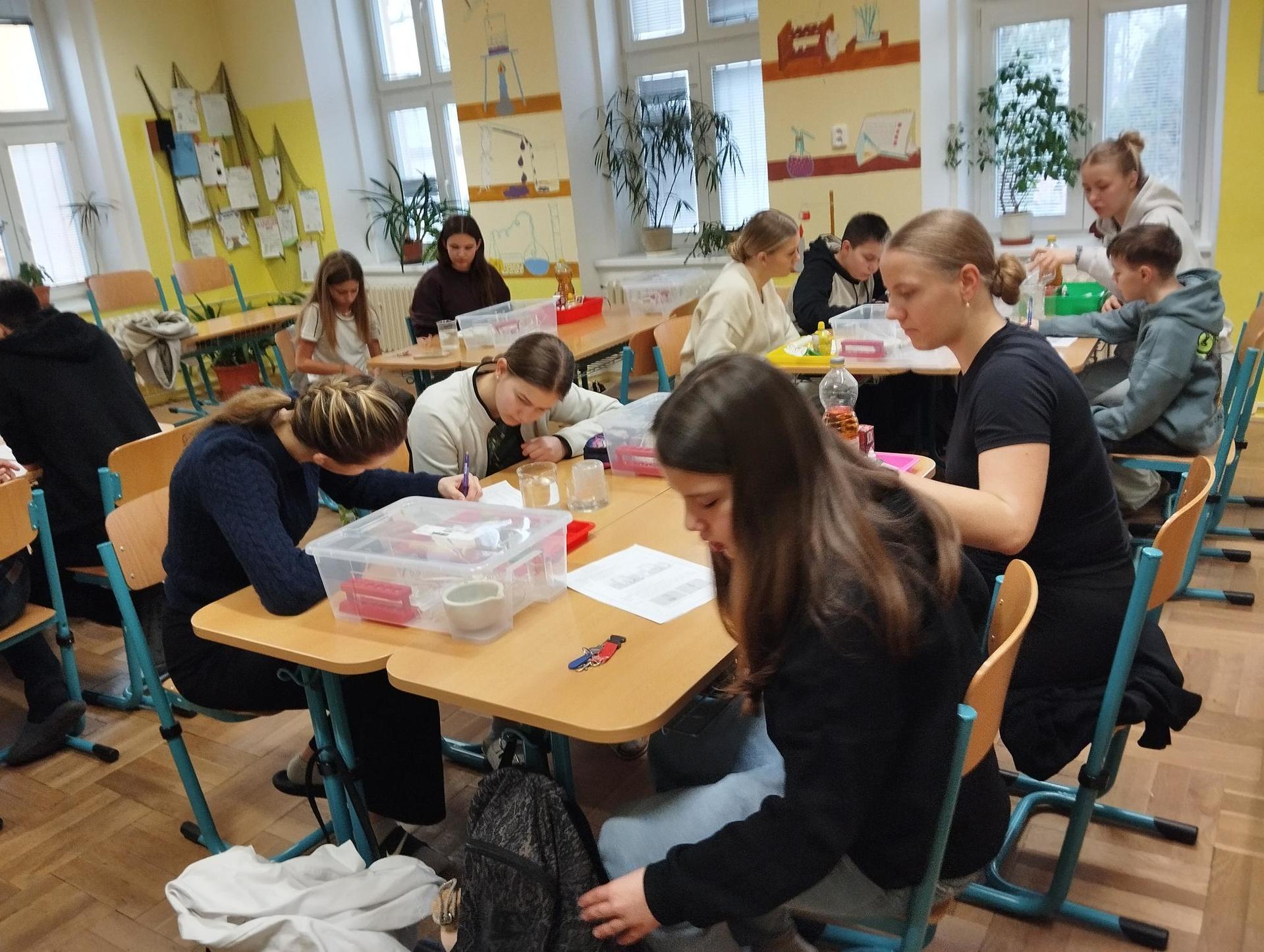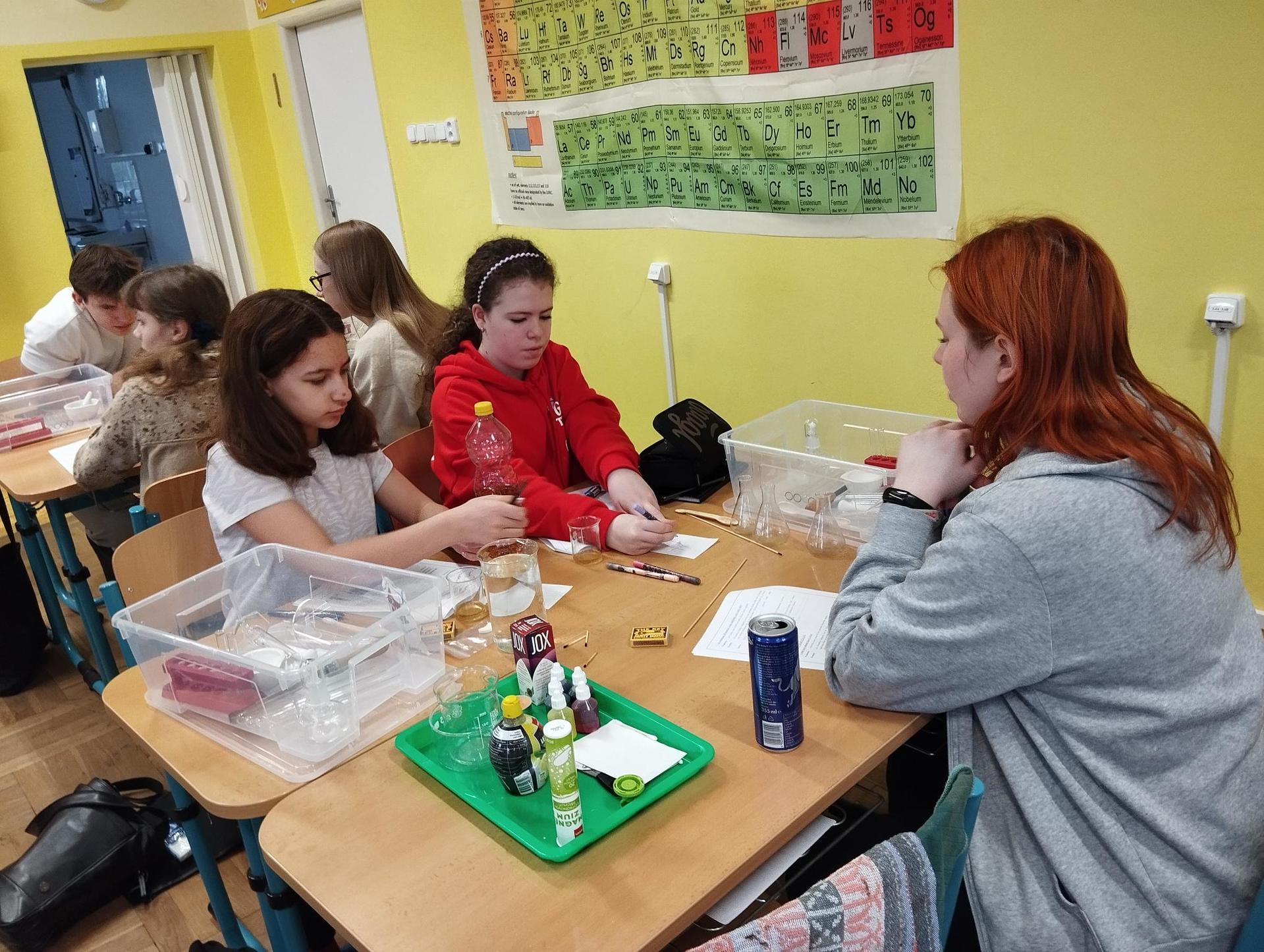 Žáci primy prováděli jednoduché experimenty pod vedením žáků septimy. Společná činnost mladších a starších žáků přinesla nová přátelství, pocit podpory, jistoty a sounáležitosti. Vytvoření příjemné atmosféry a kamarádského přístupu mezi žáky pozvedly projektový den na nezapomenutelný zážitek všech zúčastněných. Děti pracovaly s nově pořízenými laboratorními soupravami, které byly sestaveny pro účely práce s větším počtem žáků v učebně chemie či jakékoliv jiné třídě. A co všechno během projektového dne žáci zvládli? Dokázali přítomnost kyslíku, i když není vidět, nafoukli balonek bez použití vlastního dechu, přesvědčili se, že oxid uhličitý hasí plamen, zjišťovali složení barviv fixů pomocí chromatografie na papíře a křídě, seznámili se s procesem difúze, vyrobili mléčnou duhu, použili výluh z červeného zelí jako přírodní indikátor, pozorovali fluorescenci rostlin, dokazovali přítomnost škrobu v bramborách a rýži, pozorovali škrobová zrna pod mikroskopem a rozluštili tajné písmo. Dále pak pracovali s mikrokapkovacími destičkami, v nichž vytvořili z barevných roztoků obrázek, vyrobili těžišťáka, kterého postavili nejen na různá místa učebny, ale také na rozmanité části svého těla. V části věnované elektřině žáci zapojovali jednoduché elektrické obvody. Pomocí ampérmetru měřili elektrický proud a pomocí voltmetru napětí na jednotlivých částech obvodu. Se stavebnicemi elektroniky sestavovali různé varianty zapojení a ověřovali si, jak se obvod chová při změnách podmínek. Zajímavou částí bylo také zkoumání vlastností diody – žáci si prakticky ověřili, že dioda propouští proud pouze jedním směrem. Další část projektového dne byla zaměřena na optiku. Pomocí spojné čočky žáci hledali obraz předmětu a určovali ohniskovou vzdálenost spojky. Praktickým měřením si tak upevnili poznatky o vzniku skutečného obrazu a jeho vlastnostech. Cíl projektového dne byl naplněn ve všech ohledech, nešlo pouze o experimenty, ale především o spolupráci, vzájemnou podporu a sdílení zkušeností. Spolupráce žáků bude pokračovat nadále, výsledkem budou další projektové dny a Chemická show, kde žáci zúročí své vědomosti a dovednosti a přesvědčí tak rodiče a veřejnost, že věda je zábava!