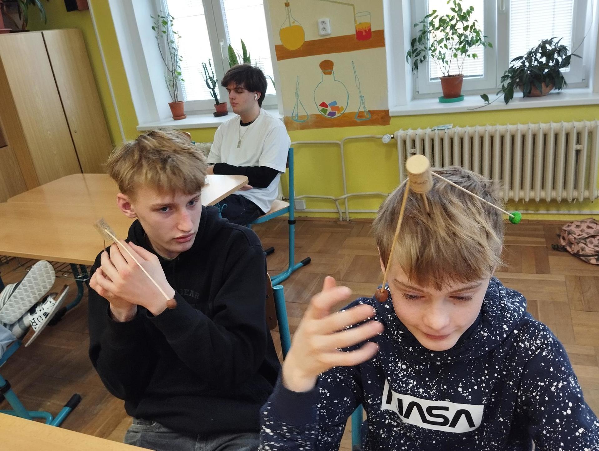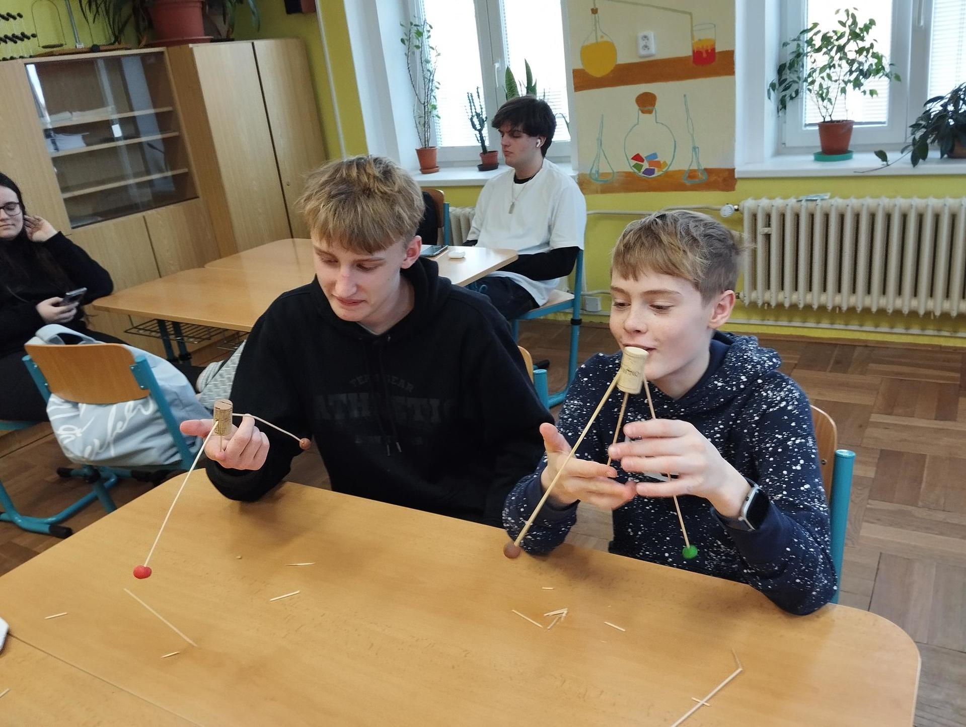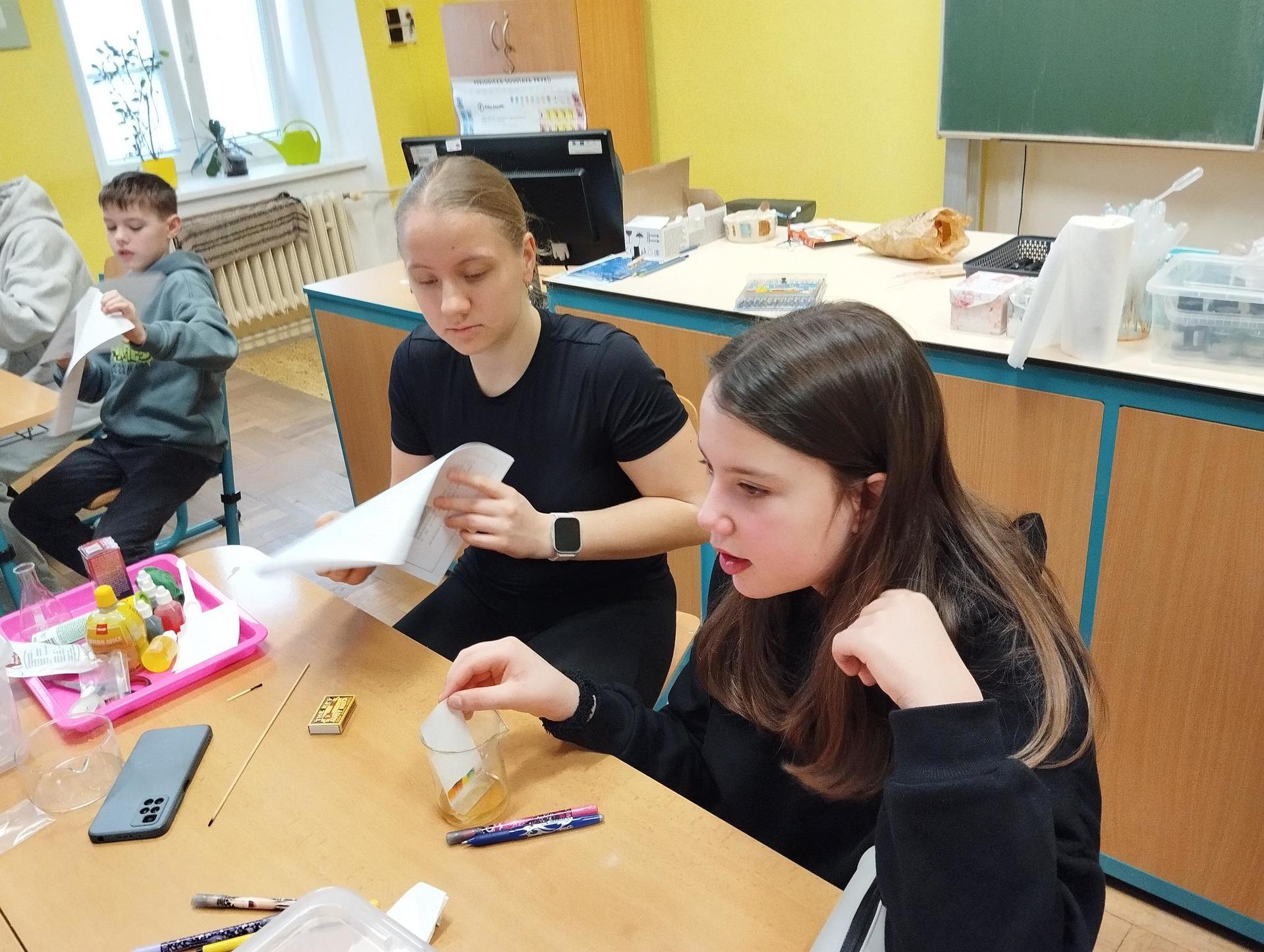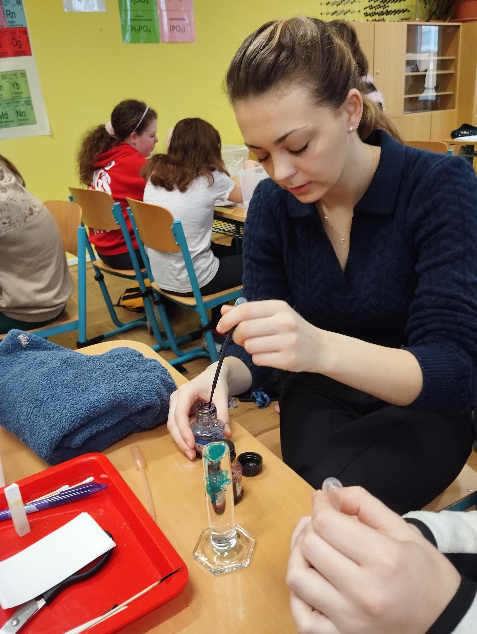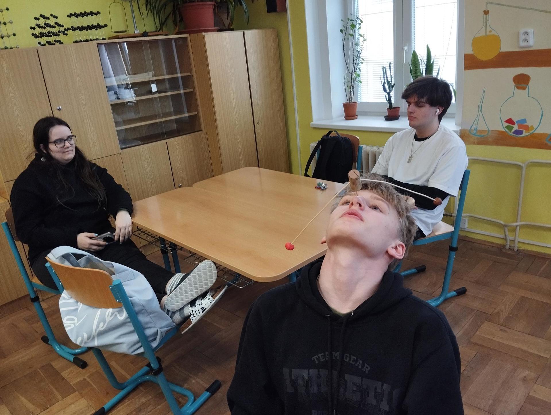 Žáci primy prováděli jednoduché experimenty pod vedením žáků septimy. Společná činnost mladších a starších žáků přinesla nová přátelství, pocit podpory, jistoty a sounáležitosti. Vytvoření příjemné atmosféry a kamarádského přístupu mezi žáky pozvedly projektový den na nezapomenutelný zážitek všech zúčastněných. Děti pracovaly s nově pořízenými laboratorními soupravami, které byly sestaveny pro účely práce s větším počtem žáků v učebně chemie či jakékoliv jiné třídě. A co všechno během projektového dne žáci zvládli? Dokázali přítomnost kyslíku, i když není vidět, nafoukli balonek bez použití vlastního dechu, přesvědčili se, že oxid uhličitý hasí plamen, zjišťovali složení barviv fixů pomocí chromatografie na papíře a křídě, seznámili se s procesem difúze, vyrobili mléčnou duhu, použili výluh z červeného zelí jako přírodní indikátor, pozorovali fluorescenci rostlin, dokazovali přítomnost škrobu v bramborách a rýži, pozorovali škrobová zrna pod mikroskopem a rozluštili tajné písmo. Dále pak pracovali s mikrokapkovacími destičkami, v nichž vytvořili z barevných roztoků obrázek, vyrobili těžišťáka, kterého postavili nejen na různá místa učebny, ale také na rozmanité části svého těla. V části věnované elektřině žáci zapojovali jednoduché elektrické obvody. Pomocí ampérmetru měřili elektrický proud a pomocí voltmetru napětí na jednotlivých částech obvodu. Se stavebnicemi elektroniky sestavovali různé varianty zapojení a ověřovali si, jak se obvod chová při změnách podmínek. Zajímavou částí bylo také zkoumání vlastností diody – žáci si prakticky ověřili, že dioda propouští proud pouze jedním směrem. Další část projektového dne byla zaměřena na optiku. Pomocí spojné čočky žáci hledali obraz předmětu a určovali ohniskovou vzdálenost spojky. Praktickým měřením si tak upevnili poznatky o vzniku skutečného obrazu a jeho vlastnostech. Cíl projektového dne byl naplněn ve všech ohledech, nešlo pouze o experimenty, ale především o spolupráci, vzájemnou podporu a sdílení zkušeností. Spolupráce žáků bude pokračovat nadále, výsledkem budou další projektové dny a Chemická show, kde žáci zúročí své vědomosti a dovednosti a přesvědčí tak rodiče a veřejnost, že věda je zábava!