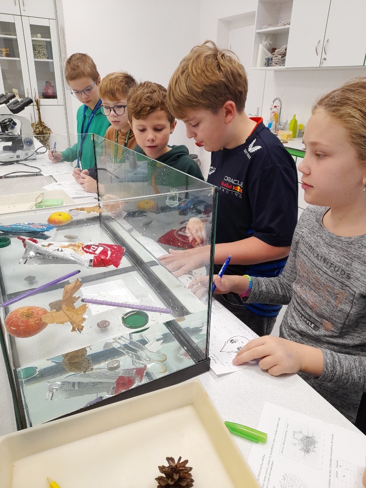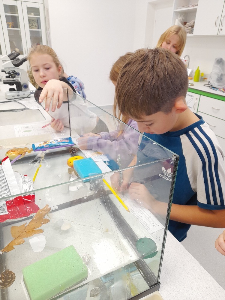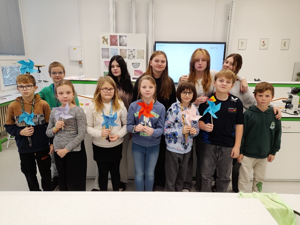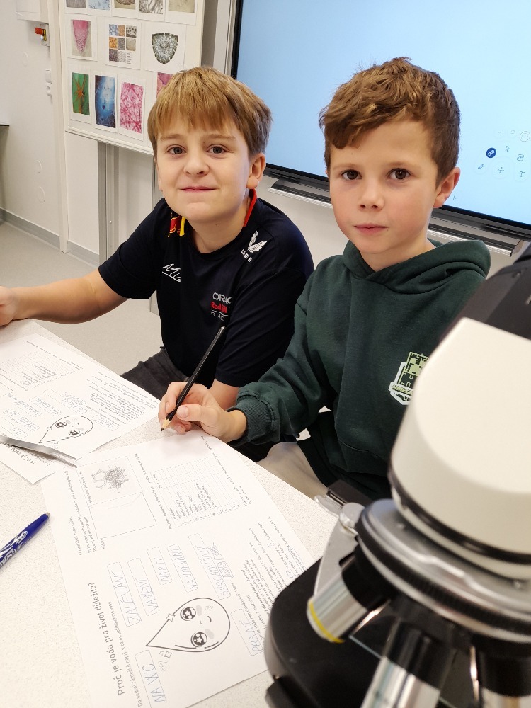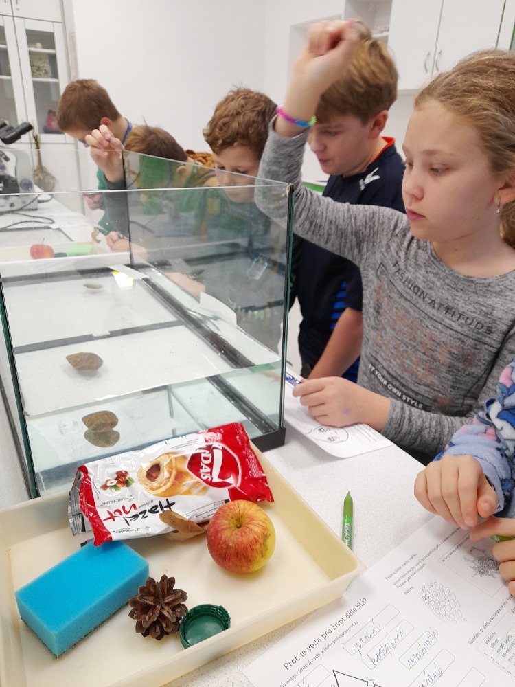 Na biologickém stanovišti se zamýšleli nad významem vody pro živé organismy. Vyzkoušeli si přípravu vodního preparátu mechu měříku, který následně pozorovali pod mikroskopem. U akvárií si ověřili, které předměty plavou a které klesnou ke dnu. Na závěr si každý vyrobil pěkný větrník z papíru, špendlíku, korálku, brčka a korku, který udělal radost a ochotně se roztáčel ve větru.