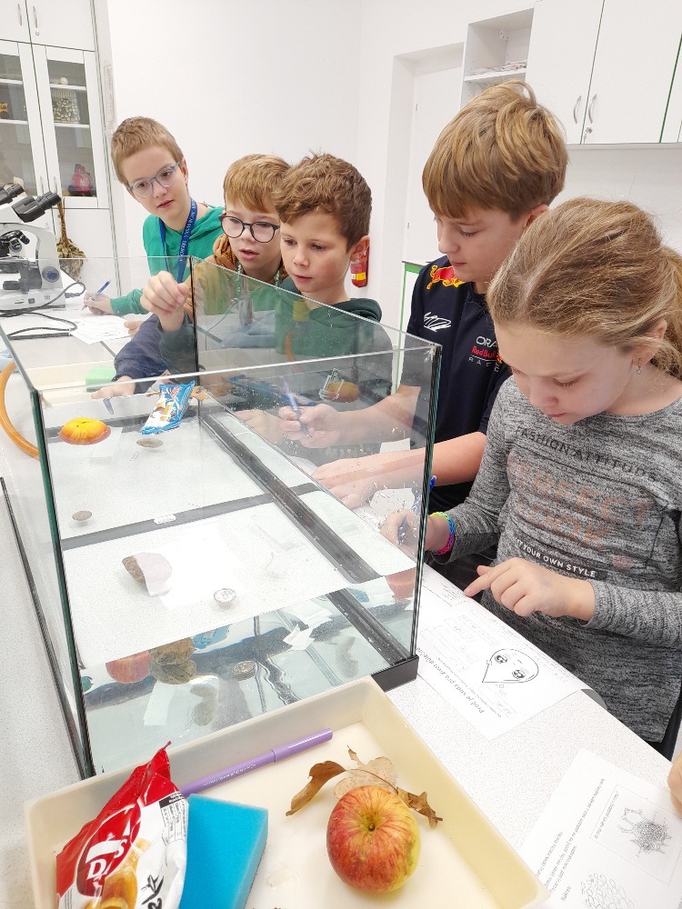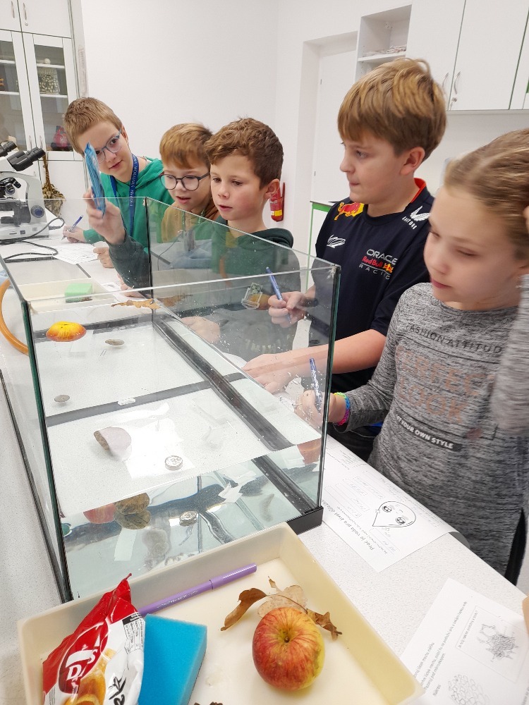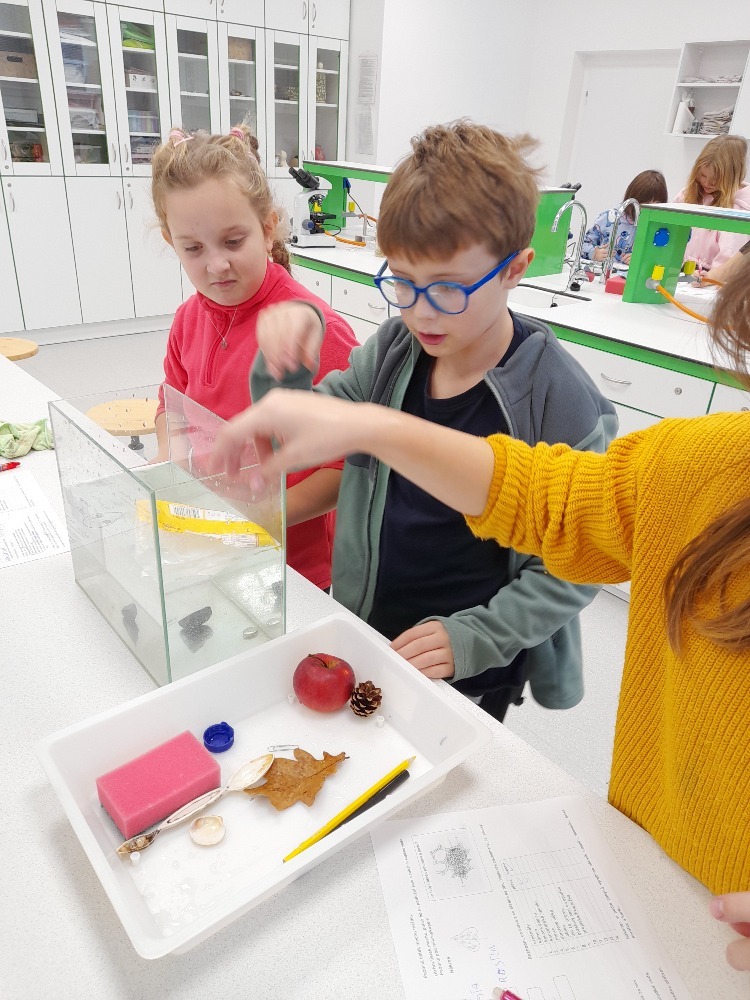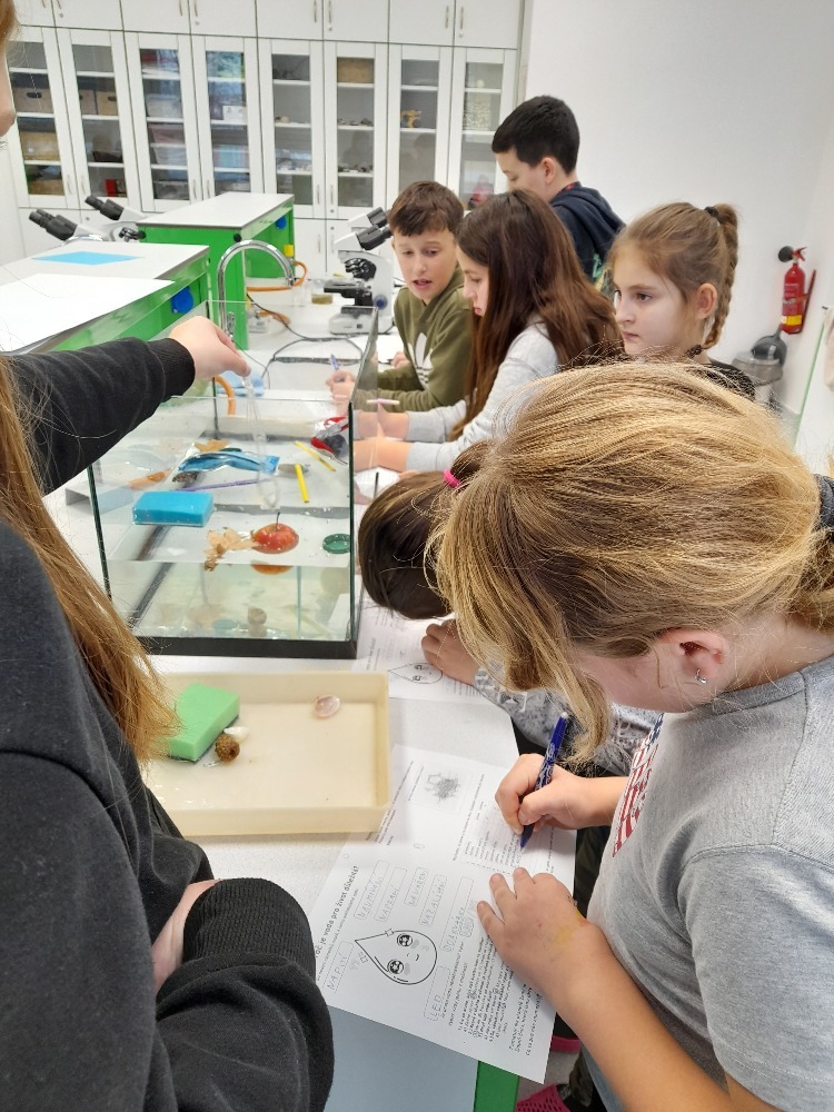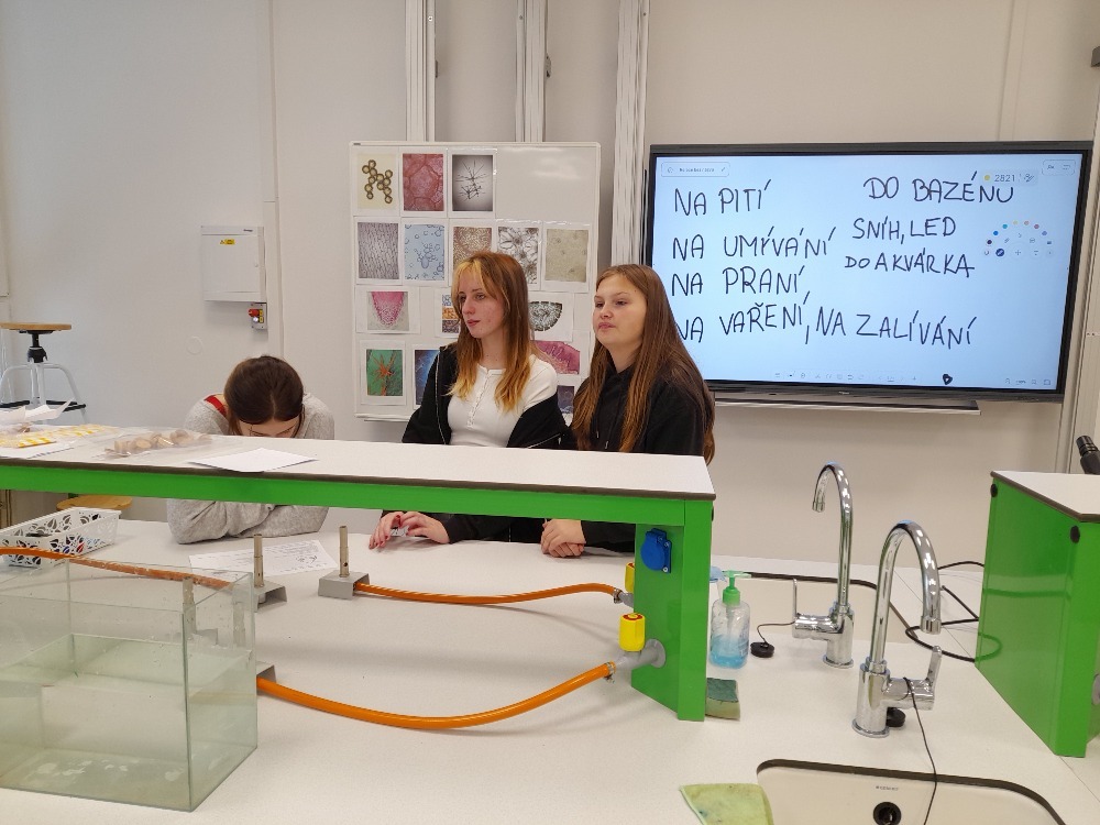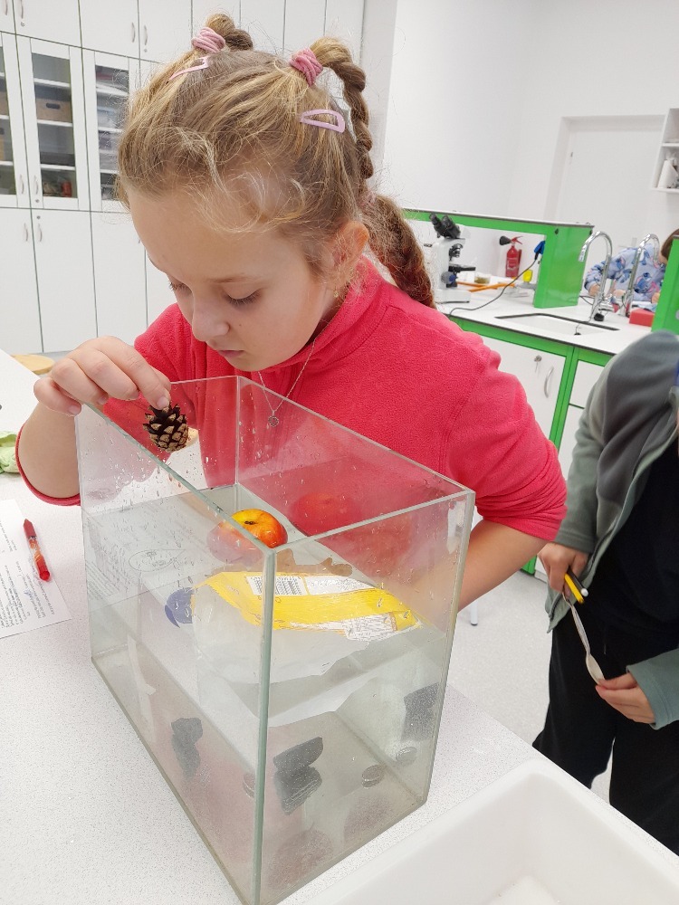Na biologickém stanovišti se zamýšleli nad významem vody pro živé organismy. Vyzkoušeli si přípravu vodního preparátu mechu měříku, který následně pozorovali pod mikroskopem. U akvárií si ověřili, které předměty plavou a které klesnou ke dnu. Na závěr si každý vyrobil pěkný větrník z papíru, špendlíku, korálku, brčka a korku, který udělal radost a ochotně se roztáčel ve větru.