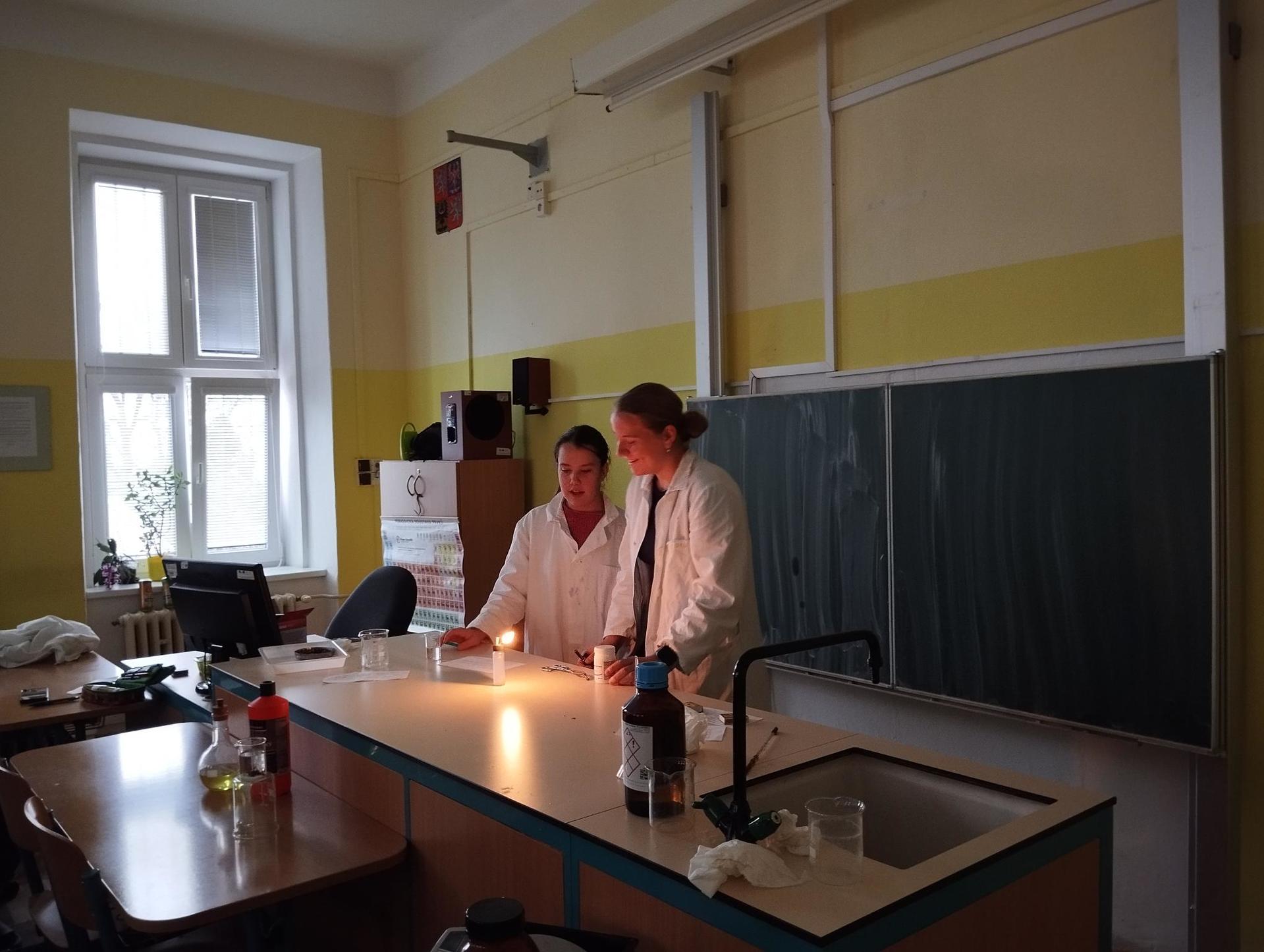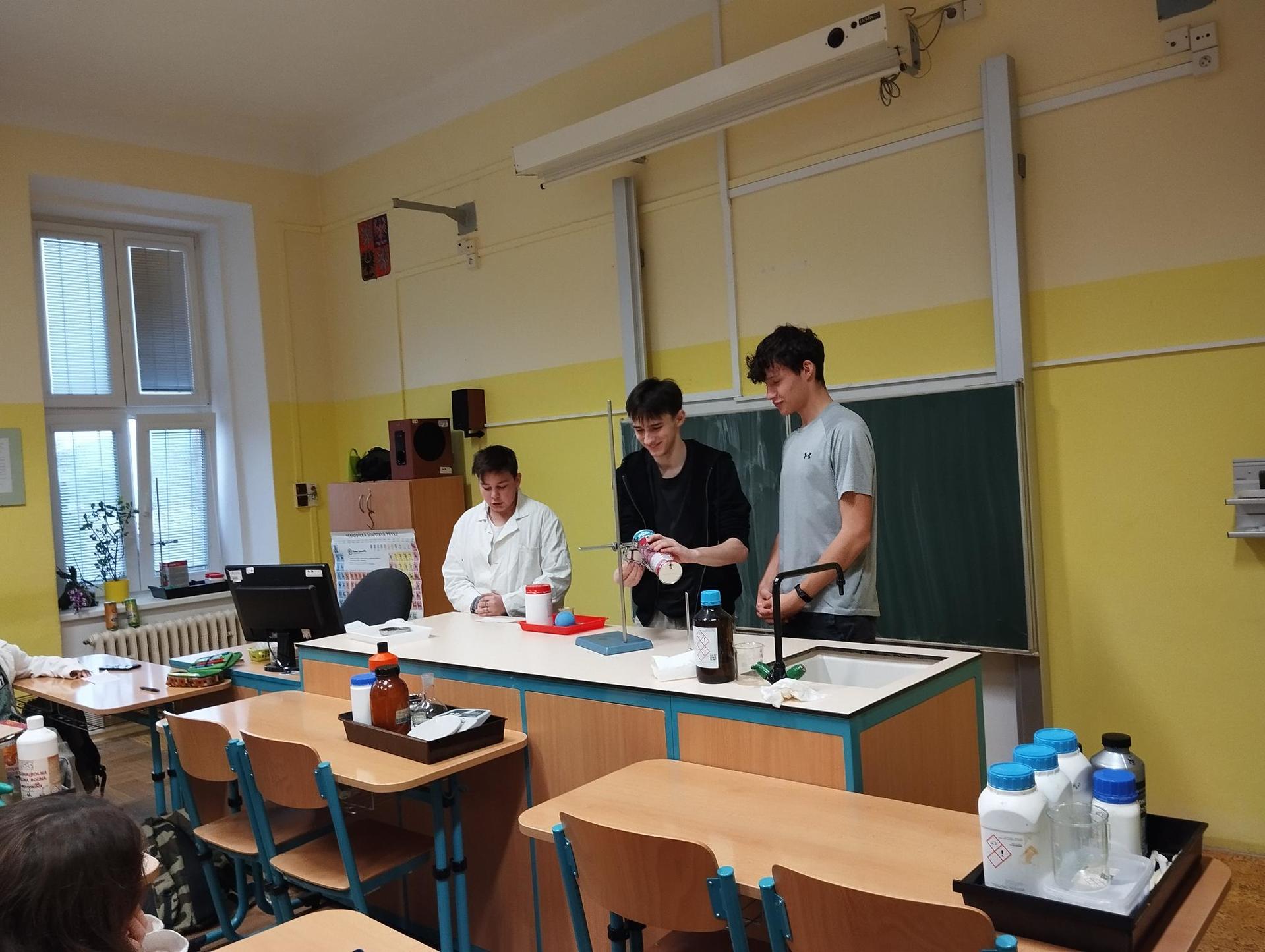 Žáci septimy připravili sérii atraktivních chemických a fyzikálních pokusů, které nejen předvedli, ale společně s nejmladšími studenty také realizovali. Každý septimán měl u sebe jednoho malého „parťáka“, kterému vysvětloval postup, společně diskutovali nad tím, co se v pokusech odehrává, a domlouvali se na komentáři k jednotlivým experimentům.